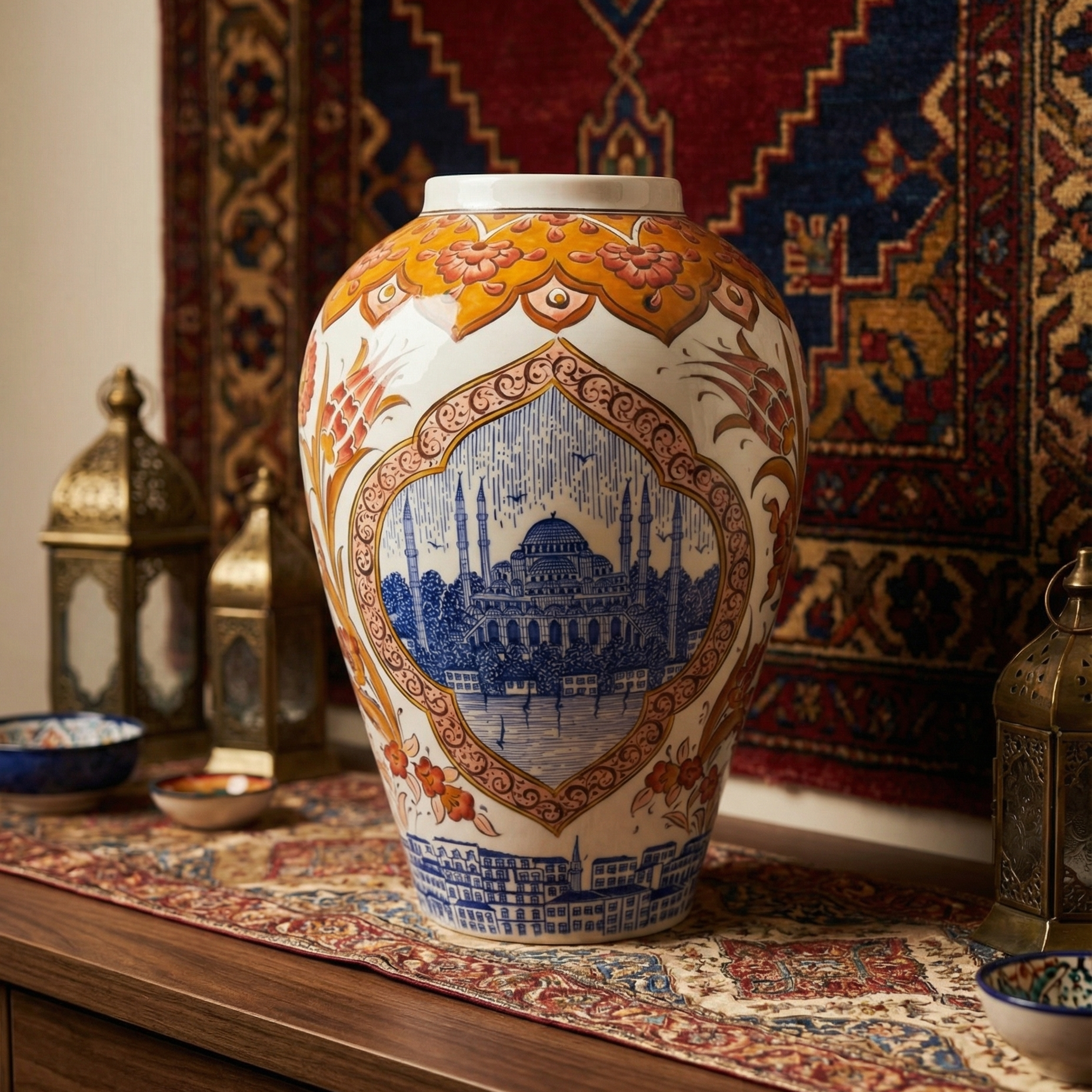 Evet. Klasik formu ve güçlü renk dengesi sayesinde hem geleneksel hem de modern mekânlarda rahatlıkla kullanılabilir.