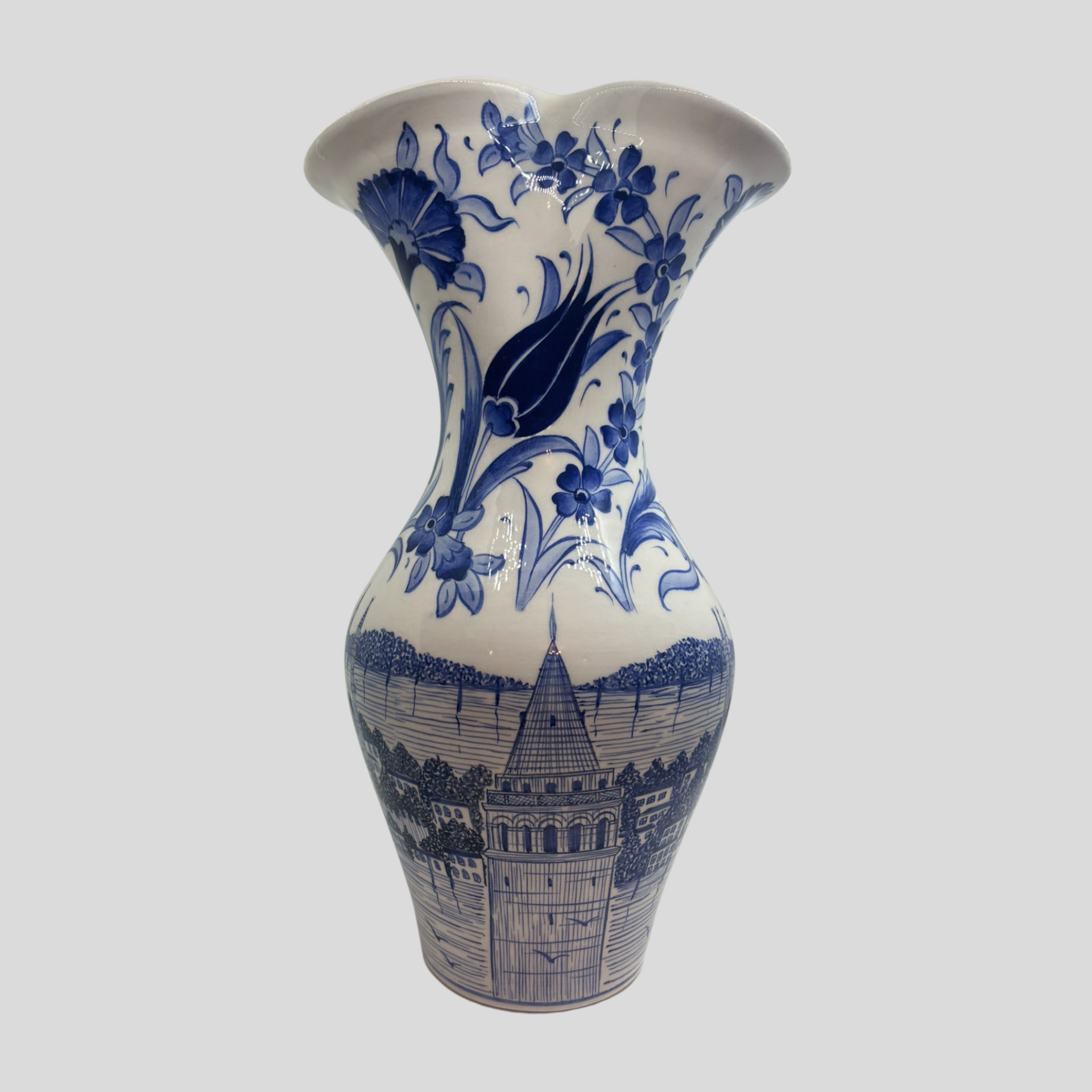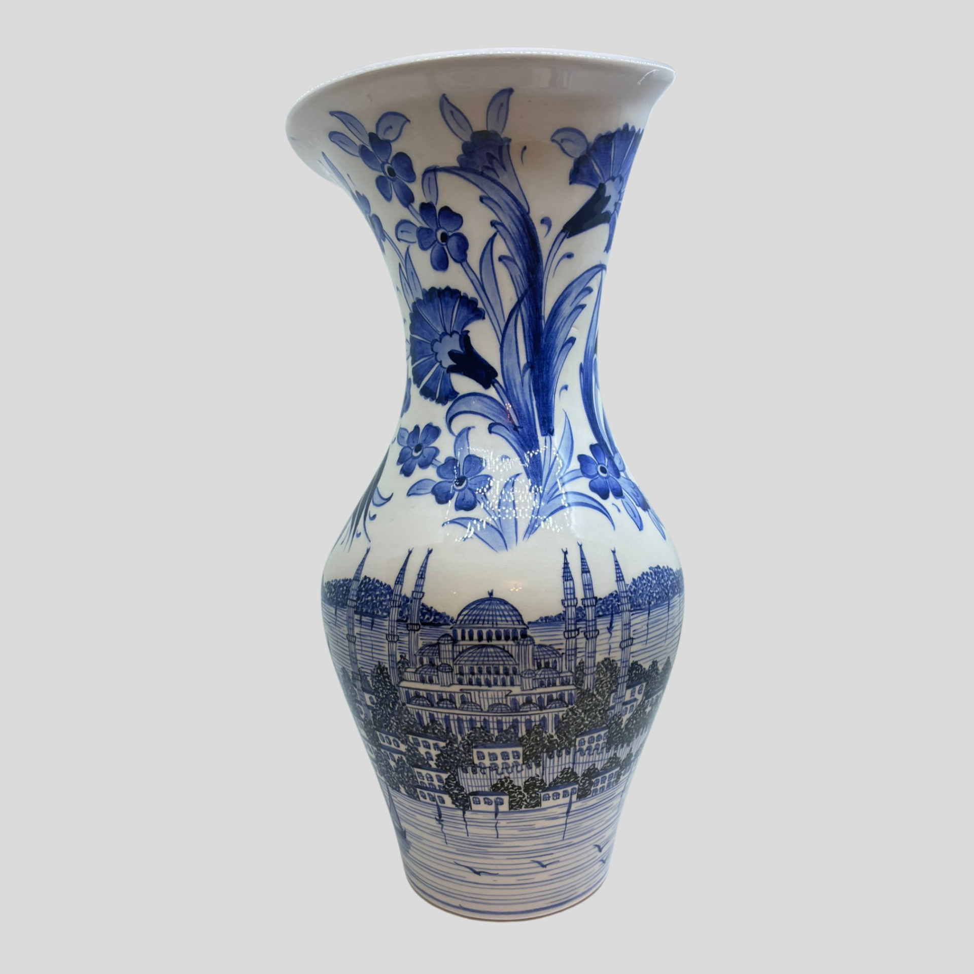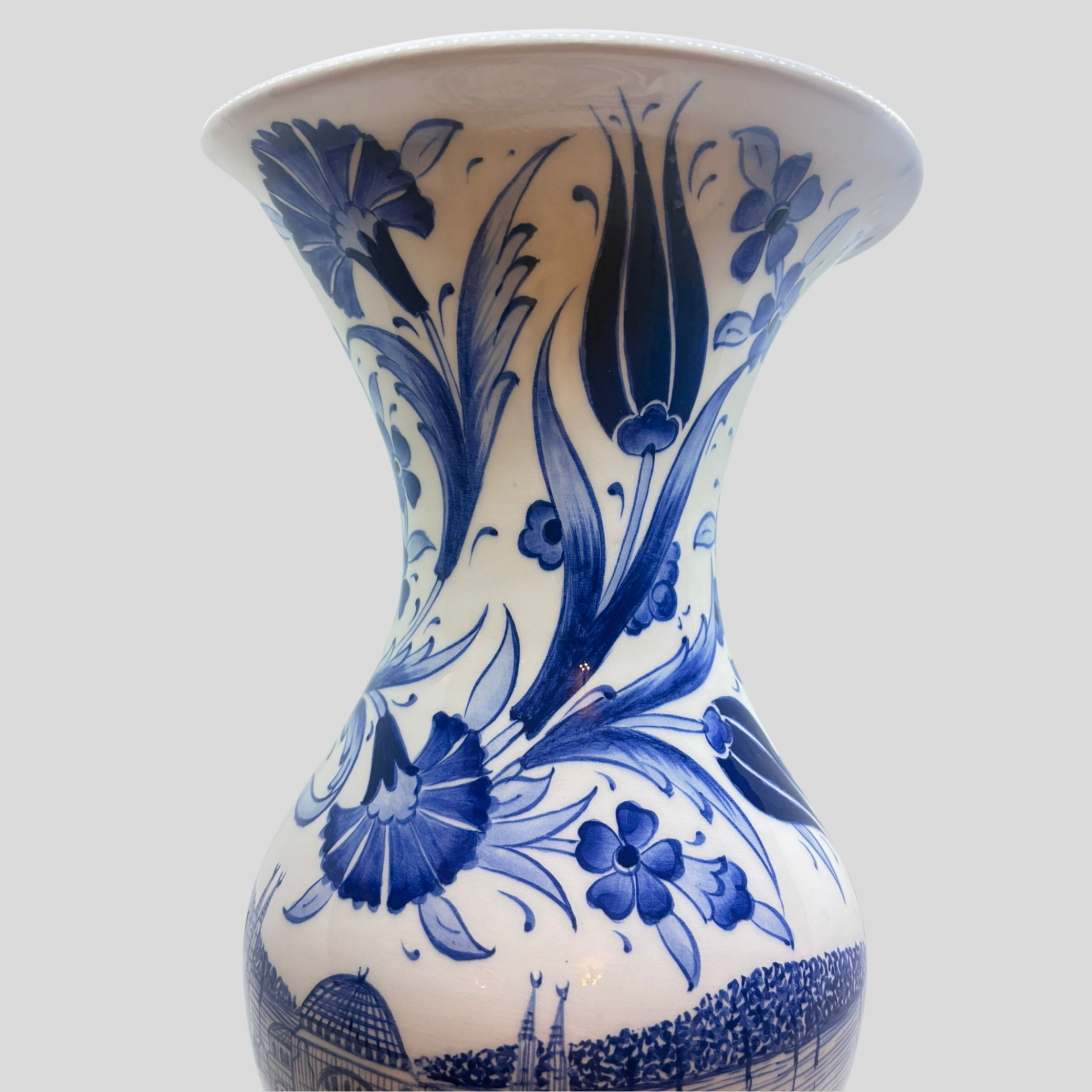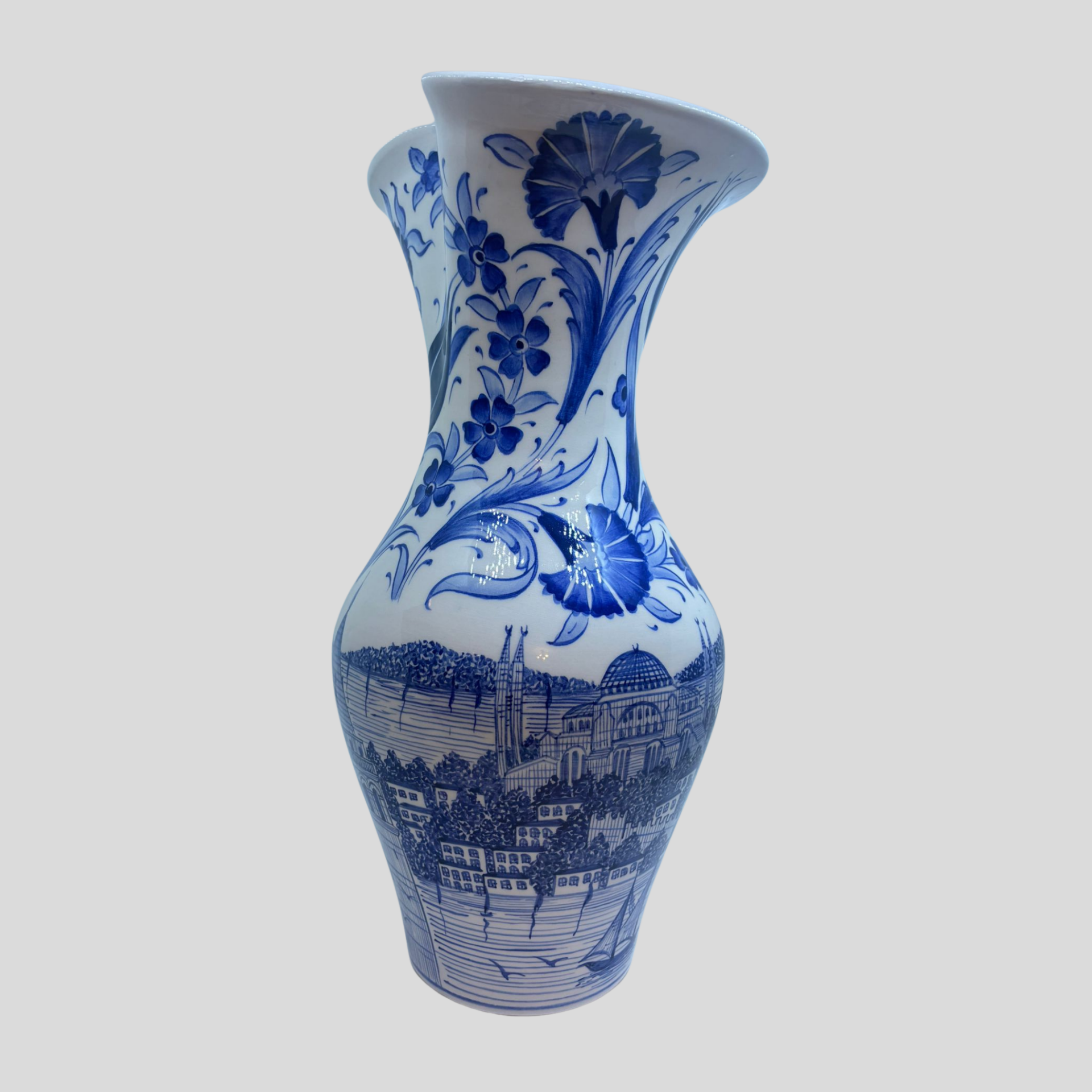 Üzerinde yer alan detaylı İstanbul çizimleri ve lale desenleri, ürüne yalnızca görsel bir güzellik değil; aynı zamanda kültürel bir derinlik kazandırır. İnce uzun formu sayesinde bulunduğu alanda dikkat çeken bir duruş sergilerken, mavi-beyaz çini estetiği mekâna ferahlık ve zarafet katar.