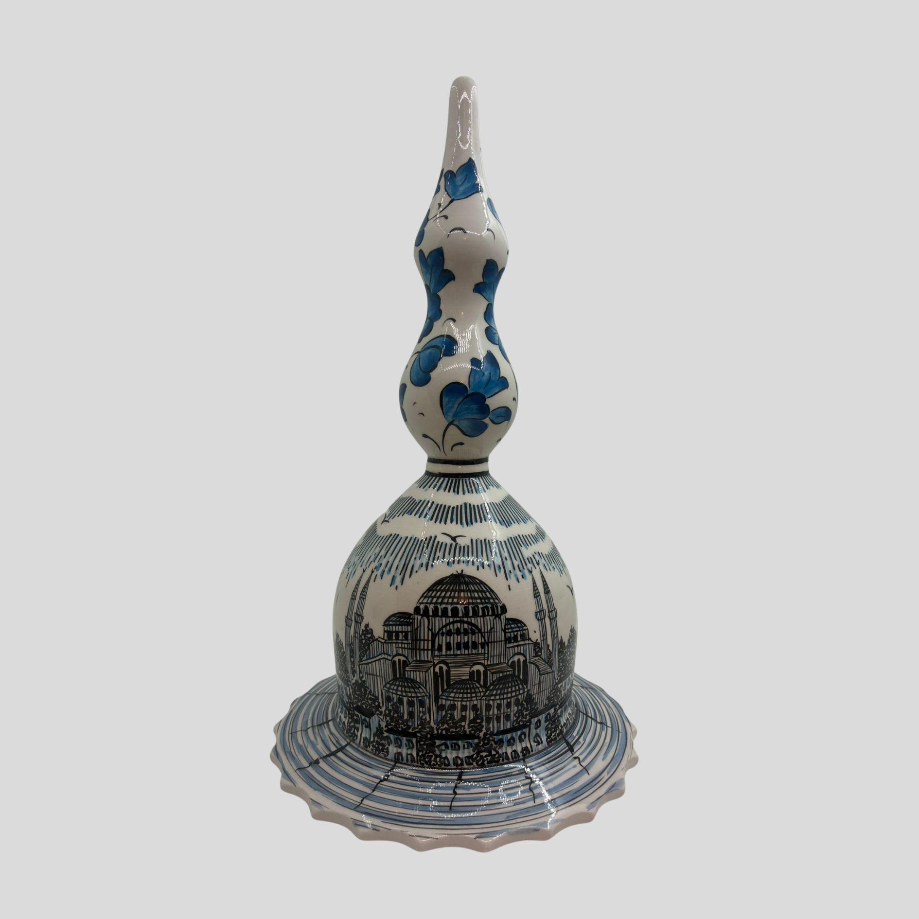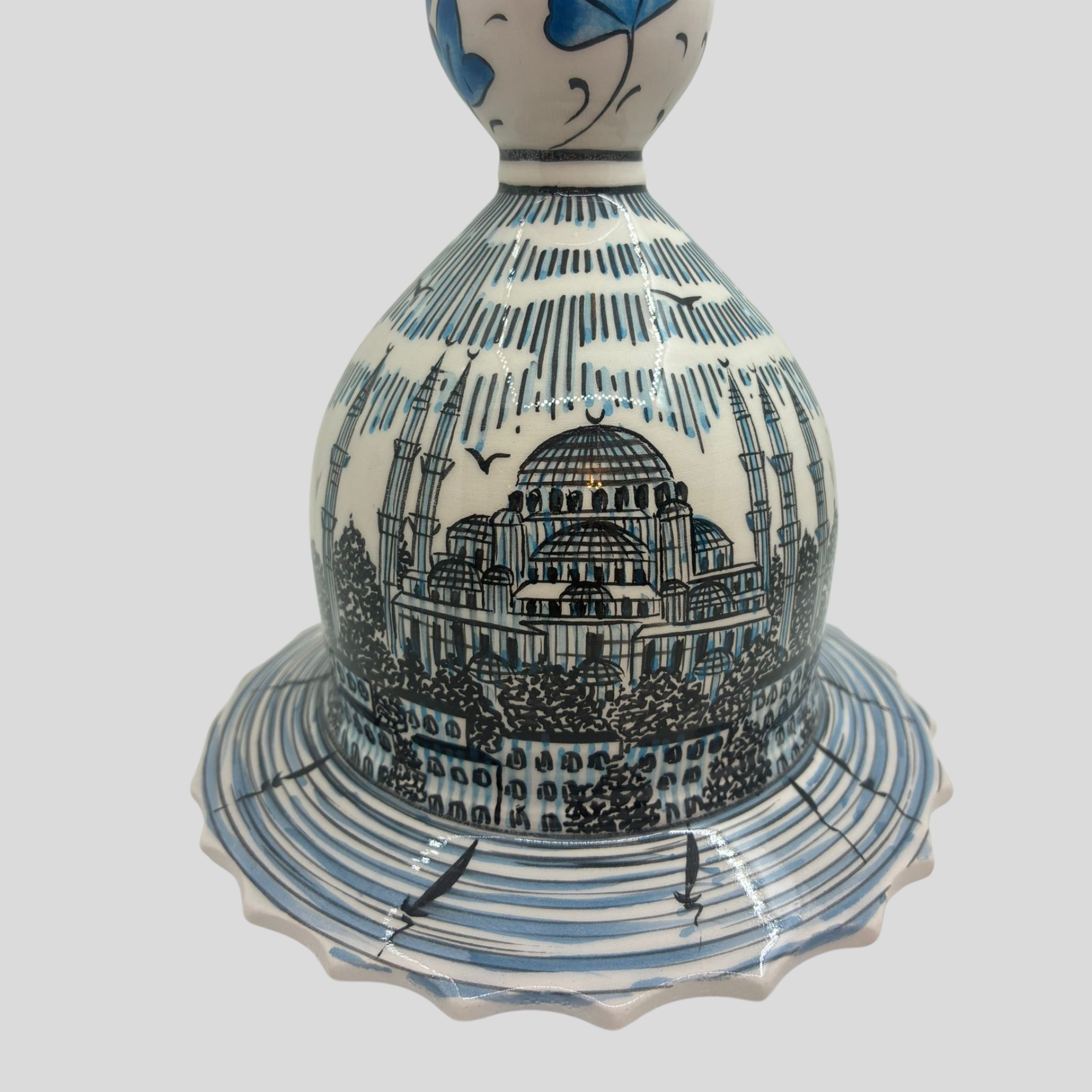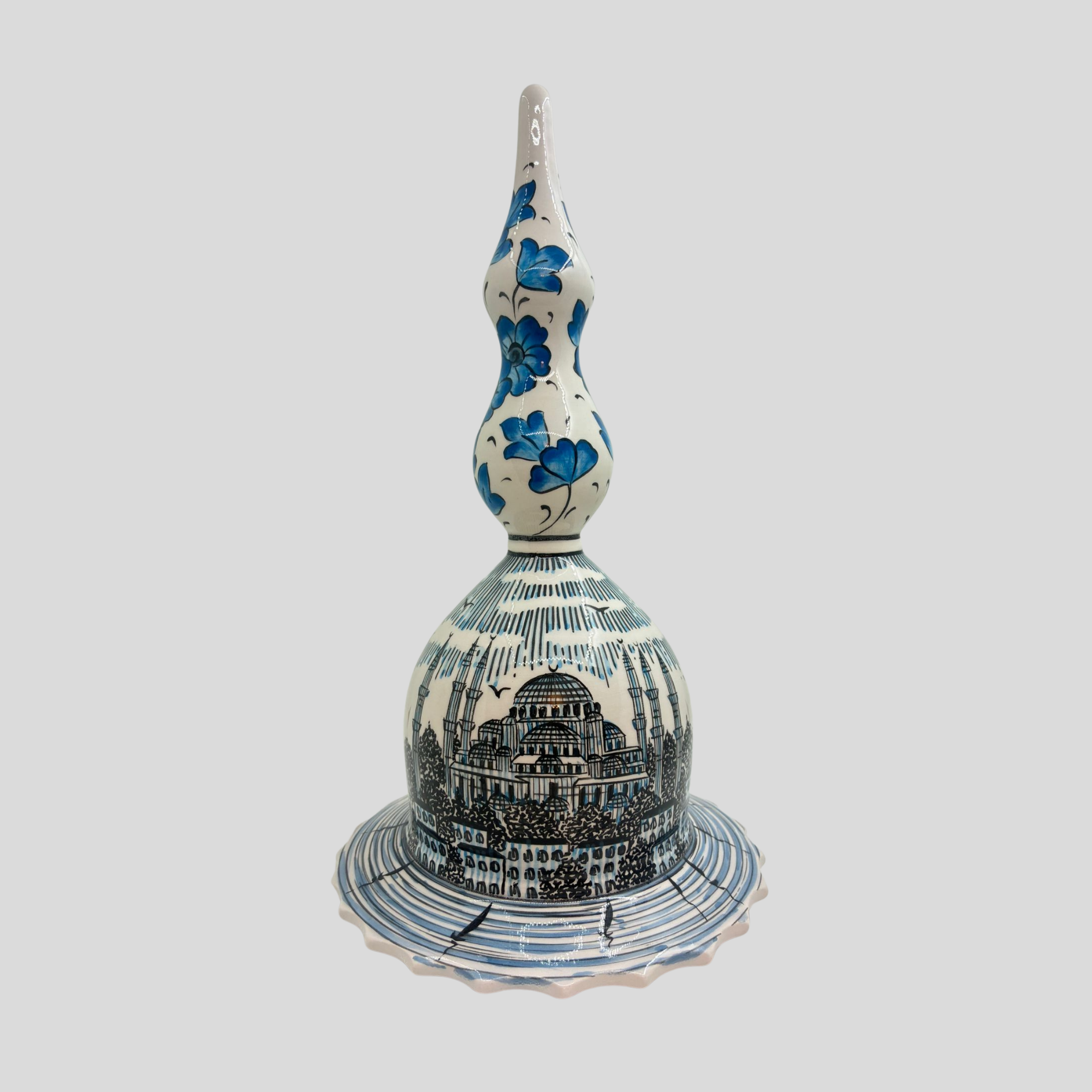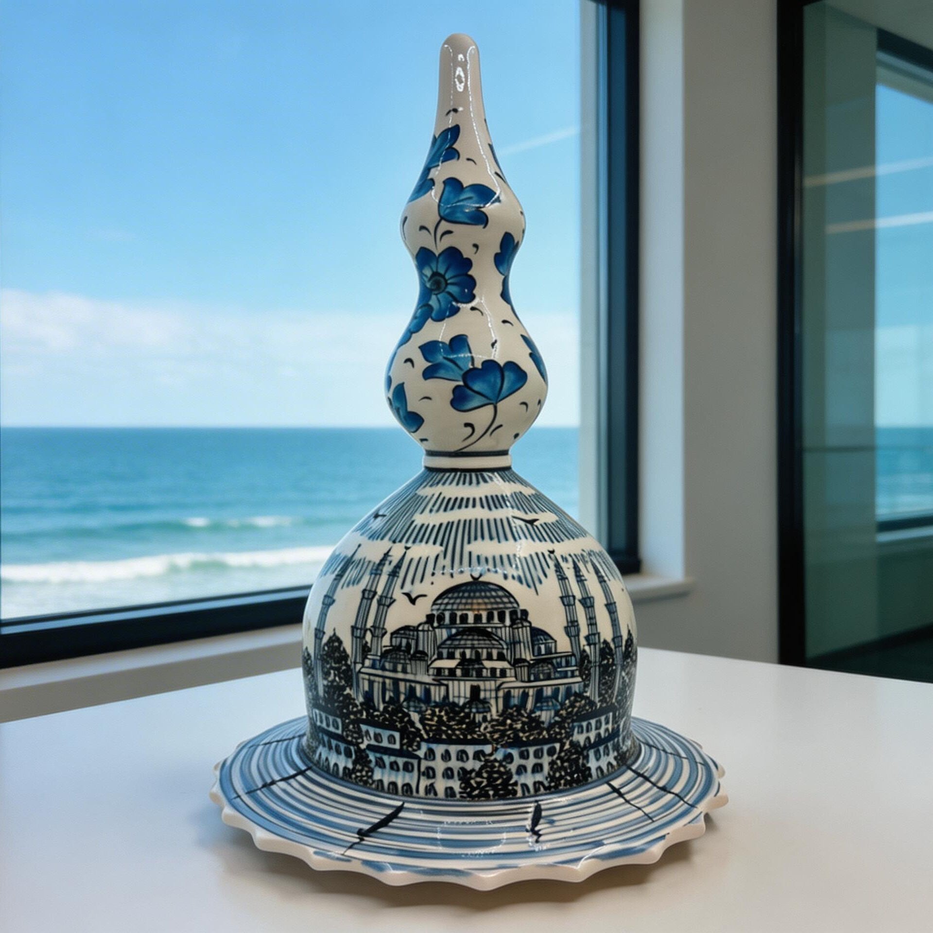 İstanbul Mavisi Kubbe, Üzerinde yer alan cami silüeti, İstanbul’un tarihî dokusunu yansıtırken; üst bölümde kullanılan mavi tonlu çiçek desenleri esere zarif bir hareket kazandırır. Seramik çini yüzey üzerinde işlenen bu detaylar, geleneksel sanatın inceliğini günümüz mekânlarına taşır.