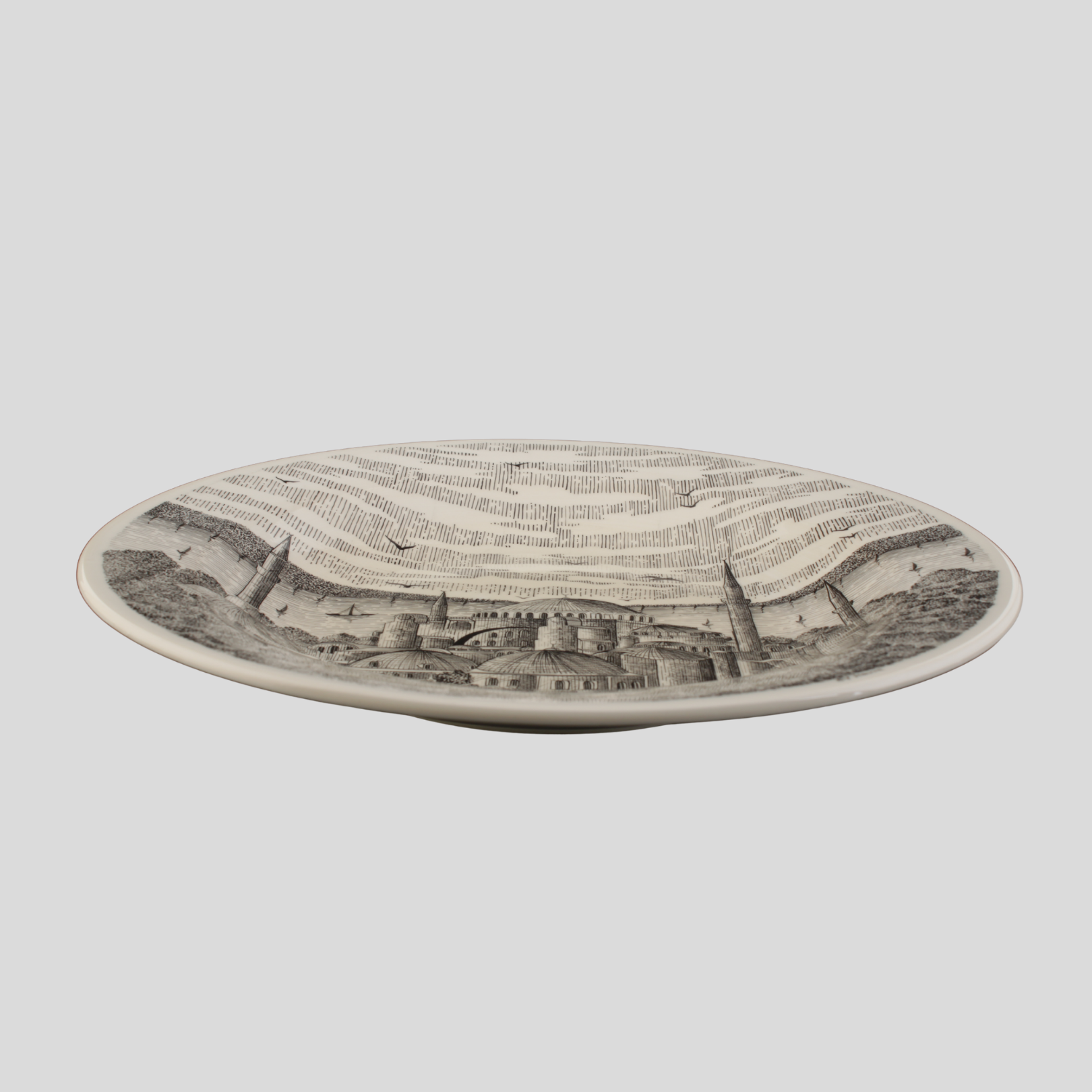İstanbul’un tarihî silüetini zarif bir kompozisyonla yorumlayan özel bir çini tasarımdır. Tabağın alt bölümünde yer alan cami kubbeleri ve minarelerle şekillenen şehir manzarası, İstanbul’un kadim mimarisini güçlü bir anlatımla yansıtır.