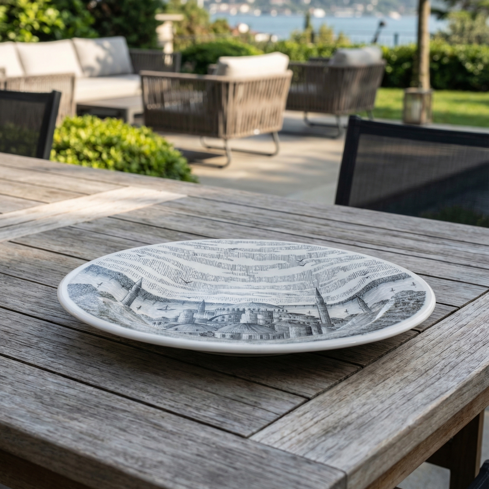 Kompozisyonun üst bölümünde yer alan ince çizgisel desenler, gökyüzünün hareketini ve şehrin üzerinde yükselen atmosferi simgeler. Bu çizgisel dokular tasarıma derinlik kazandırırken, şehrin silüeti tabağın etrafında bir ufuk çizgisi gibi uzanır.