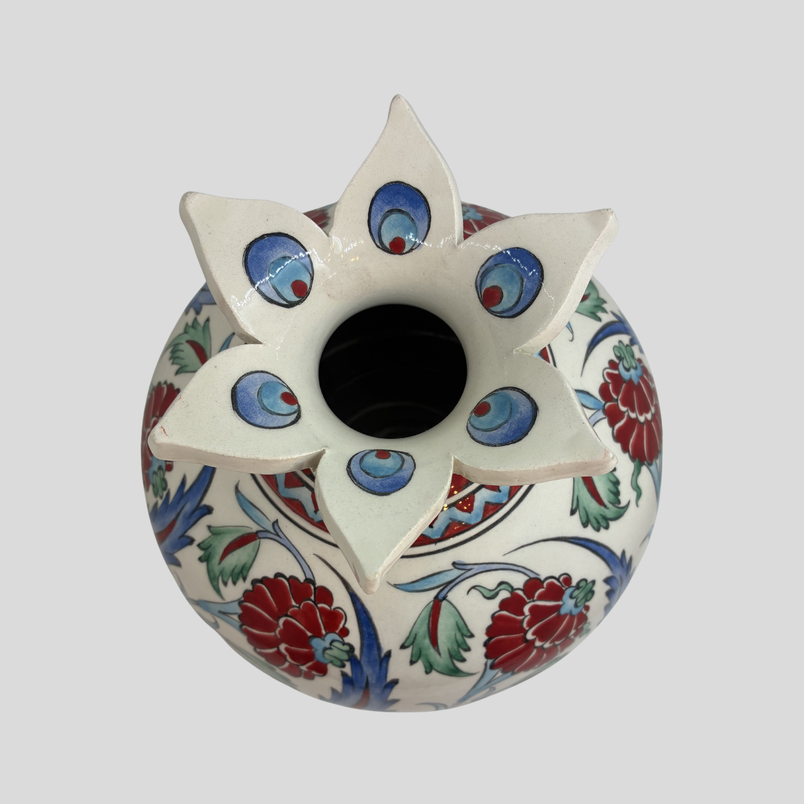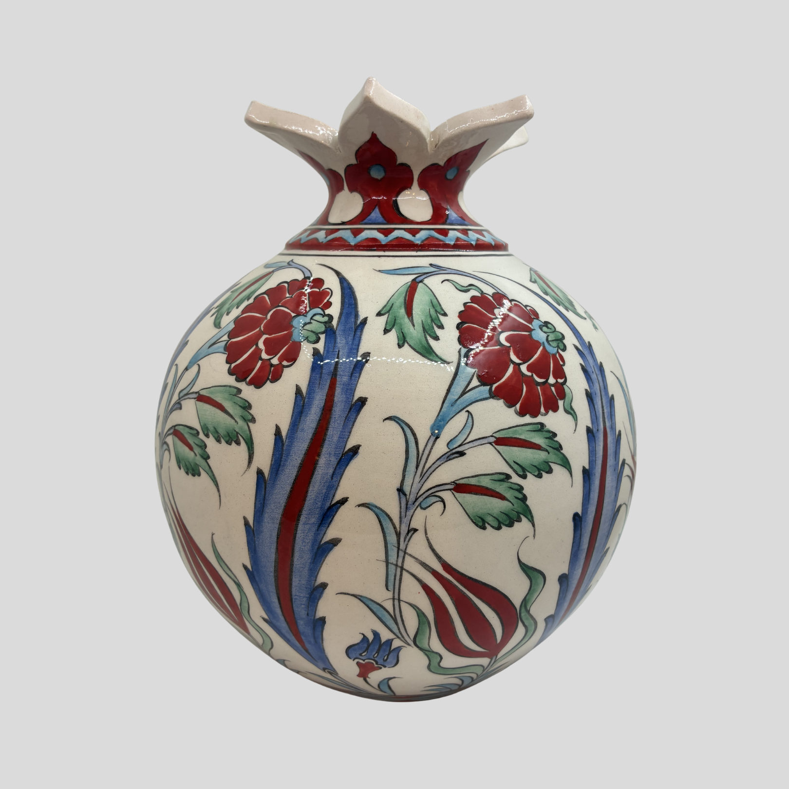 Geleneksel İznik çini sanatının karakteristik renkleri ve zarif bitkisel kompozisyonları bu özel vazoda hayat bulur. Krem zemin üzerinde yer alan kırmızı, mavi ve yeşil tonlu çiçek motifleri; Osmanlı döneminde saray sanatında sıkça kullanılan lale ve karanfil formunun stilize yorumunu yansıtır.