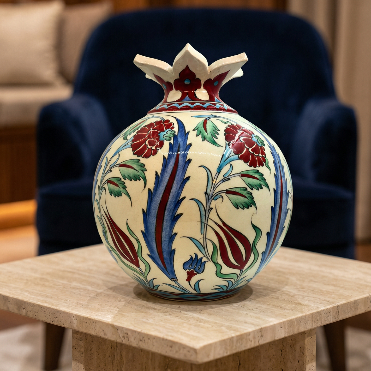 İznik çini sanatı, Osmanlı döneminde saray mimarisini ve sanatını süsleyen en önemli geleneklerden biridir. Lale, karanfil ve zarif bitkisel motifler yalnızca bir dekor değil; aynı zamanda estetik anlayışın ve doğaya duyulan hayranlığın ifadesidir. Bu vazo tasarımı, İznik çini sanatının bu köklü mirasını günümüz yaşam alanlarına taşıyan zarif bir yorumdur.