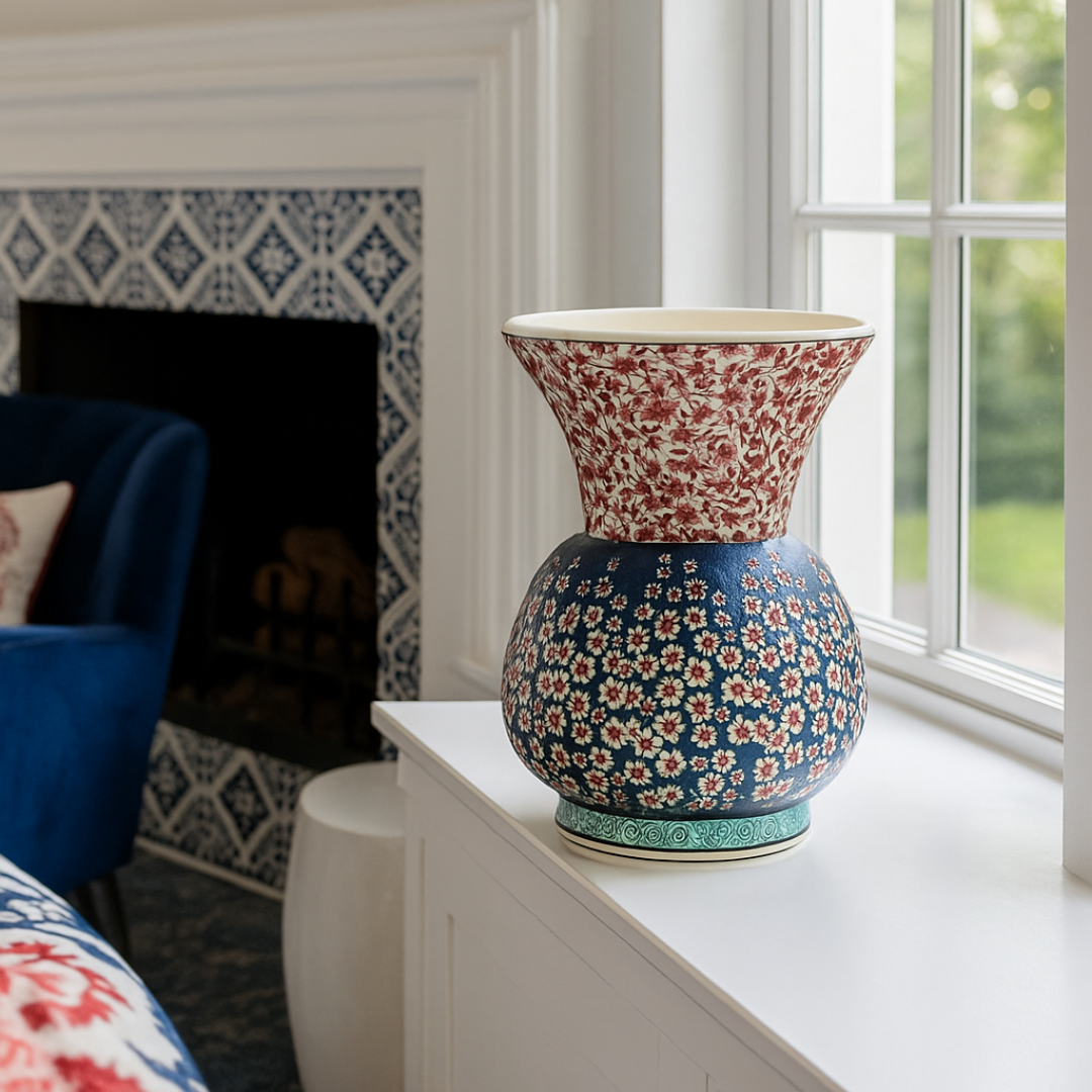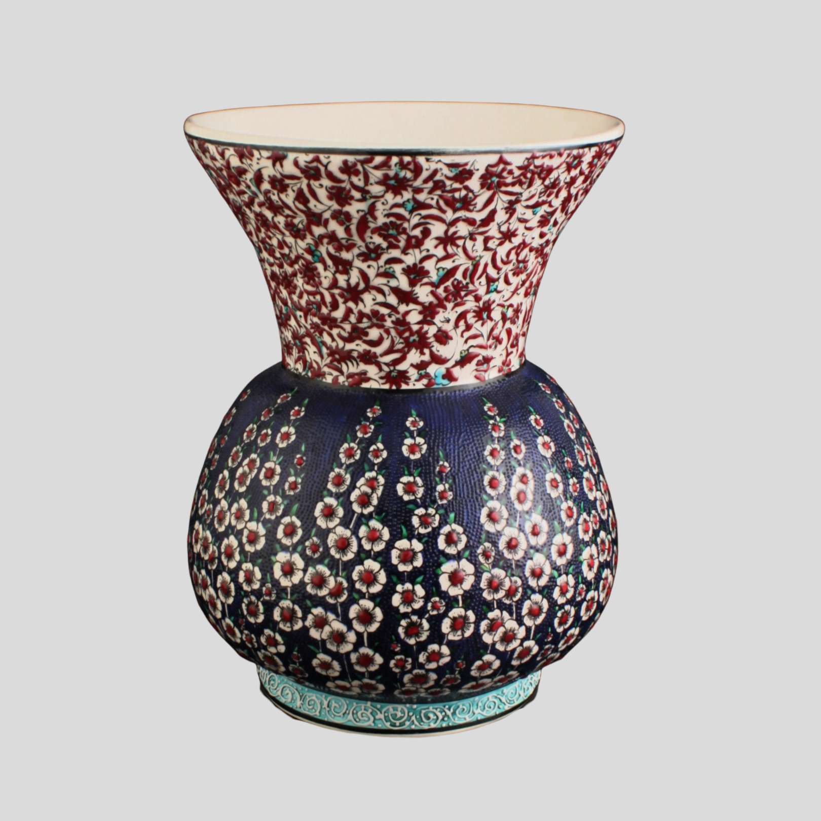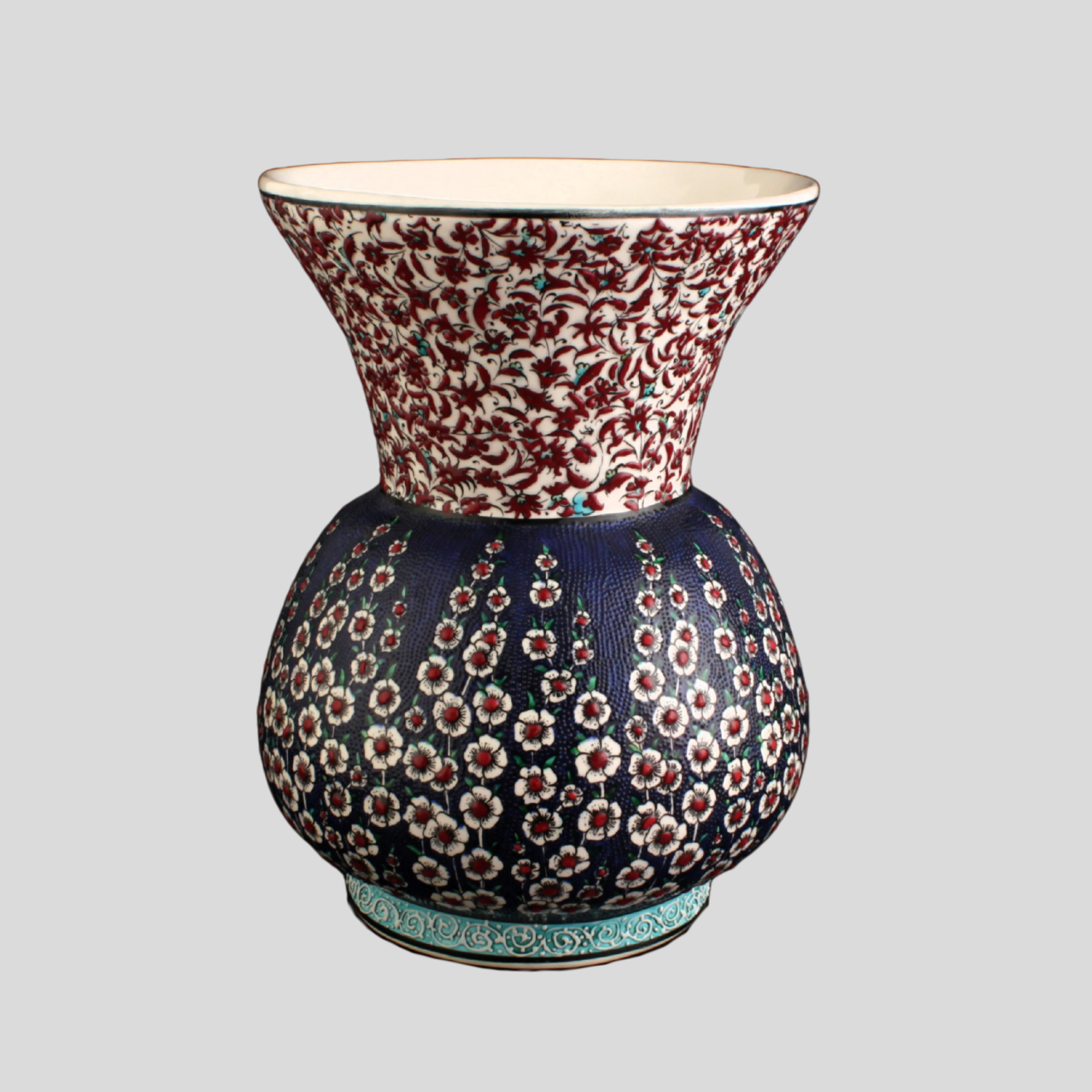 İznik çini üslubunun çok katmanlı desen yapısından ilhamla şekillendirilmiş, el işçiliğiyle üretilmiş zarif çini vazo.
