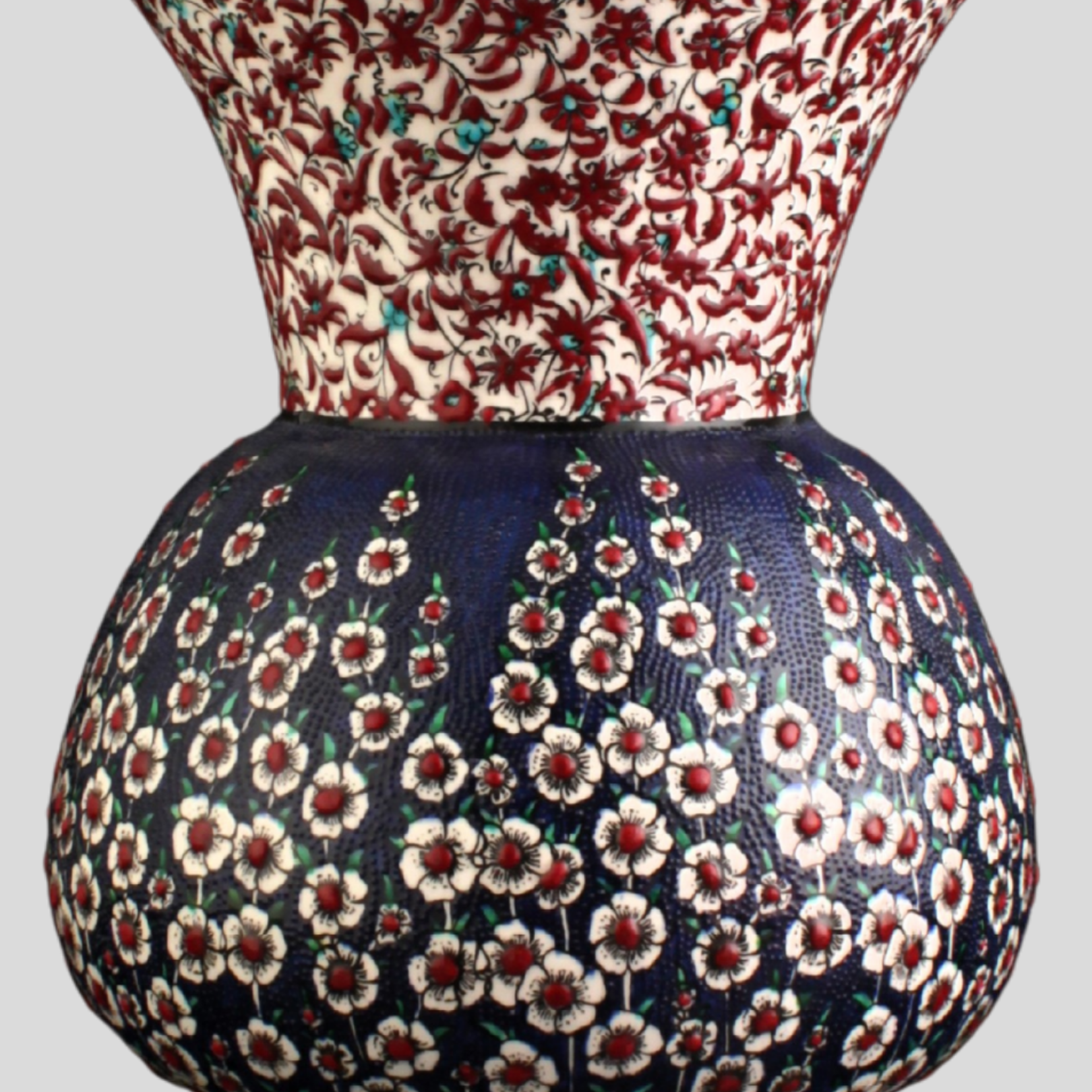 Bahar Dalı Vazo Klasik İznik çini üslubunun çok katmanlı desen anlayışını modern bir formda yeniden yorumlar. ismi, İznik sanatındaki iç içe geçmiş desen düzenleri ve renk geçişlerinin derinliğine gönderme yapar. Bu eser, tıpkı İznik ustalarının yüzyıllar önce yarattığı armoni gibi, renk, ritim ve çizginin mükemmel uyumunu yansıtır.