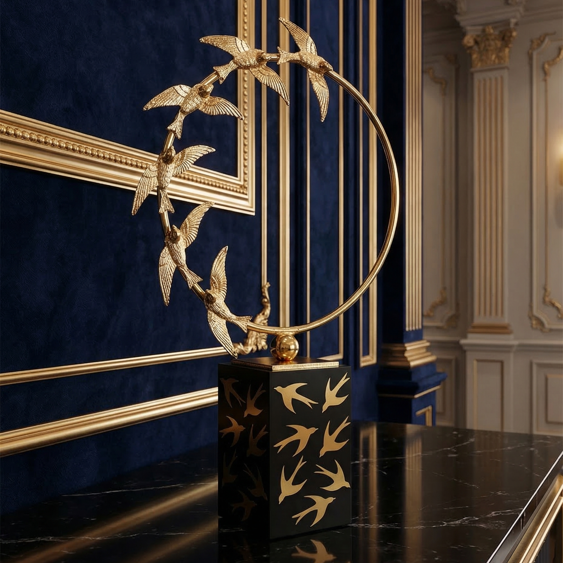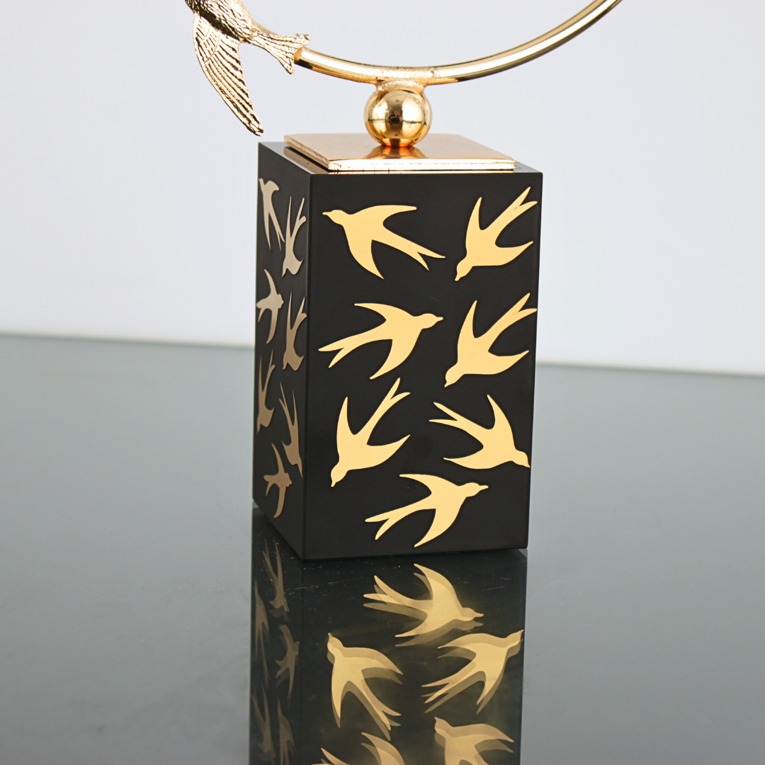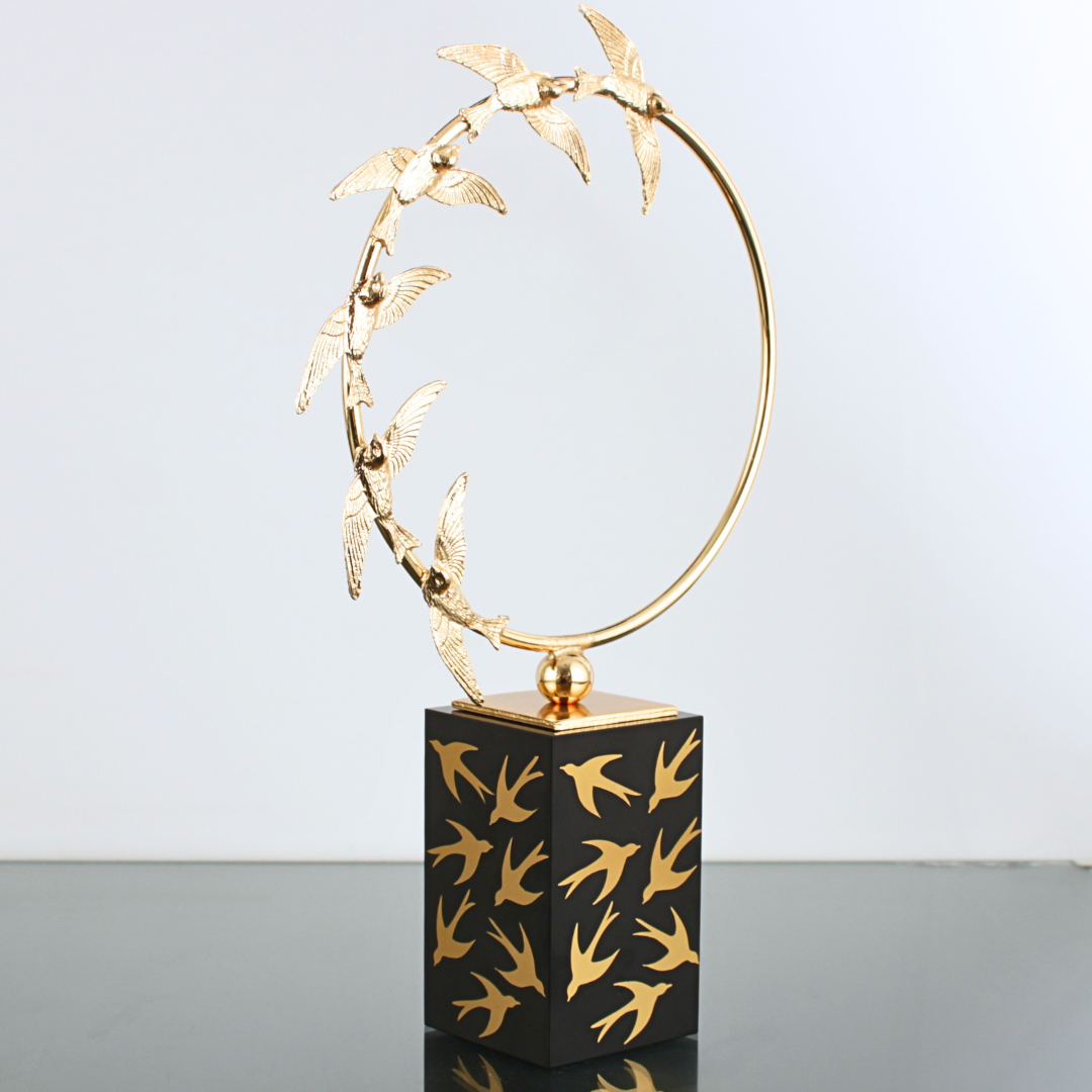 Uğur ve dönüşün sembolü kırlangıçlar, ince bir halka boyunca akıp gider; altın renk boyalı cam kaideyle dengeli, heykelsi bir siluet oluşturur. Masalarda, raflarda ve resepsiyon alanlarında güçlü bir odak noktası oluşturur.