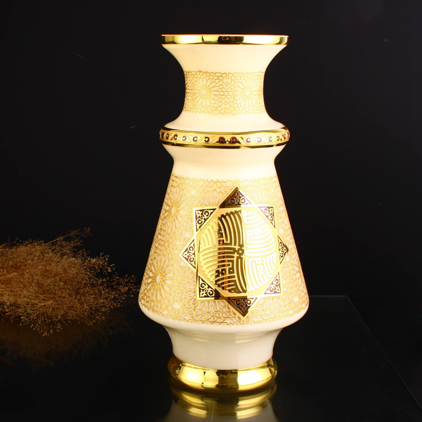 Kufi Vazo Selçuklu mirasının zarafetini ve hat sanatının estetik gücünü cam işçiliğiyle buluşturan Kufi Vazo, tarihi bir esin kaynağını modern bir yorumla sunuyor. Şifaiye Medresesi’ndeki mimari desenlerin yorumlandığı ve Prof. Dr. Mehmet Emin Barın’ın “Allah (c.c.)” Kufi hat eseriyle birleşen bu özel tasarım, cam ustalarının titiz el işçiliğiyle üretilmiş değerli bir koleksiyon parçasıdır. el yapımı bir lasede ürünüdür.