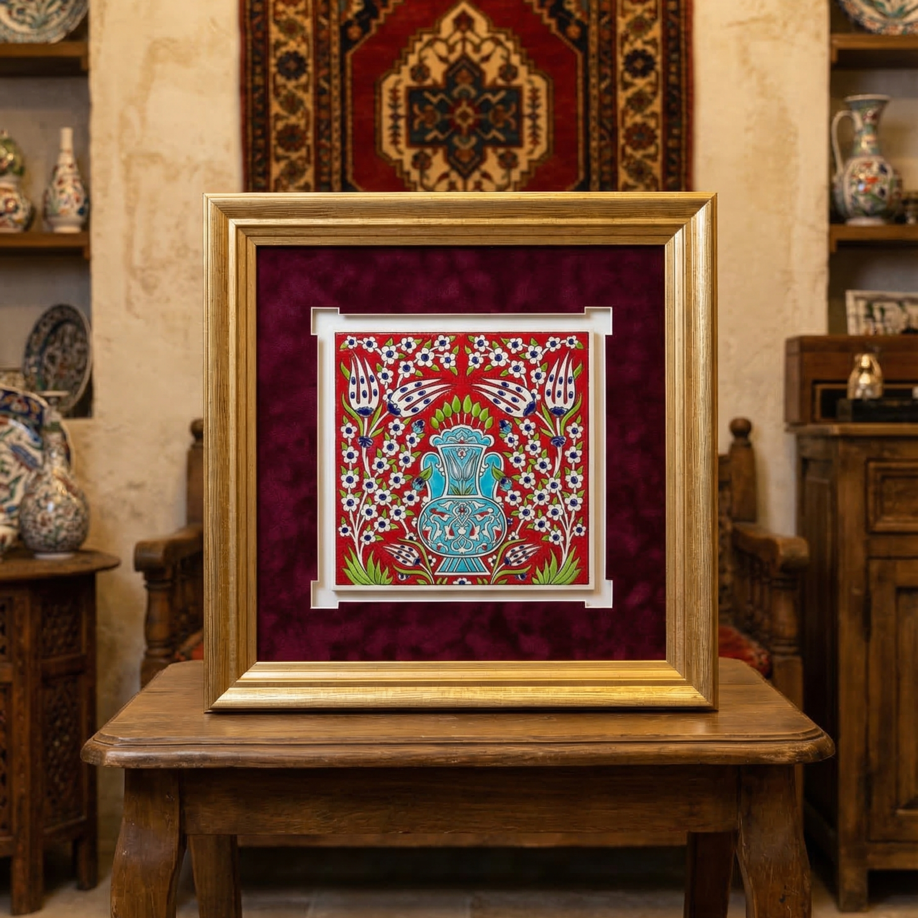 Altın tonlu çerçeve ve kadife dokulu bordo zemin, seramik karonun sanat değerini öne çıkarırken esere klasik bir ihtişam kazandırır. Bu tasarım; geçmişin çini sanatını modern dekorasyon anlayışıyla buluşturan, koleksiyon değeri yüksek bir dekoratif sanat eseridir.