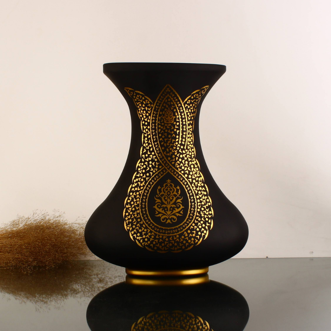 Lalezar Vazo; camın parlaklığını, sembol dili güçlü bir desen işçiliğiyle bir araya getirir. Tek bakışta güçlü bir siluet, yaklaştıkça detaylarıyla açılan bir ritim sunar: formun dengesi, desenin inceliği ve yüzeydeki ışık hareketi, eseri “vitrin parçası” hâline getirir.