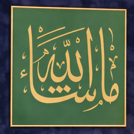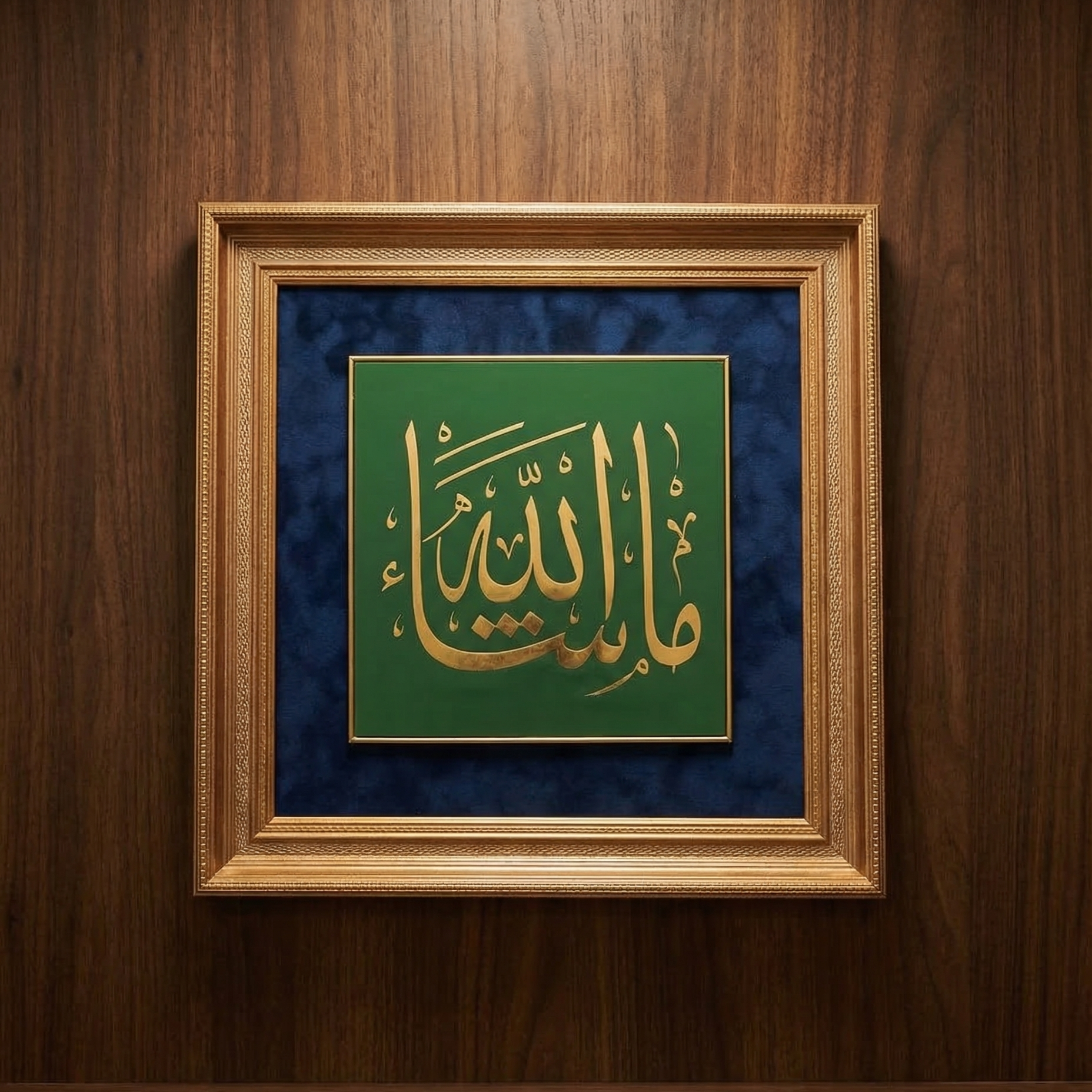 Kompozisyonun merkezinde yer alan “Maşallah” yazısı, klasik hat sanatının güçlü ve dengeli formu ile tasarlanmıştır. Yeşil tonlu zemin üzerinde yer alan zarif yazı formu, lacivert kadife fon ve altın tonlu klasik çerçeve ile birleşerek esere hem ihtişamlı hem de sıcak bir görünüm kazandırır.