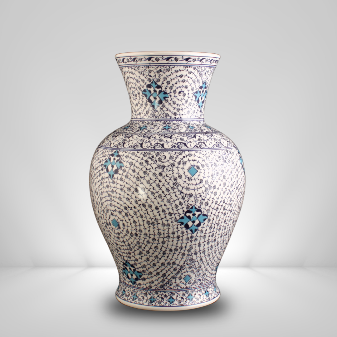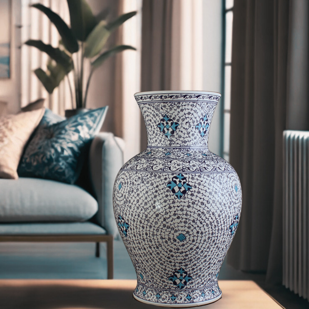 Mavi Haliç Vazo Büyük Boy Anadolu’nun bin yıllık seramik geleneğinin modern estetikle buluştuğu bu eser, Mavi Haliç Vazo Büyük Boy doğal topraklardan üretilmiş olup usta ellerin titiz el işçiliğiyle şekillendirilmiştir. Haliç desenin derin mavisi, bu tasarımı sadece bir dekoratif obje olmaktan çıkarıp tarihî bir zarafetin günümüze taşınan yorumu haline getirmektedir.
