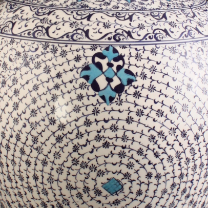 16.yüzyılda İznik atölyelerinde doğan Haliç işi desenler, Osmanlı sanatında akışkan çizgileri ve ritmik yapısıyla öne çıkmıştır. İnce yapraklar ve zarif dallardan oluşan bu motifler, yalnızca çini sanatında değil saray süslemeleri ve mimaride de kullanılarak Osmanlı’nın zarafetini temsil etmiştir. Mavi Haliç Vazo, bu tarihî desenleri günümüzün modern estetik anlayışıyla yorumlayarak kültürel bir mirası yaşatmaktadır.