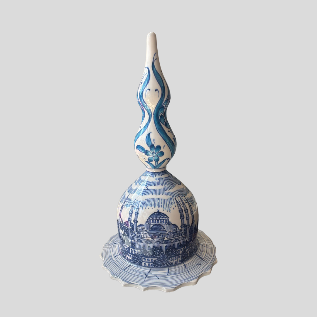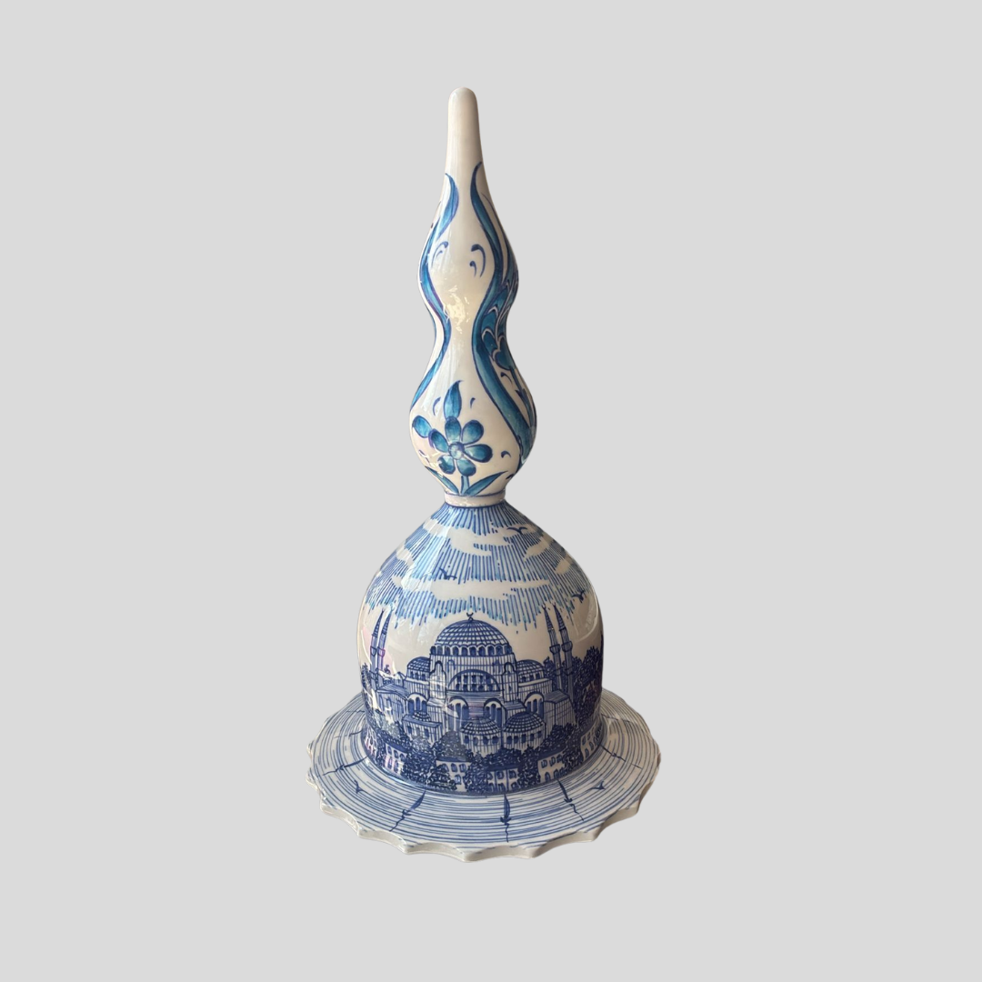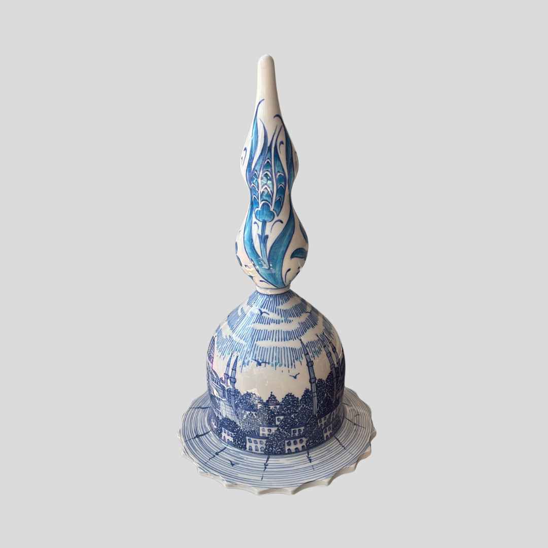 Mavi İstanbul Lale Kubbe, İstanbul’un tarihi silüetini ve geleneksel çini sanatını zarif bir formda buluşturan özel bir tasarımdır. Mavi İstanbul Lale Kubbe, kubbe mimarisinden ilham alan alt formu ve lale figürüyle yükselen üst yapısıyla kültürel bir anlatıyı estetik bir objeye dönüştürür.
