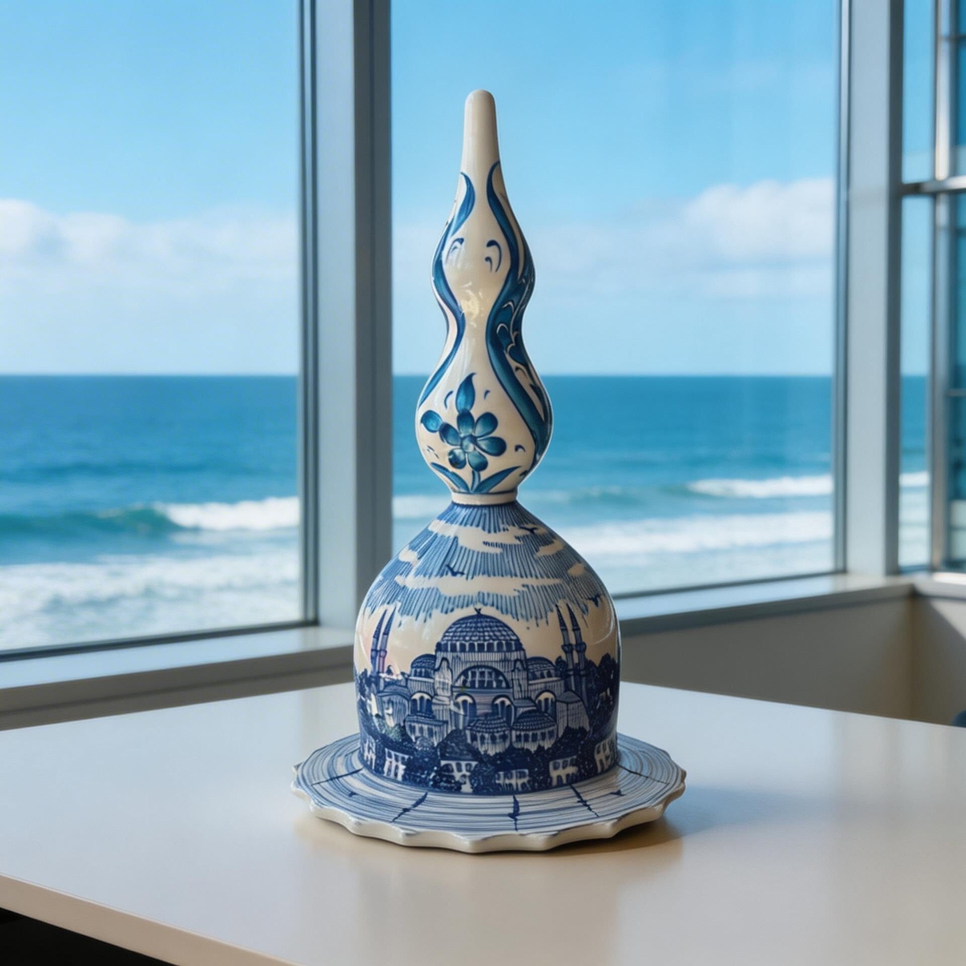 Seramik çini yüzey üzerine işlenen İstanbul silüeti, esere derinlik ve hikâye kazandırırken; mavi tonların dinginliği bulunduğu ortama huzurlu bir atmosfer taşır. Üstte yer alan lale formu ise Osmanlı estetiğinin zarif bir imzası olarak tasarımı tamamlar.