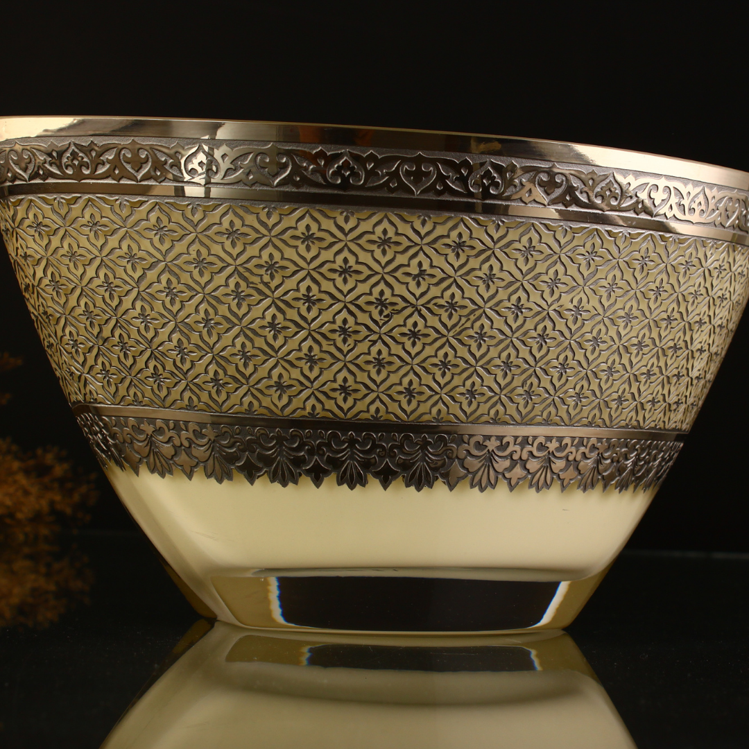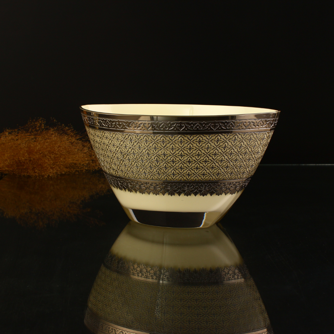 Mecidiye Gondol Platin, Beykoz Mecidiye Kasrı’nın zarif mimari estetiğini cam sanatının seçkin diliyle buluşturan özel bir tasarımdır. Koleksiyonun ilhamını taşıyan bu eser, Osmanlı zarafetini platin etkili görünüm ve ince bezeme anlayışıyla yeniden yorumlar. Mecidiye Gondol Platin El yapımı cam yüzey üzerinde yükselen süslemeler, ürünü yalnızca dekoratif bir obje olmaktan çıkarır; bulunduğu mekânda kültürel hafızası olan güçlü bir sanat parçasına dönüştürür.