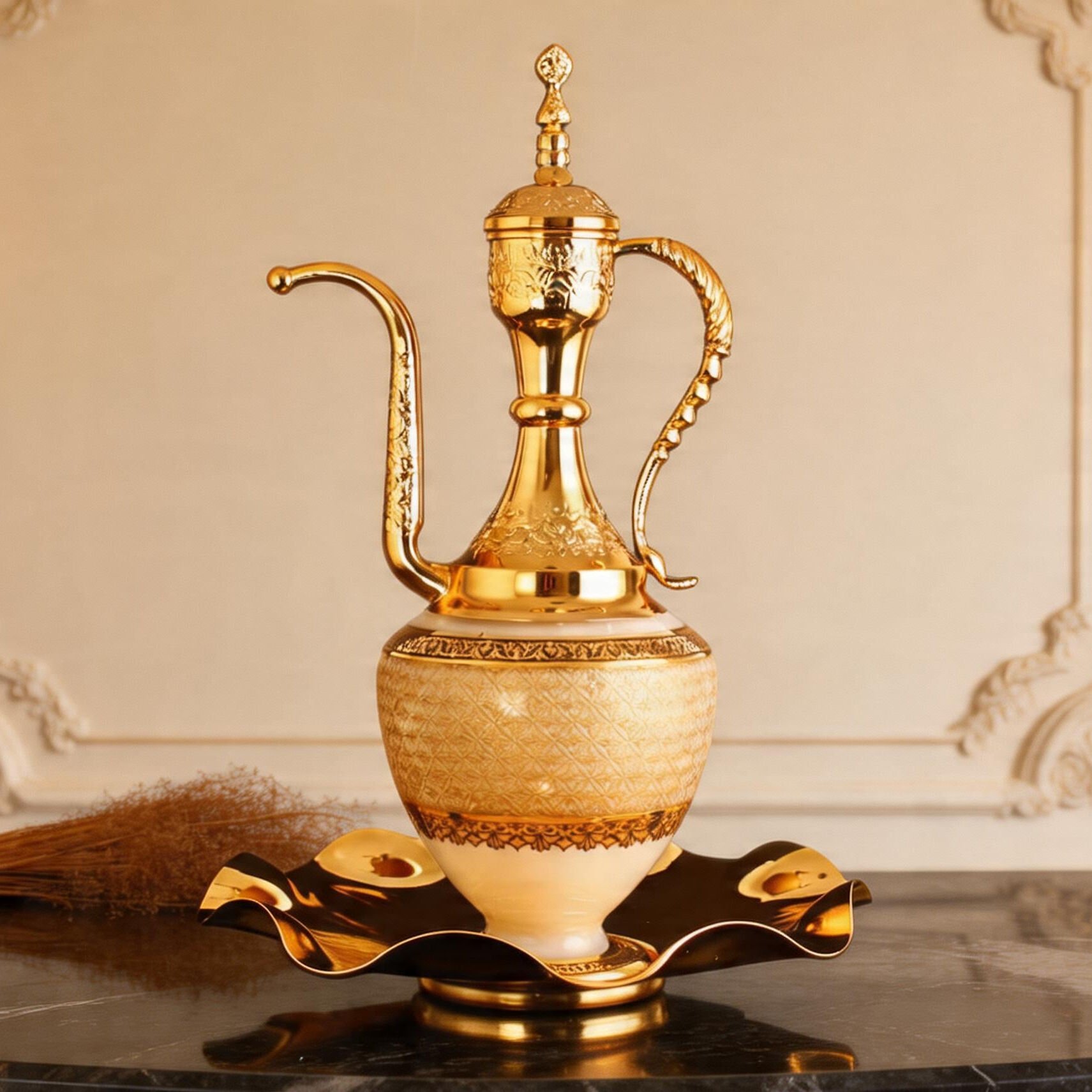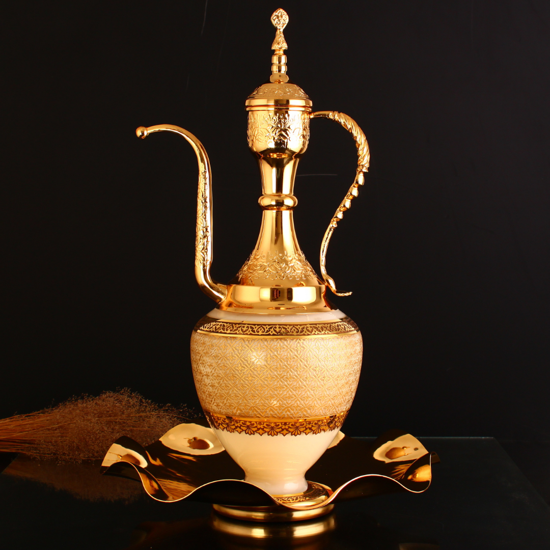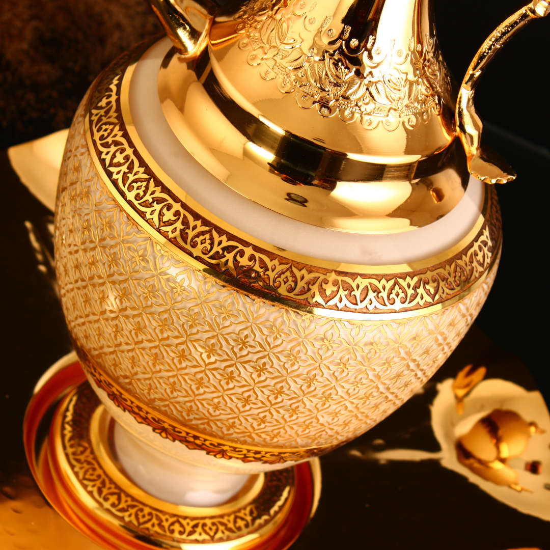 Ürün, özel hediyelik deri kutusunda ve sertifikalı olarak teslim edilir.Mecidiye İbrik Altın, Beykoz Mecidiye Kasrı’nın zarif mimari estetiğini cam sanatının seçkin diliyle buluşturan görkemli bir tasarımdır. Uzun ve etkileyici silueti, Osmanlı zarafetini yansıtan bezemeleri ve altın süslemeleriyle bulunduğu mekânda yalnızca dekoratif bir obje değil, tarihî hafızası olan güçlü bir sanat parçası etkisi oluşturur. El yapımı cam yüzey üzerinde yükselen bu özel yorum, geçmişin ihtişamını bugünün yaşam alanlarına taşıyan rafine bir duruş sunar.Mecidiye İbrik Altın Salonlarda, vitrinlerde, konsol üstlerinde, makam odalarında ve seçkin ofis düzenlerinde dikkat çekici bir odak oluşturan bu eser; sanatsal dekorasyon, koleksiyonluk kullanım ve prestijli hediye seçeneği olarak öne çıkar. Yüksek formu ve ayrıntılı işçiliği sayesinde tek başına sergilendiğinde dahi imza parça etkisi bırakır.