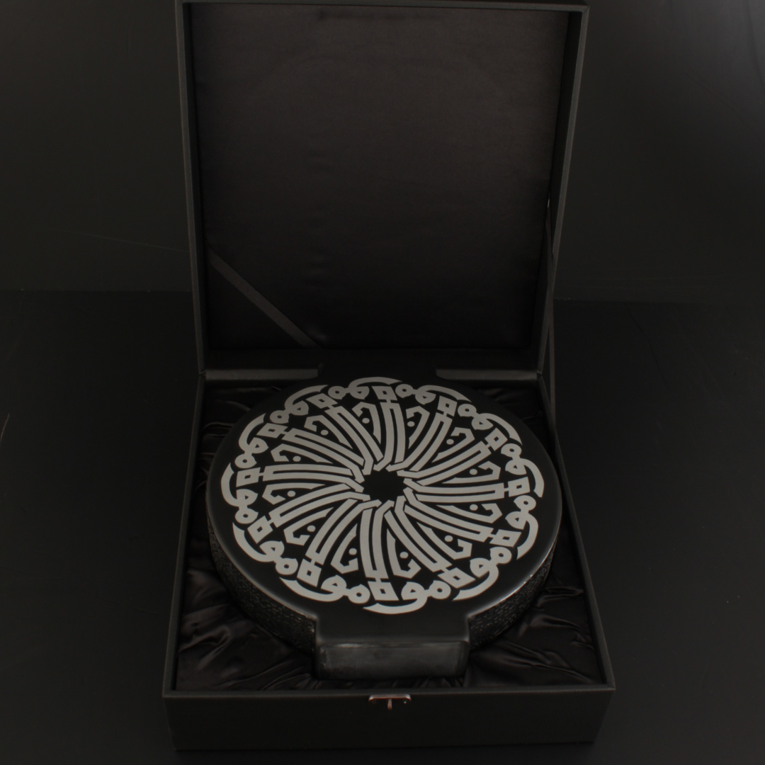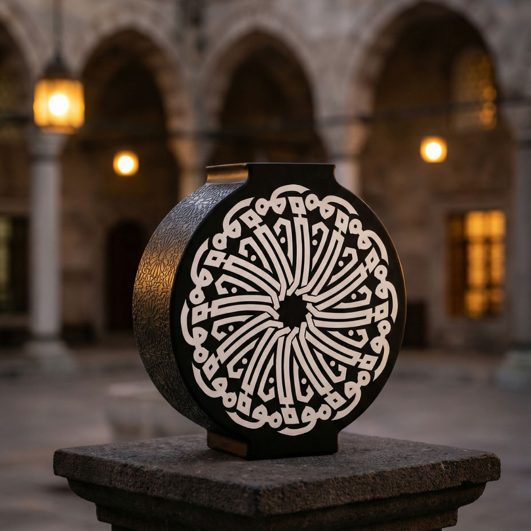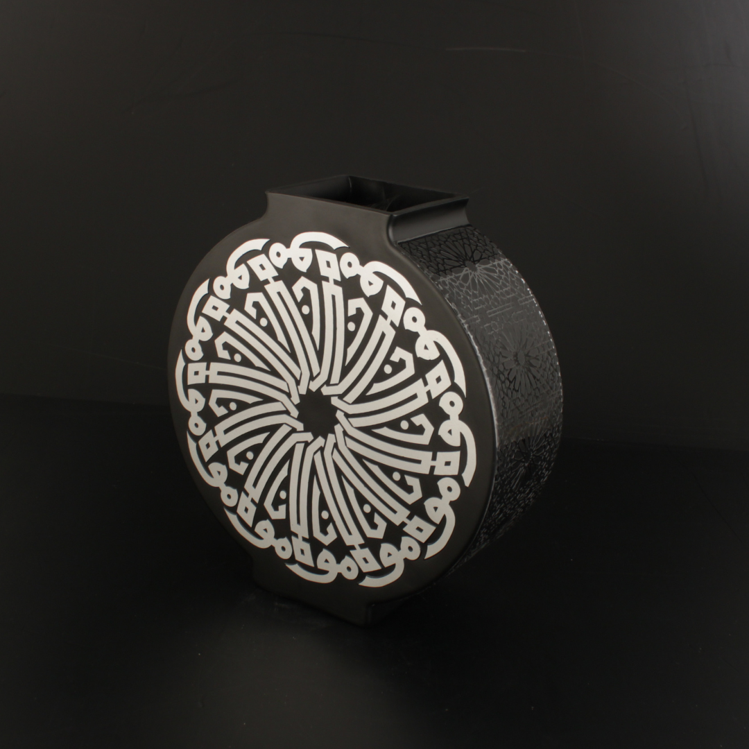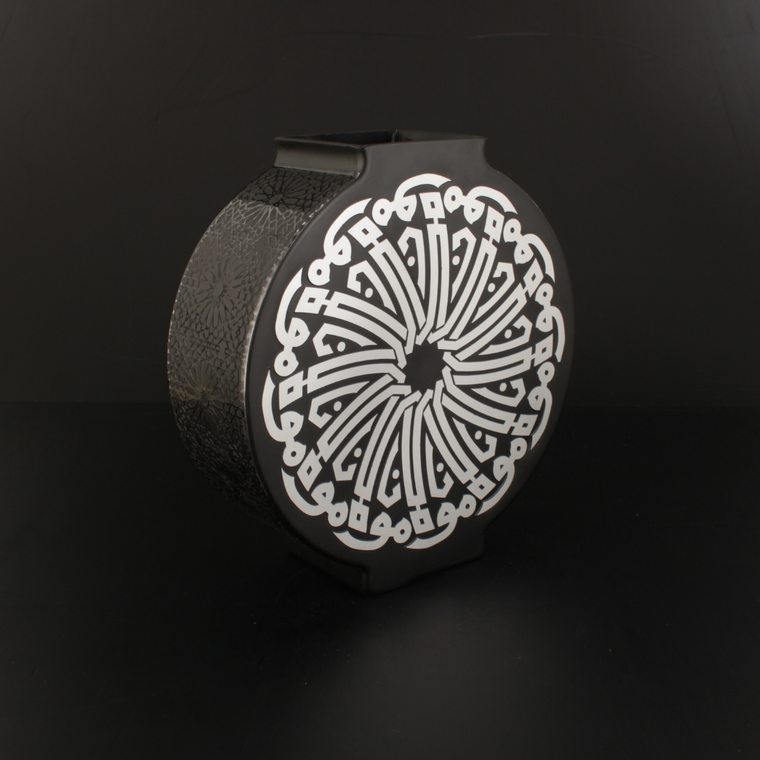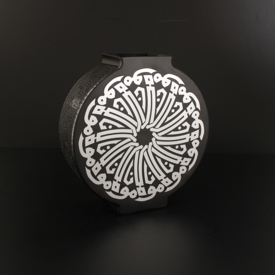 Mevlana Vazo Zamanın ötesinden gelen bir çağrı gibi, Mevlânâ’nın sevgi ve hoşgörü dili bu eserde hat sanatının zarafetiyle buluşur. Siyah zemin üzerine mat gümüş hatla yazılan “Mevlana” ismi, dairesel bir kompozisyon içinde yer alır ve her açıdan dengeli, sakin bir ritim oluşturur.