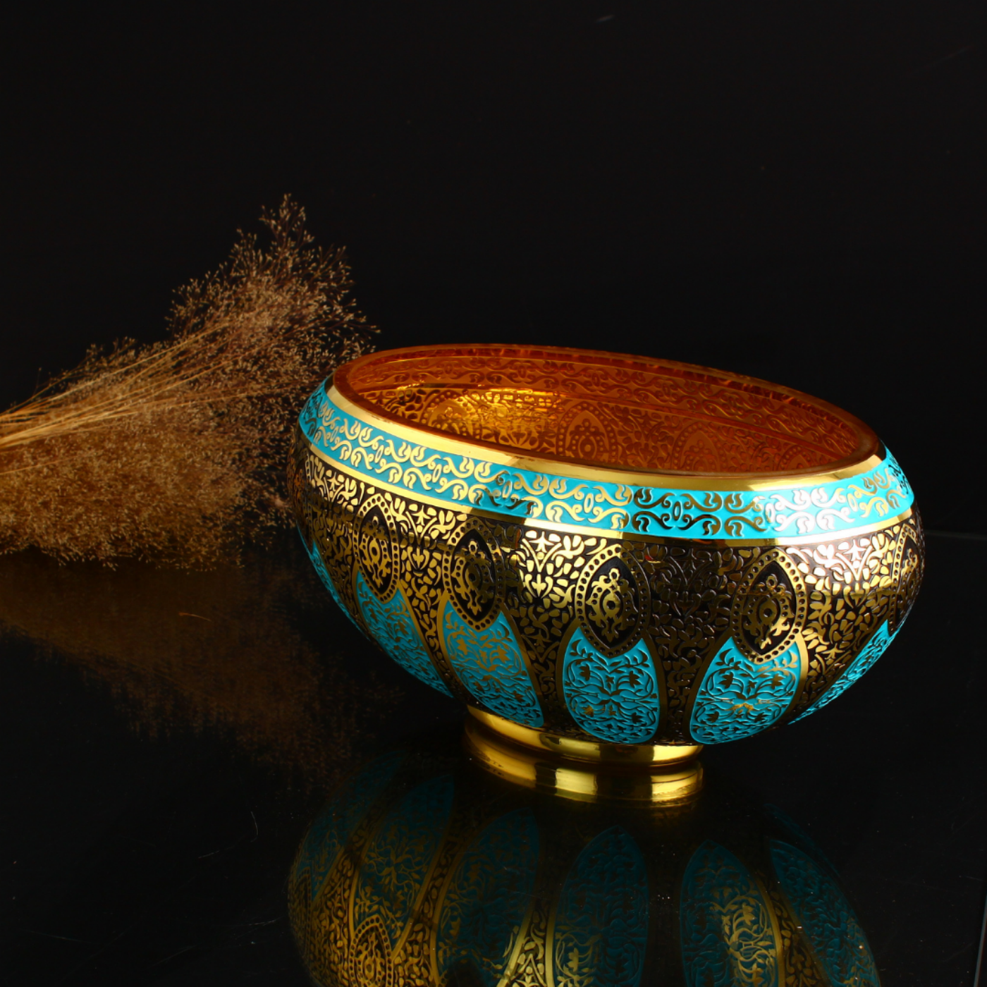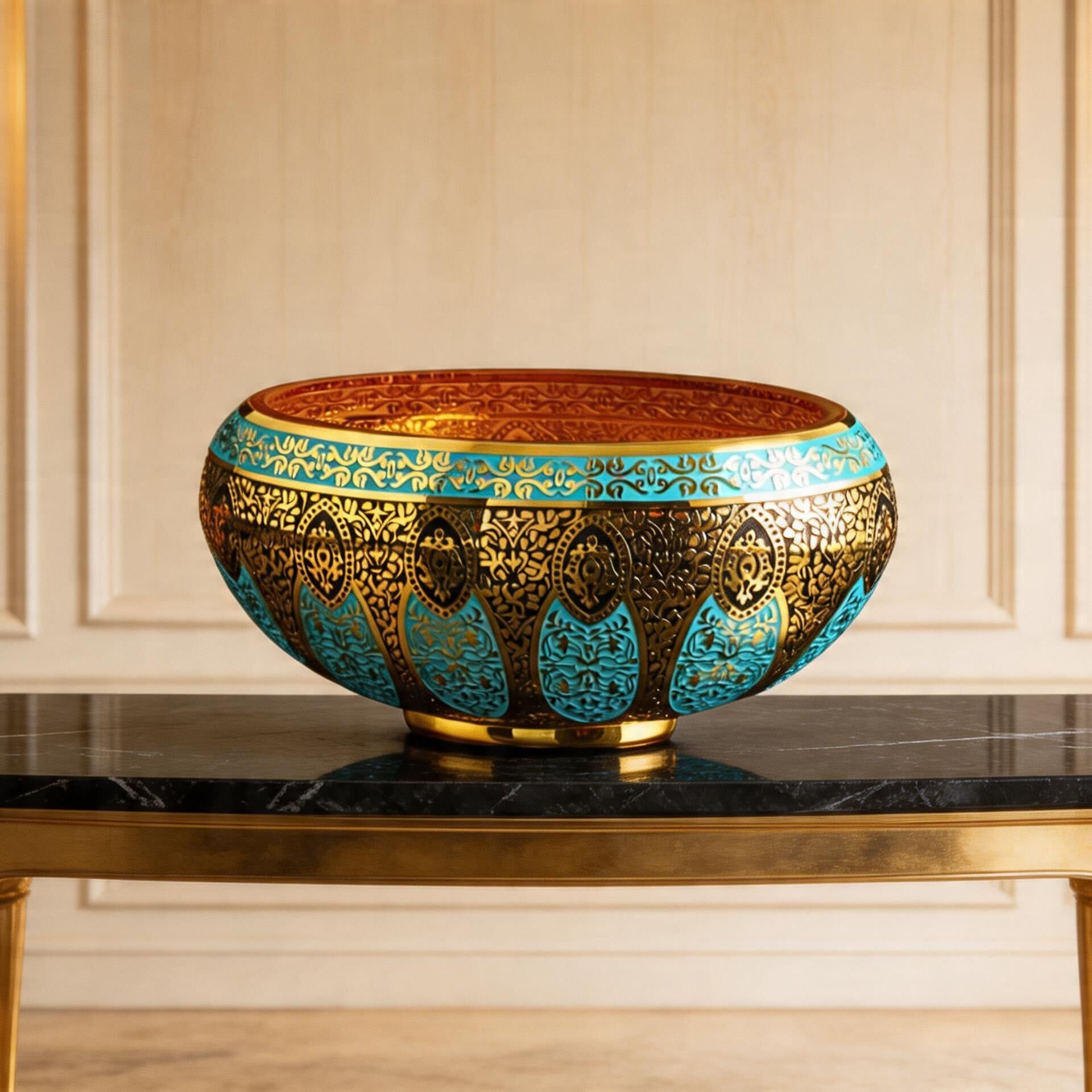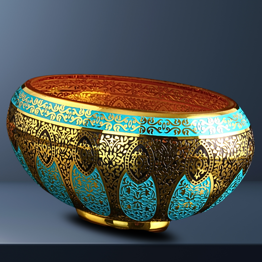 Mihrişah Sultan Kase, Osmanlı zarafetini cam yüzey üzerinde incelikli bir yorumla buluşturan seçkin bir tasarımdır. Geniş ve dengeli formu, 24 ayar altın ve özel cam boyasıyla işlenen bezeme diliyle birleşerek bu eseri yalnızca dekoratif bir obje olmaktan çıkarır; bulunduğu mekânda kültürel anlam taşıyan güçlü bir sanat parçasına dönüştürür. Mihrişah Valide Sultan’ın vakfiyelerindeki motiflerden ilham alan bu özel tasarım, geçmişin zarafetini bugünün yaşam alanlarına taşıyan rafine bir yorum sunar.