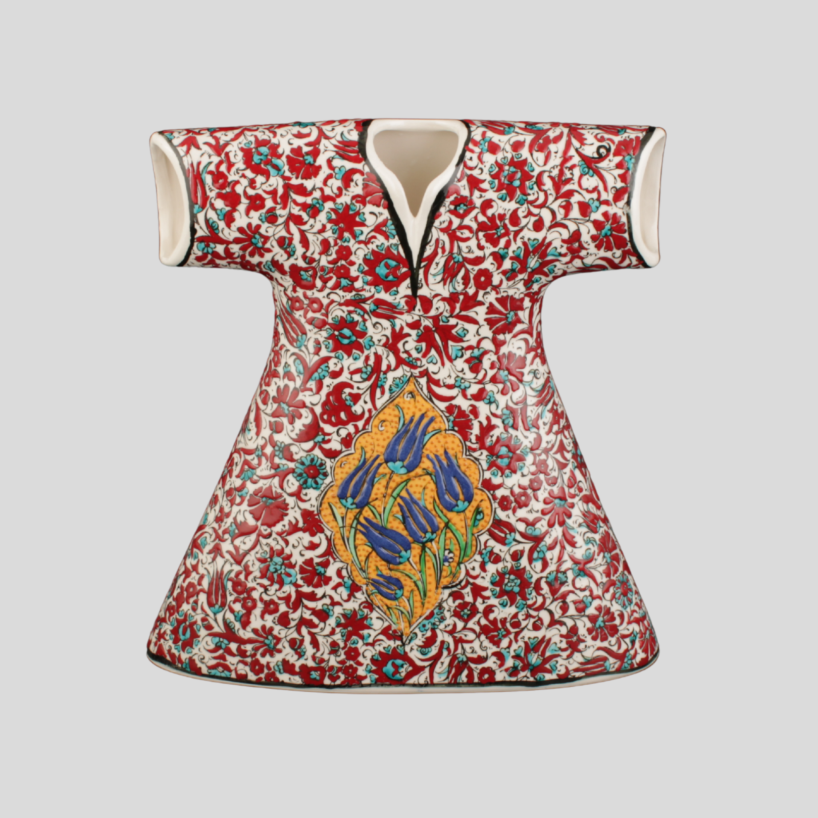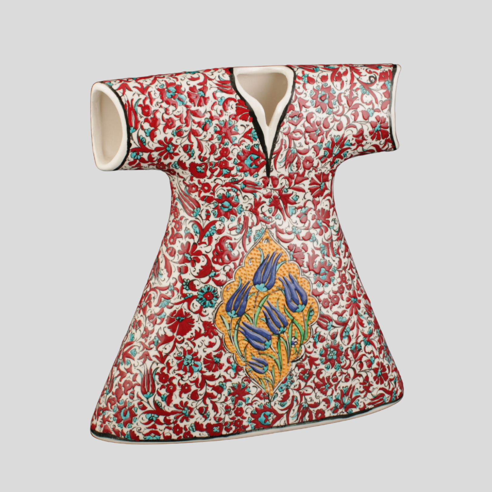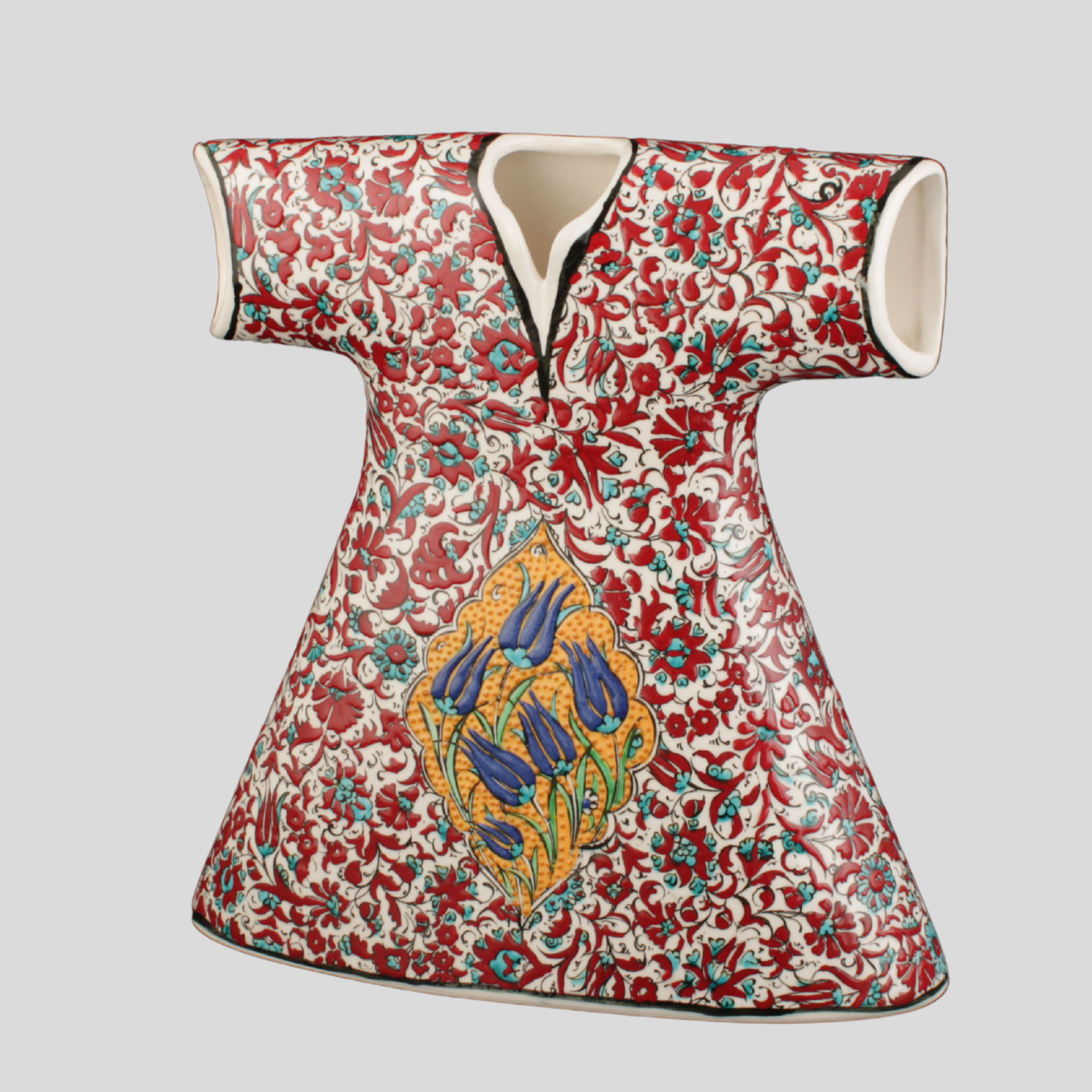 El yapımı çini kaftan obje; şemse içinde merkezî lâle “mühür” kompozisyonuyla seçkin bir parça.