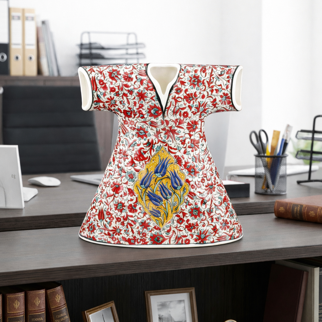 Kaftanın koruyucu formu üzerinde, “mühür” etkisi yaratan merkezî lâle kompozisyonu ölçü ve simetri duygusunu güçlendirir; mekâna sakin, seçkin ve anlamlı bir vurgu katmaktadır .