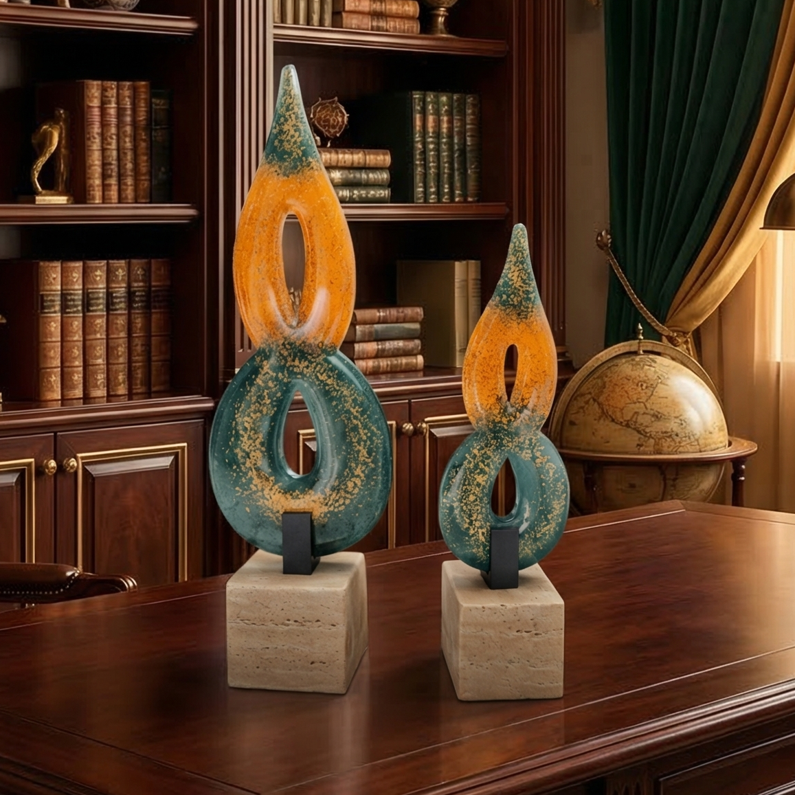 Aurora Füzyon Cam Dekoratif obje Seti Mermer kaide üzerinde yükselen bu iki parçalı tasarım, bulunduğu mekânda heykelsi bir etki yaratarak modern dekorasyonun dikkat çekici bir sanat objesine dönüşür. Farklı ölçülerde tasarlanmış parçaların birlikte kullanılması ise dekoratif denge ve güçlü bir görsel bütünlük sağlar.