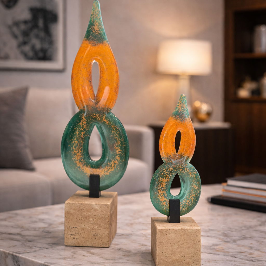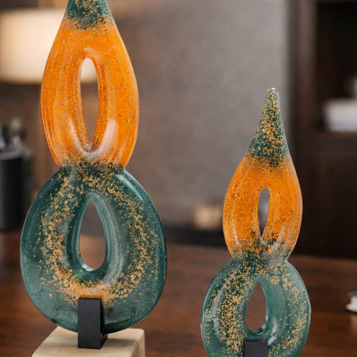 Aurora Füzyon Cam Dekoratif obje Seti Füzyon cam tekniği ile üretilen cam yüzey; turuncu, yeşil ve altın tonlarının doğal geçişleriyle güçlü bir görsel hareket oluşturur. Üst üste yükselen form yapısı, esere hem dinamizm hem de zarif bir dikey kompozisyon kazandırır.