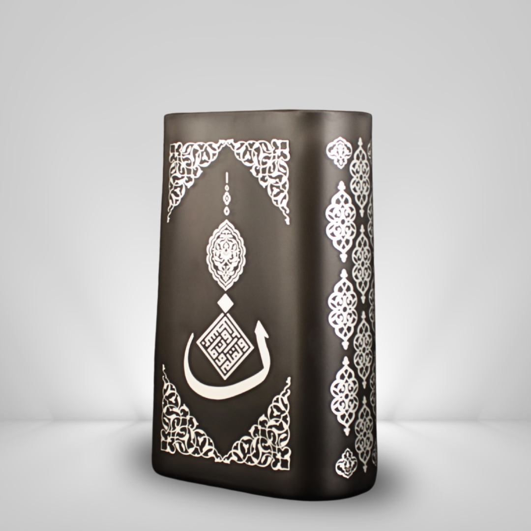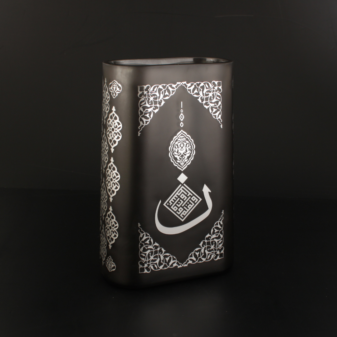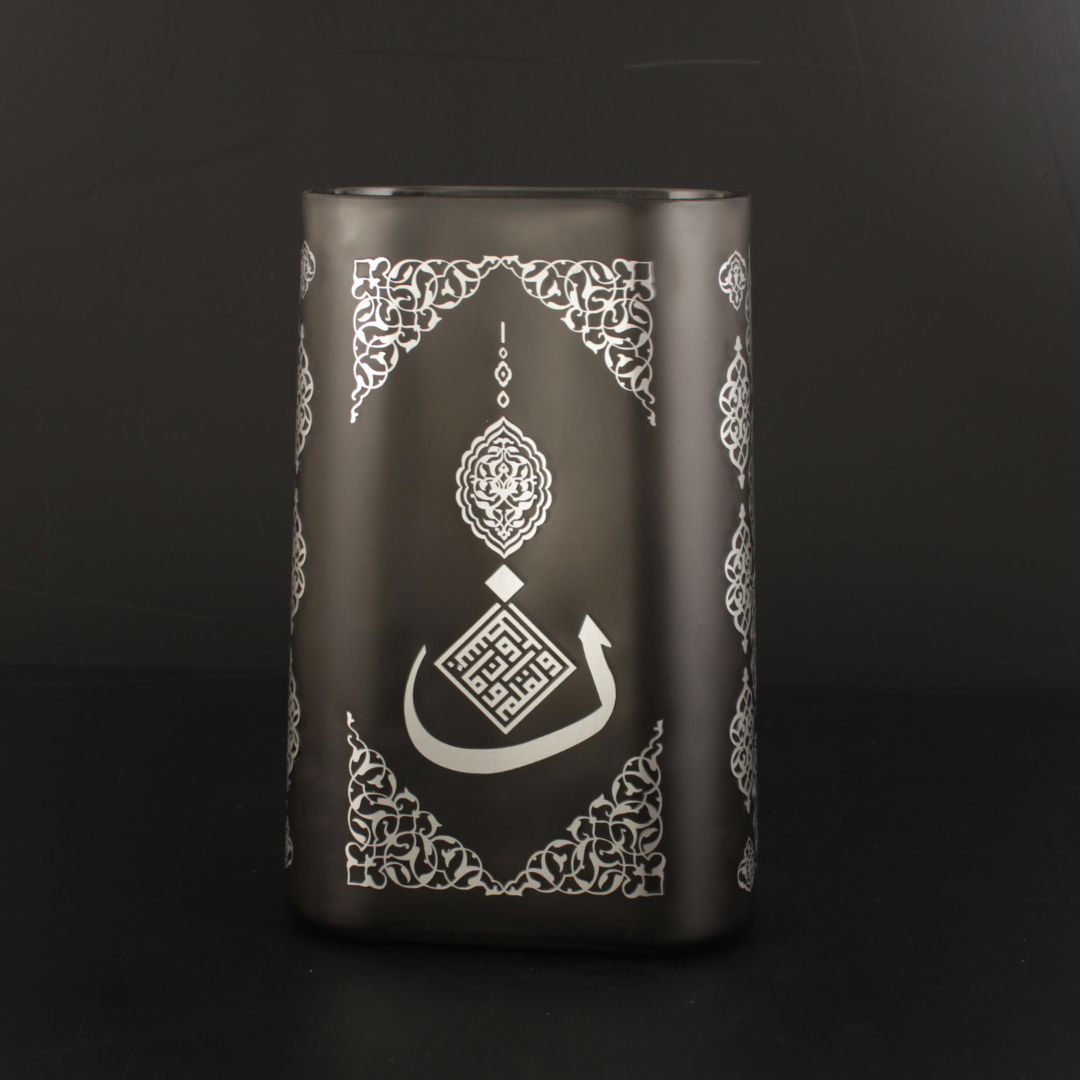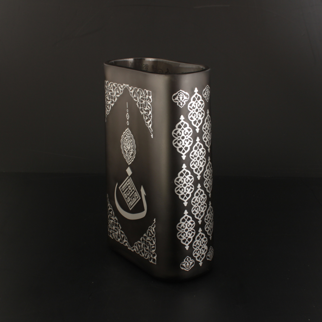 Nun Vazo, ilim ve yazının kıymetini merkeze alan bir ilhamla tasarlandı. Yüzeydeki rumi motifler, İslam sanatının köklü estetik dilini taşırken; cam formun dingin duruşu esere modern bir sadelik kazandırır. Her parça %100 el işçiliği ile üretildiği için kendine özgü bir karakter taşır; yakından bakıldıkça detaylar daha çok görünür olur. Bu eser, bulunduğu mekâna yalnızca şıklık değil, anlam da taşır. Nun Vazo el yapımı bir Lasede tasarımı.