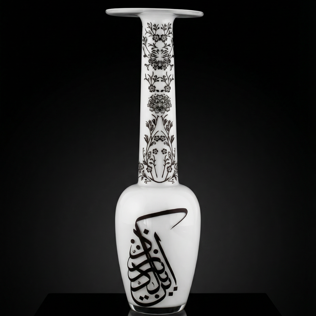 Açık renk arka planda form daha net okunur ve daha “galeri” hissi verir. Koyu ahşap konsol üzerinde ise cam daha ağır ve prestijli görünür; sıcak ışıkla birlikte yüzeydeki derinlik daha rafine bir hâl alır. Tek parça sergilemede en iyi etkiyi verir; bulunduğu alanı kalabalıklaştırmadan tamamlar.