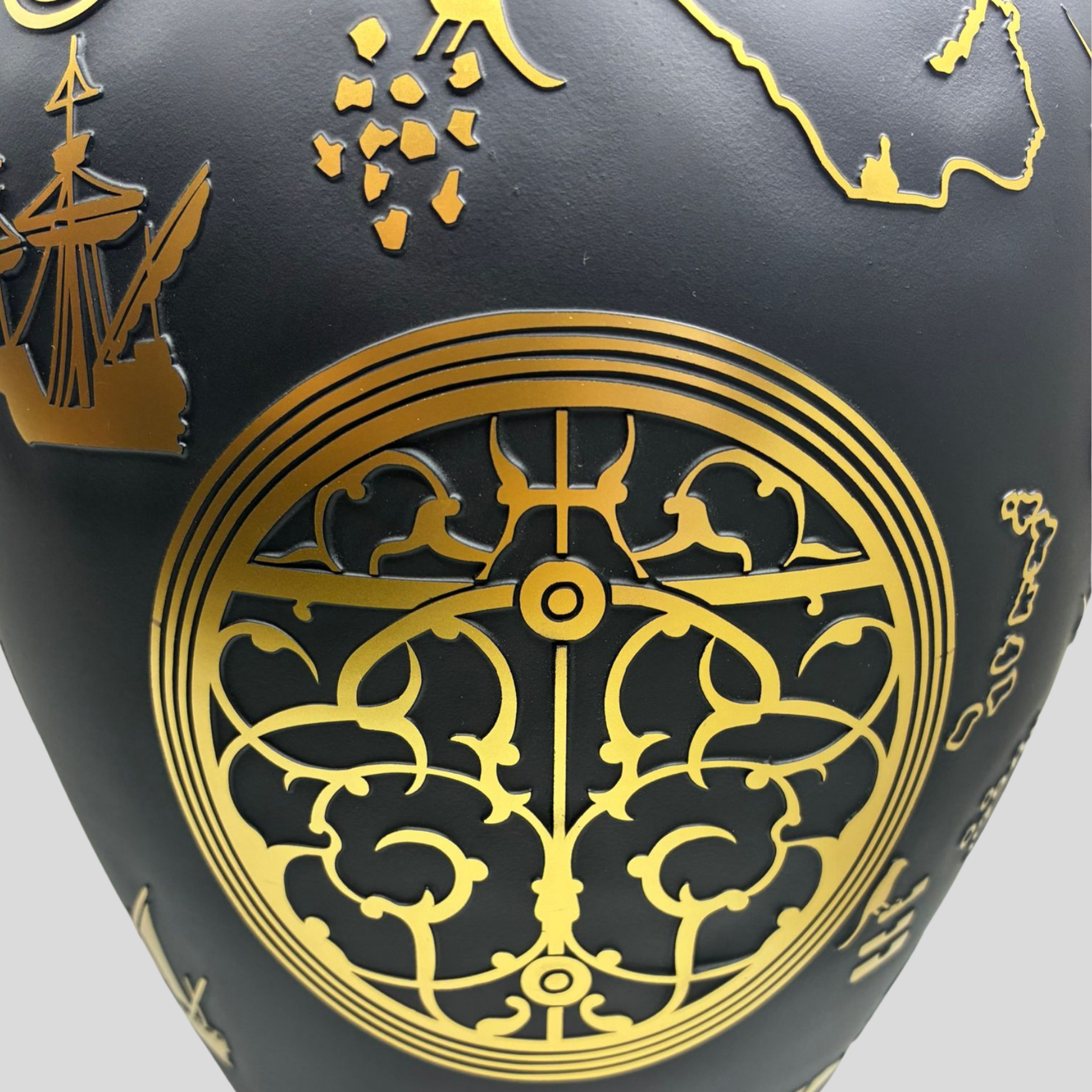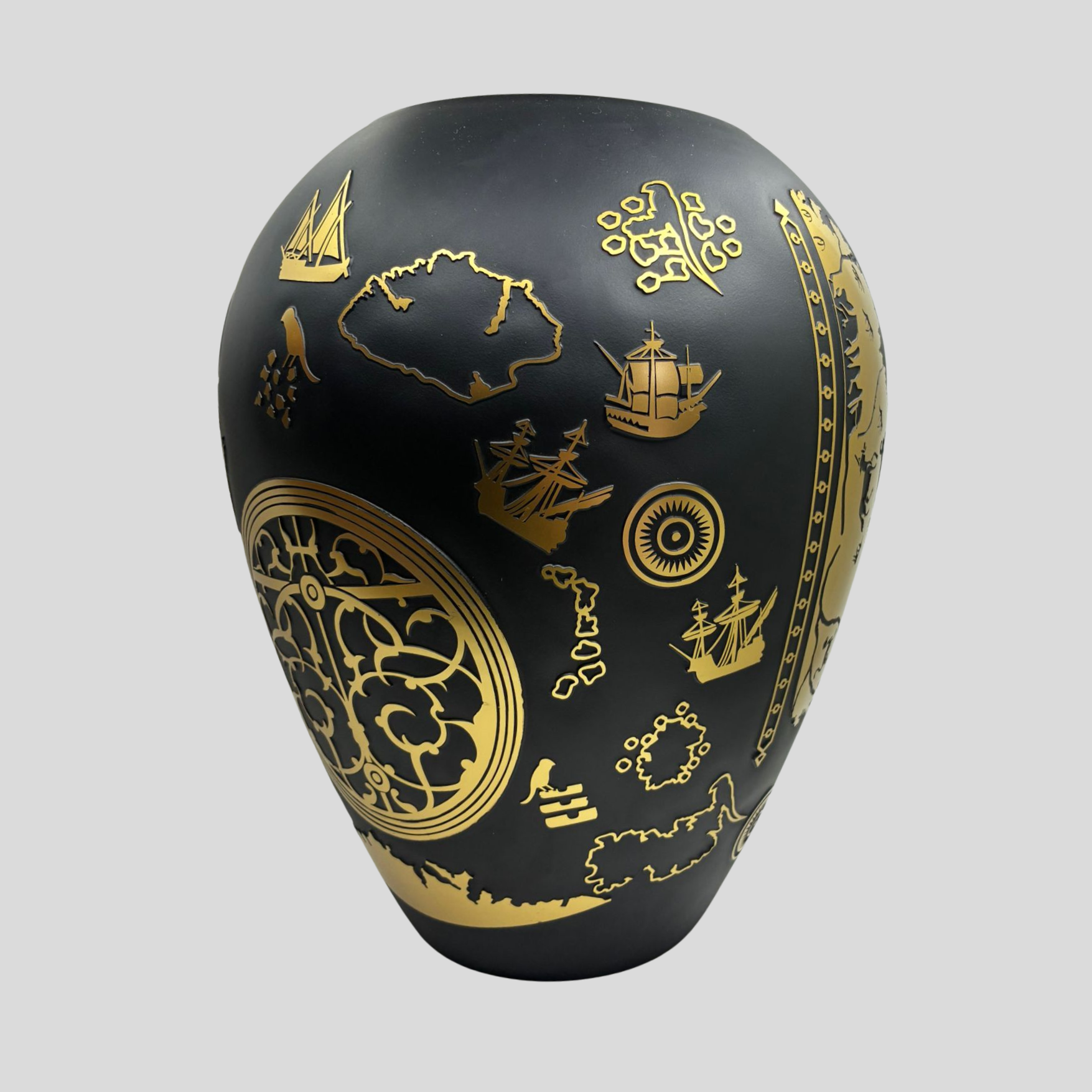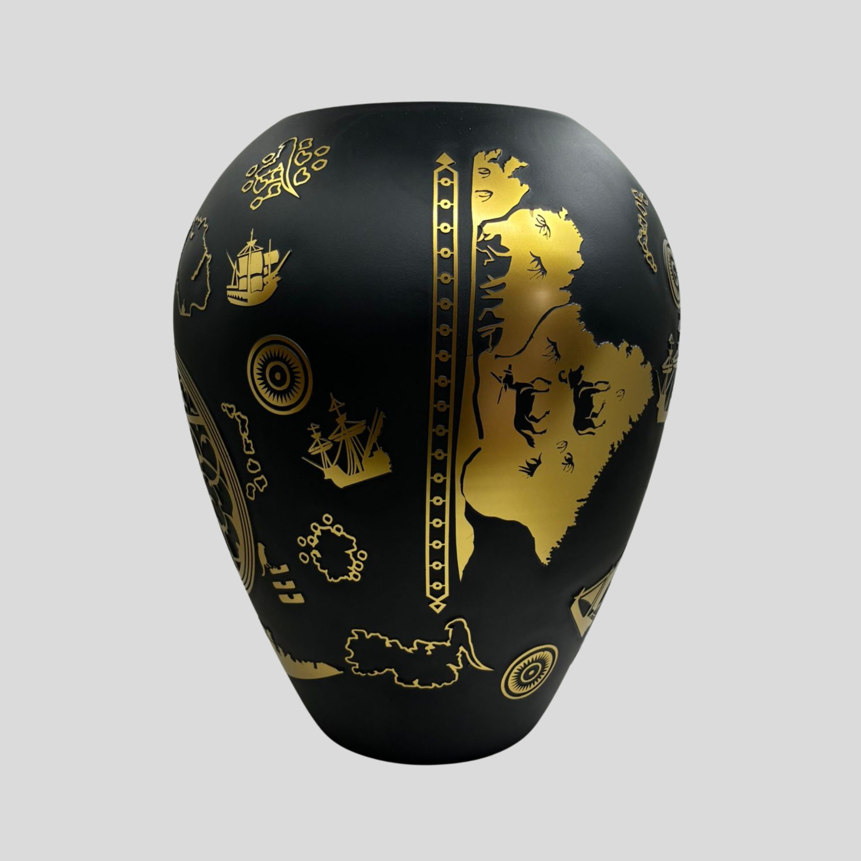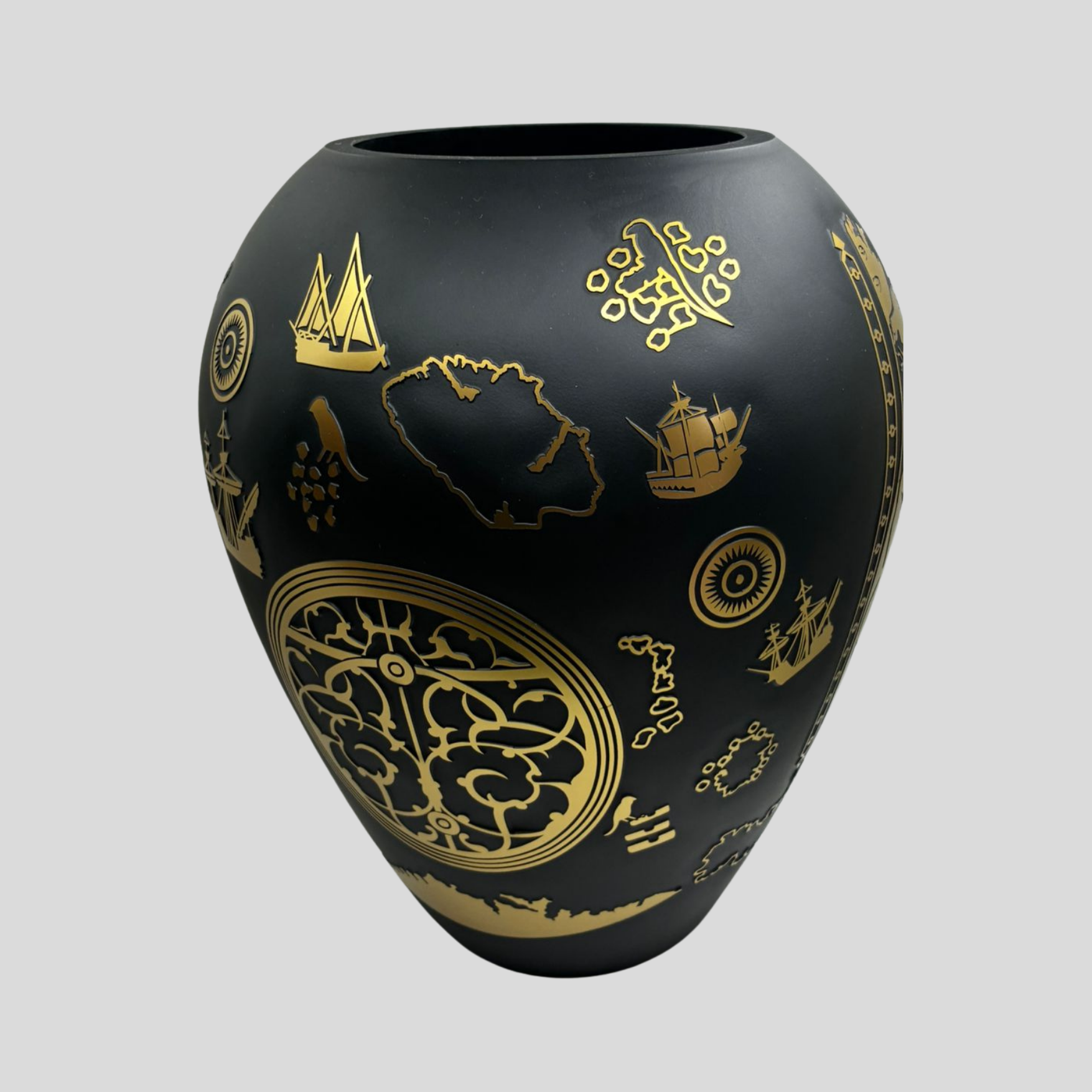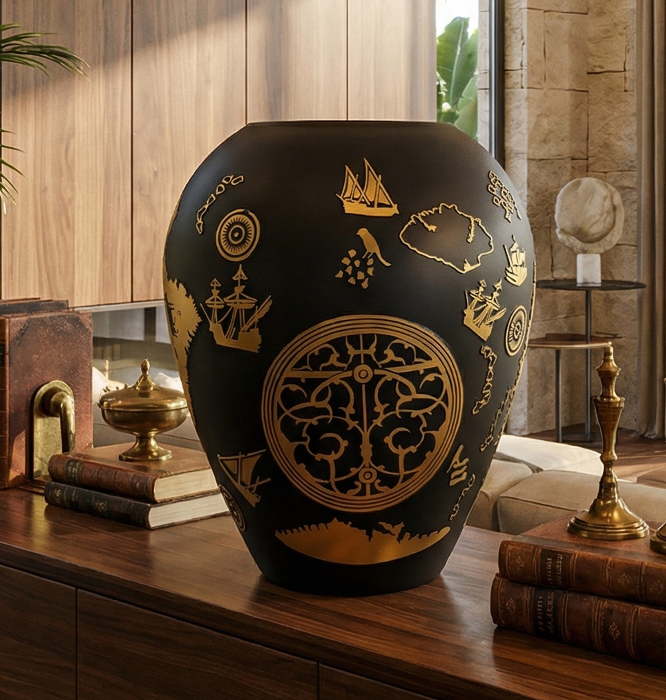 Mat siyah cam yüzey üzerine uygulanan altın görünümlü desenlerde; gemiler, harita detayları ve keşif temalı semboller yer alır. Bu kompozisyon, geçmişin denizcilik kültürünü modern bir yorumla yeniden hayat buldurur. Işıkla etkileşen yüzey yapısı sayesinde Piri Reis Küp, farklı açılardan farklı detaylar sunarak izleyiciyle güçlü bir bağ kurar.