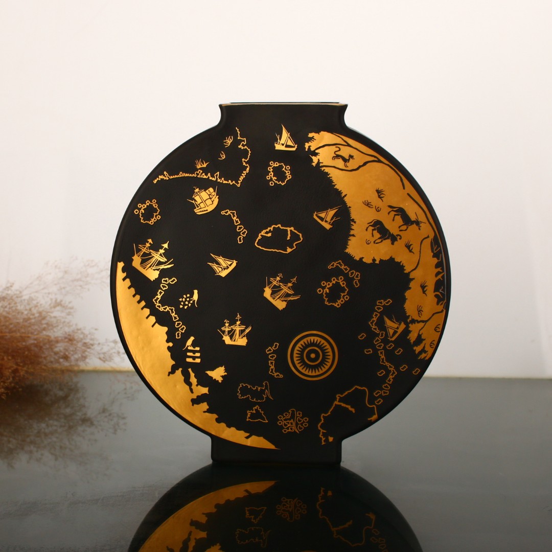Mat siyah cam üzerine altın görünümüyle işlenmiş harita çizgileri ve deniz figürleri