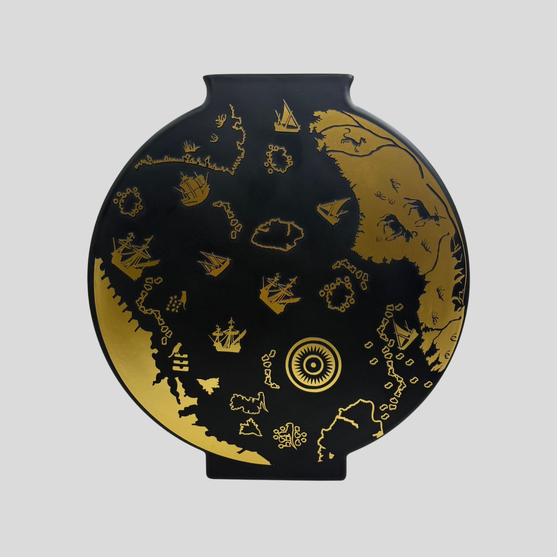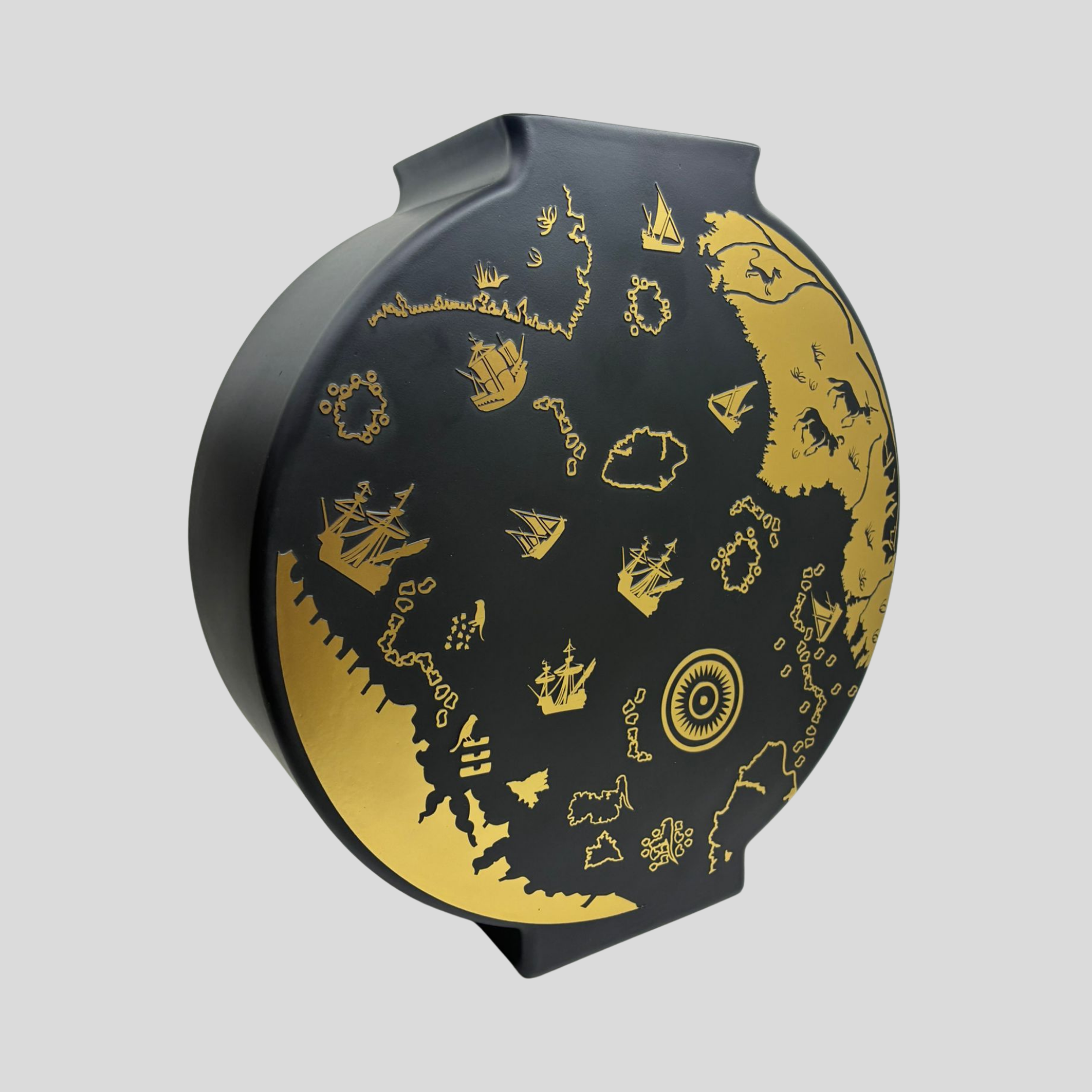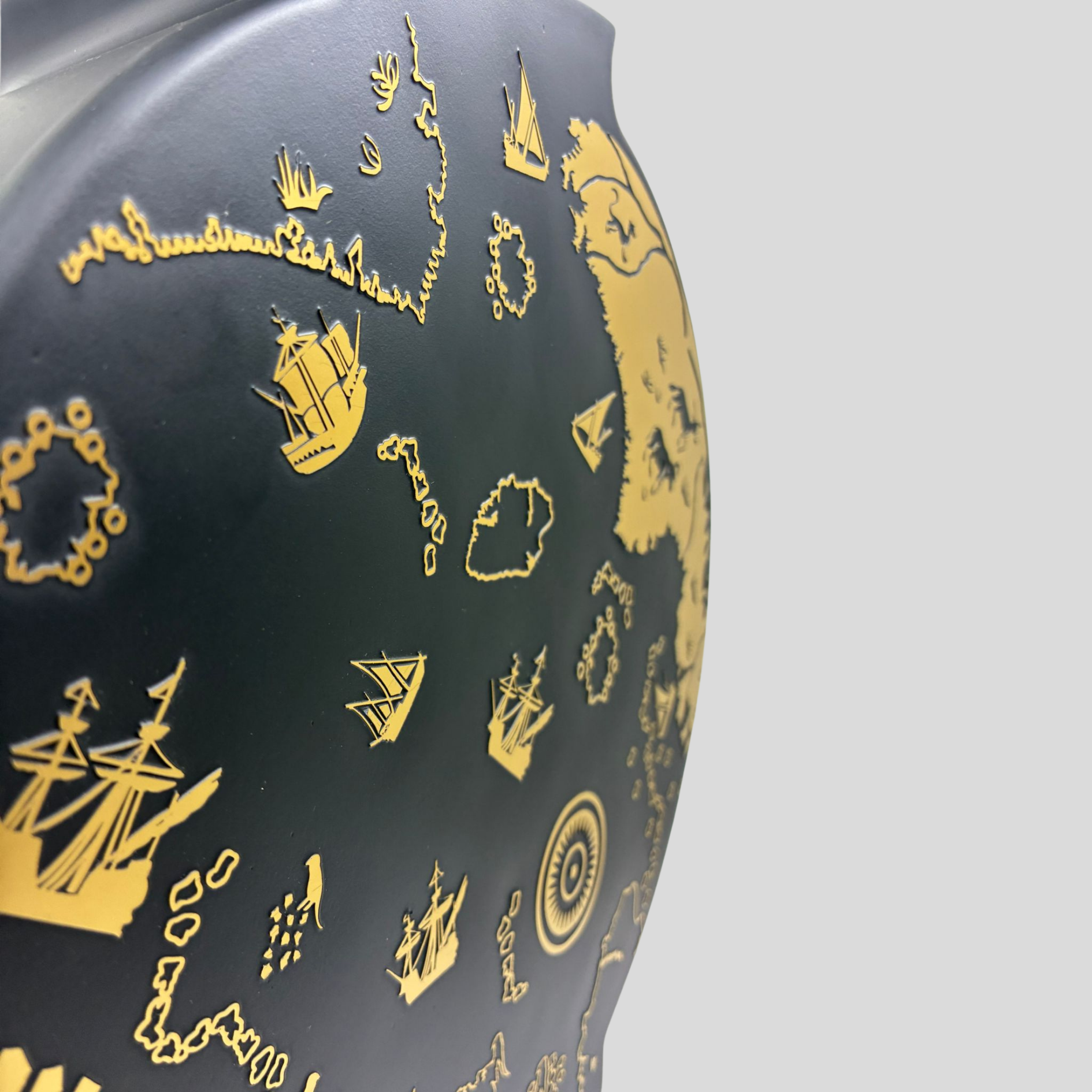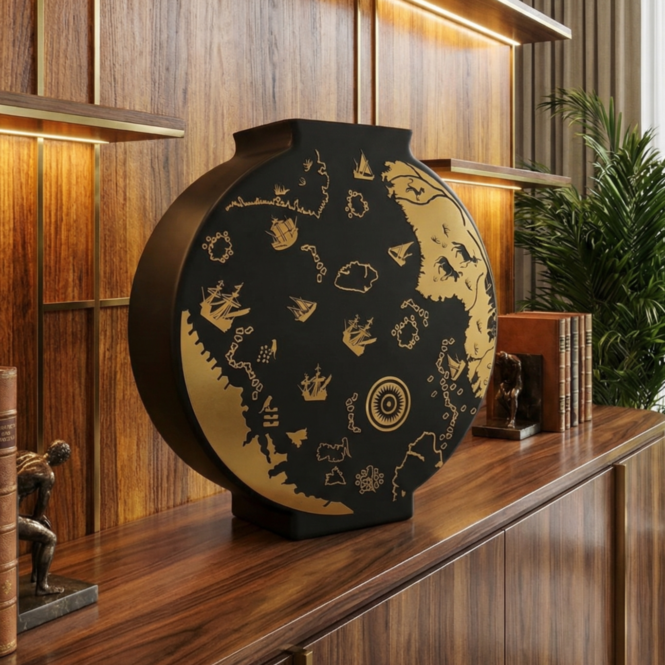 Mat siyah yüzey üzerine uygulanan altın görünümlü desenlerde; gemi figürleri, kıta siluetleri ve keşif izleri yer alır. Bu kompozisyon, geçmişin bilgi birikimini modern bir tasarım diliyle yeniden yorumlar. Işıkla birlikte değişen yüzey etkisi sayesinde Piri Reis Vazo Mat Siyah, farklı açılarda farklı detaylar sunarak dikkat çekici bir görsel deneyim oluşturur.