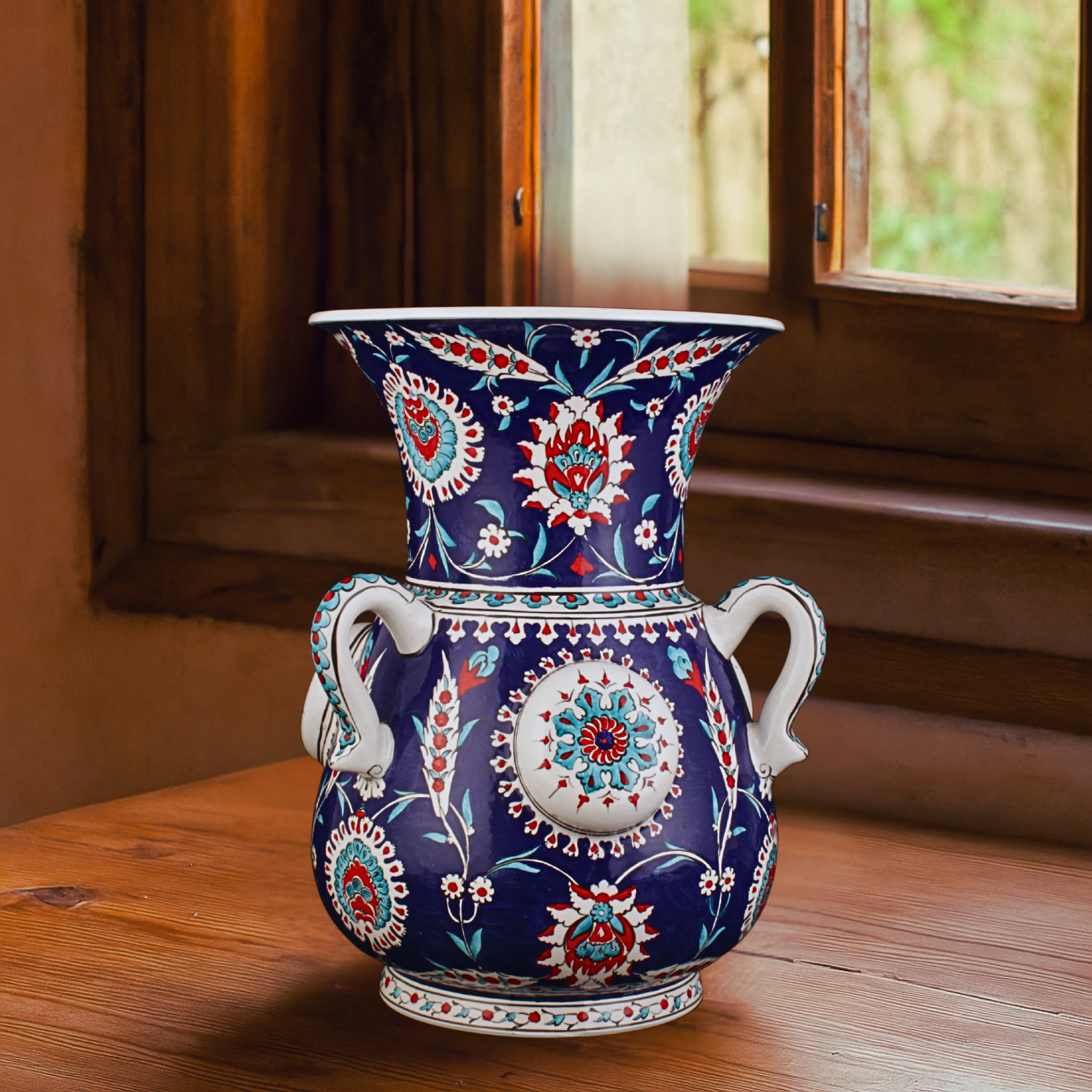 Lacivert zemin üzerinde formun bel çizgisini öne çıkararak güçlü bir siluet kurar. İnce tahrirlerle sınırlandırılan bu turkuaz bant, rûmî hatâyî ara motiflerle dengelenir; sır altı el boyamasının berraklığı, firuzenin ferah etkisini çoğaltır. Hem tek parça odak hem de çiftli yerleşimde ritmik bir bütünlük sunar.