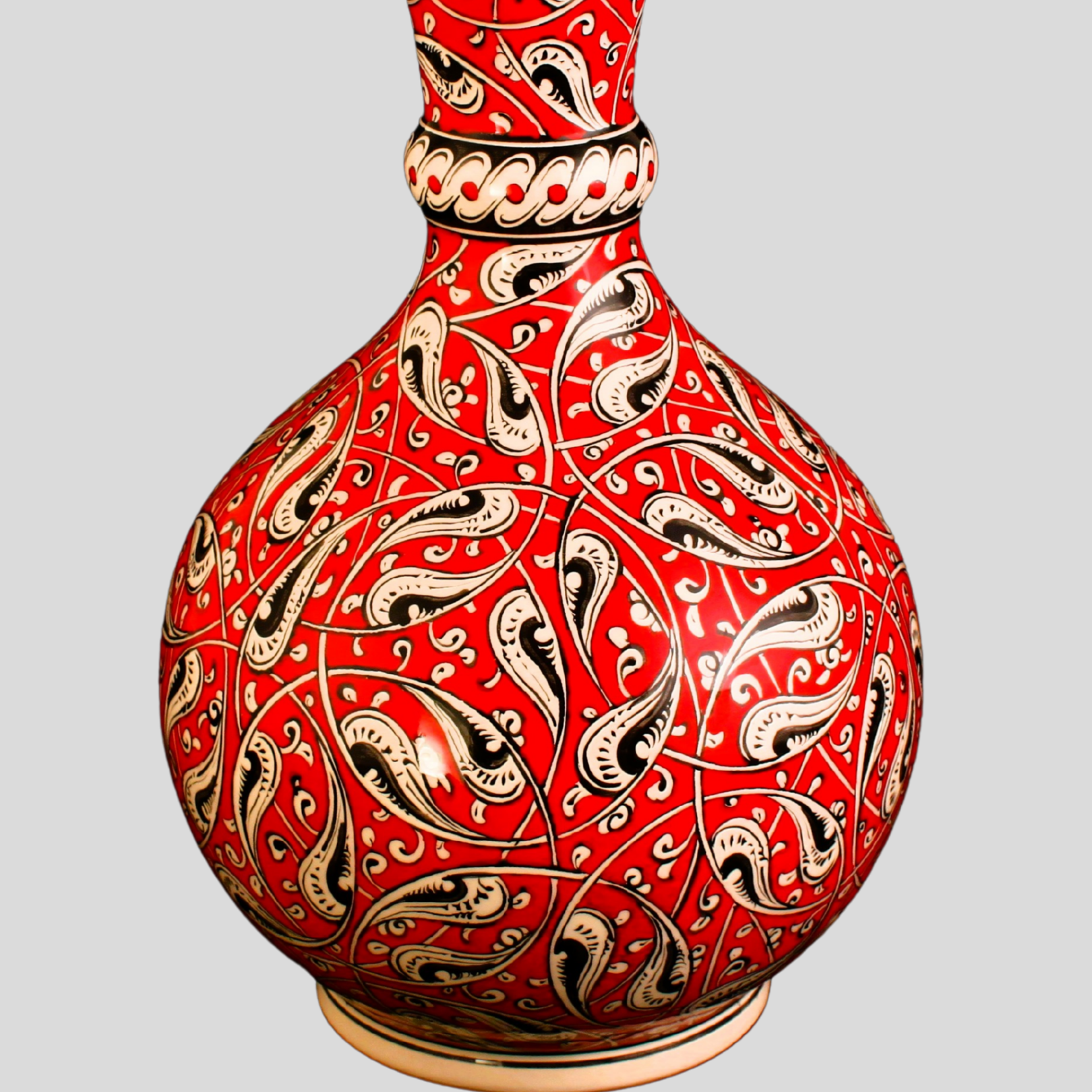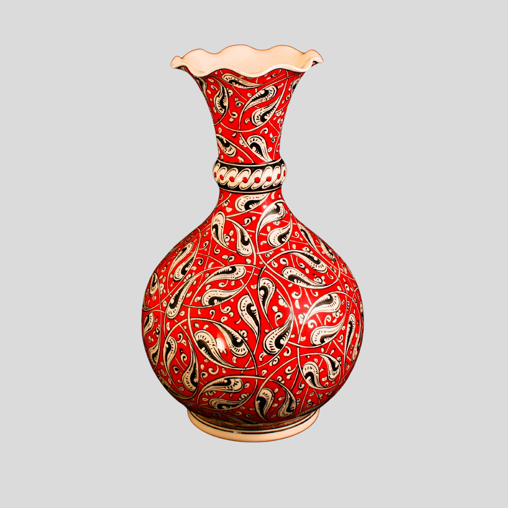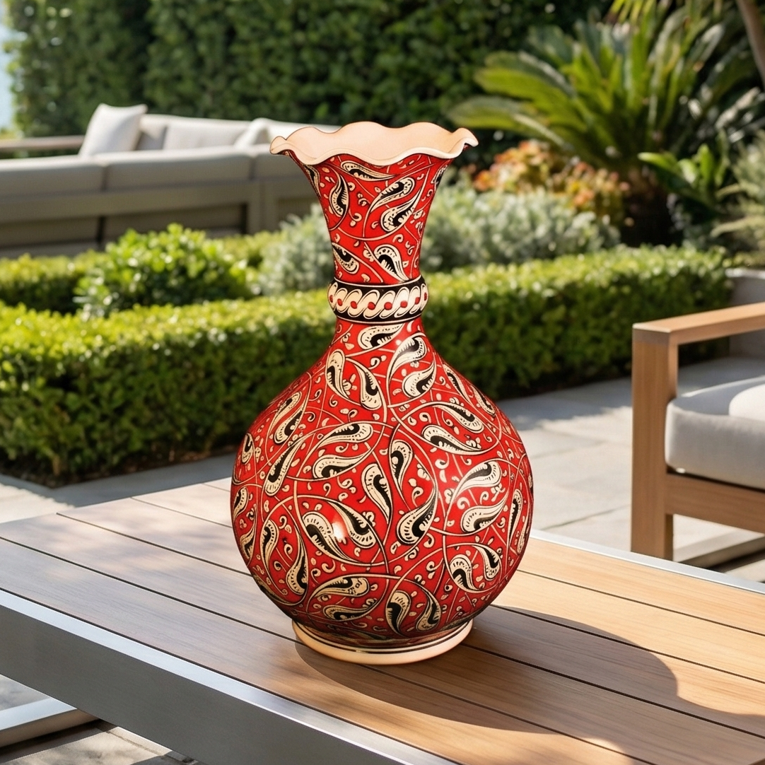 El yapımı çini vazo; kırmızı rûmî dönence kompozisyonuyla