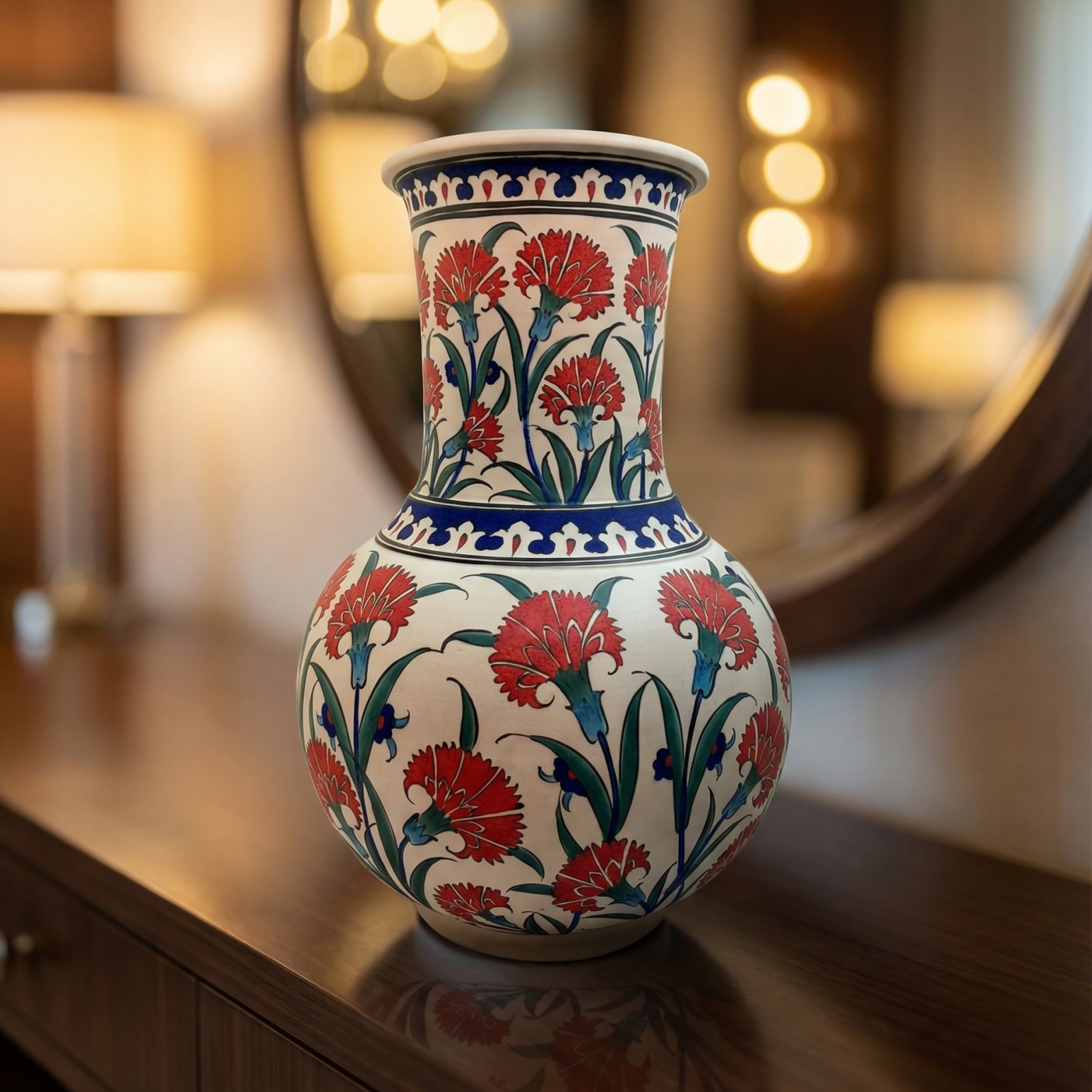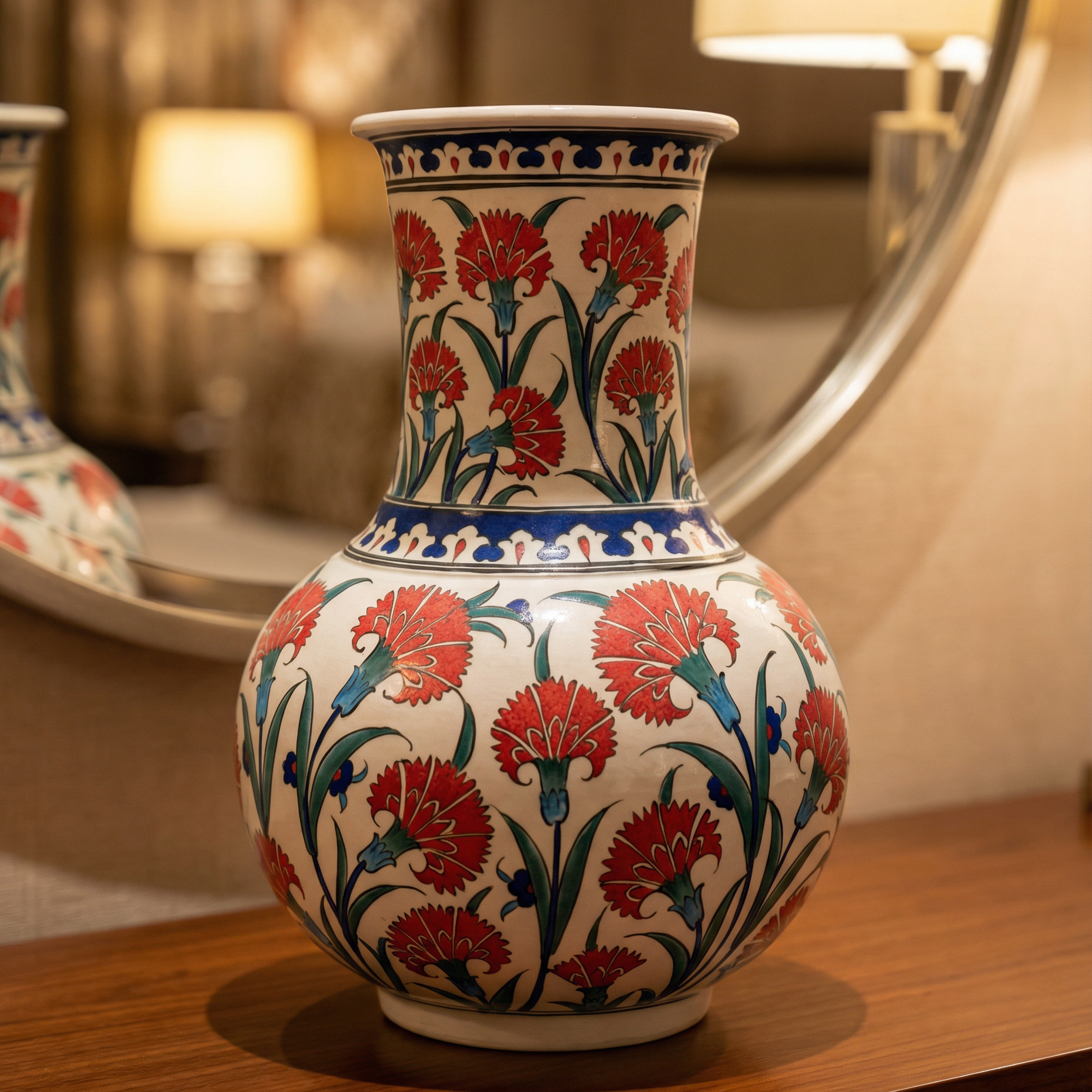 Rumî Karanfil Mat Seramik Vazo; konsol, sehpa, masa ve vitrin dekorasyonlarında zarif bir sanat objesi olarak kullanılabilir. Tek başına sergilendiğinde mekânda estetik bir merkez parça oluşturur, kuru çiçek veya dekoratif dallarla birlikte kullanıldığında dengeli bir dekoratif kompozisyon sağlar.