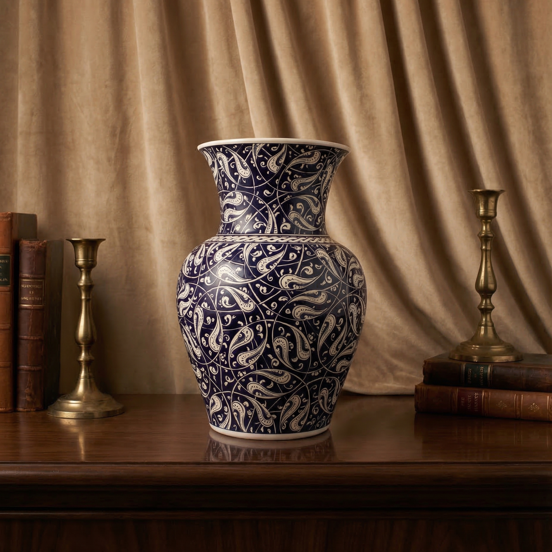 El işçiliği ile hazırlanan Rumi Seramik Vazo, yaşam alanlarında zarif ve güçlü bir dekoratif etki oluştururken aynı zamanda Anadolu sanat geleneğinin estetik mirasını yansıtan özel bir tasarımdır.