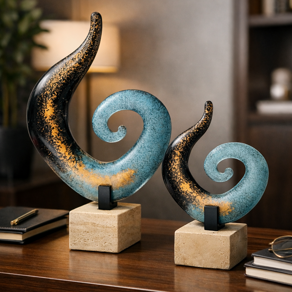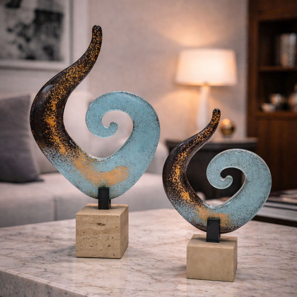 Sarmal Asalet Cam ObjeFarklı ölçülerde tasarlanmış iki parçanın birlikte oluşturduğu kompozisyon, estetik dengeyi ve hareket hissini bir araya getirir. Evlerde, ofislerde, yönetici odalarında veya prestijli yaşam alanlarında modern bir sanat objesi olarak kullanılabilir.