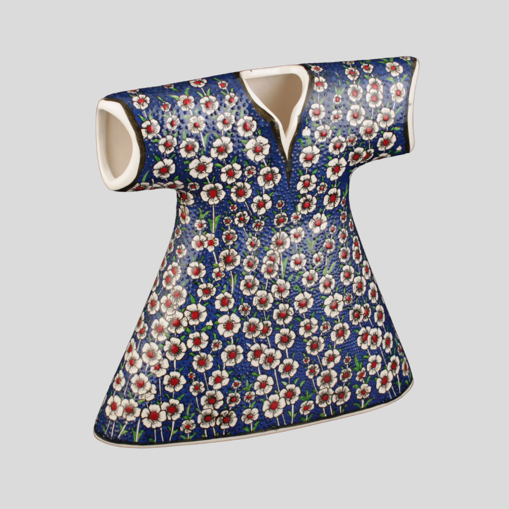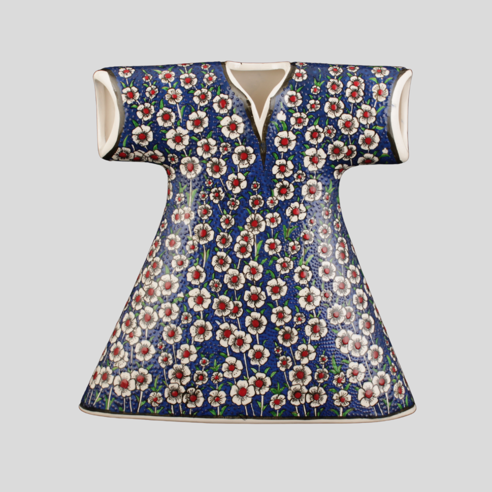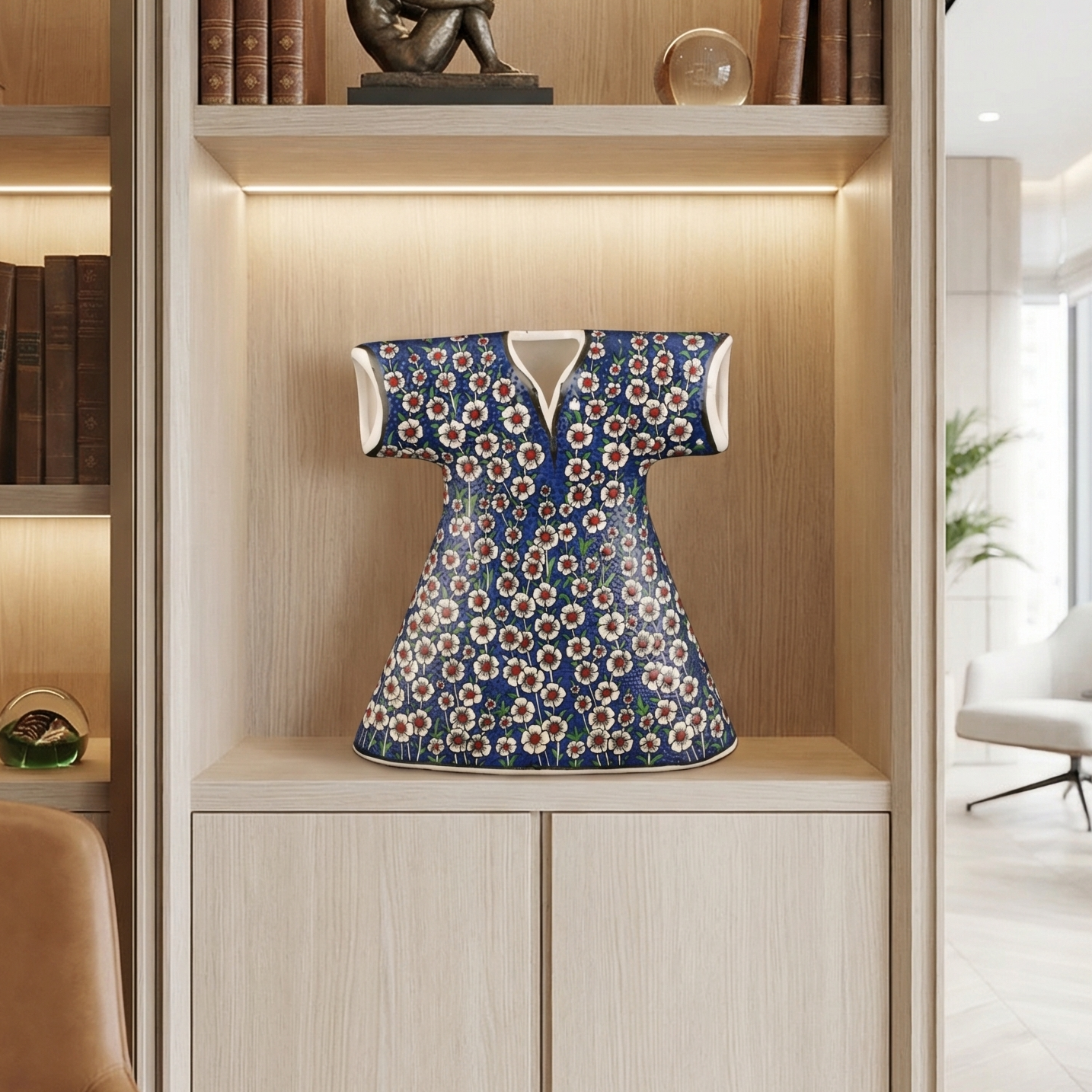 El yapımı çini kaftan obje; gece mavisi zemin üzerinde baharın taze ışıltısını taşıyan seçkin bir parça.