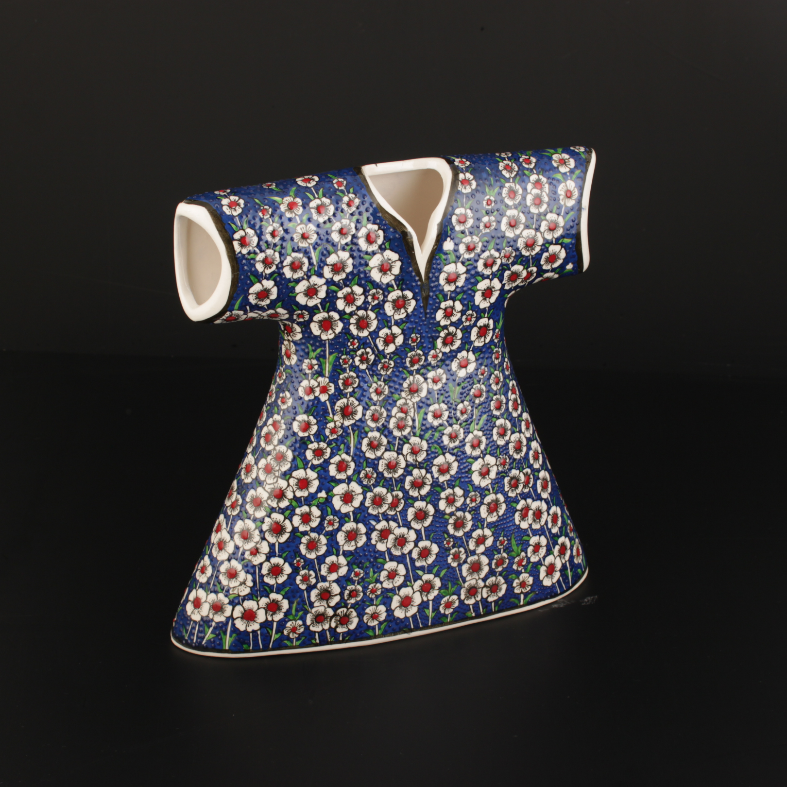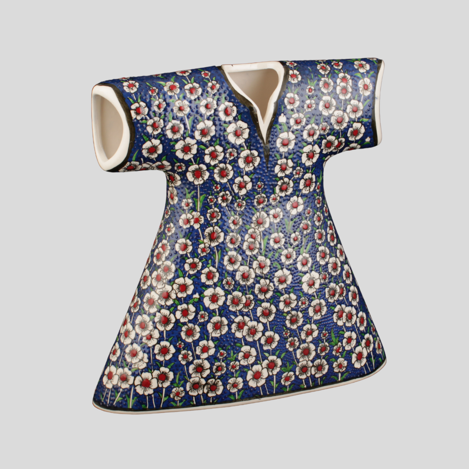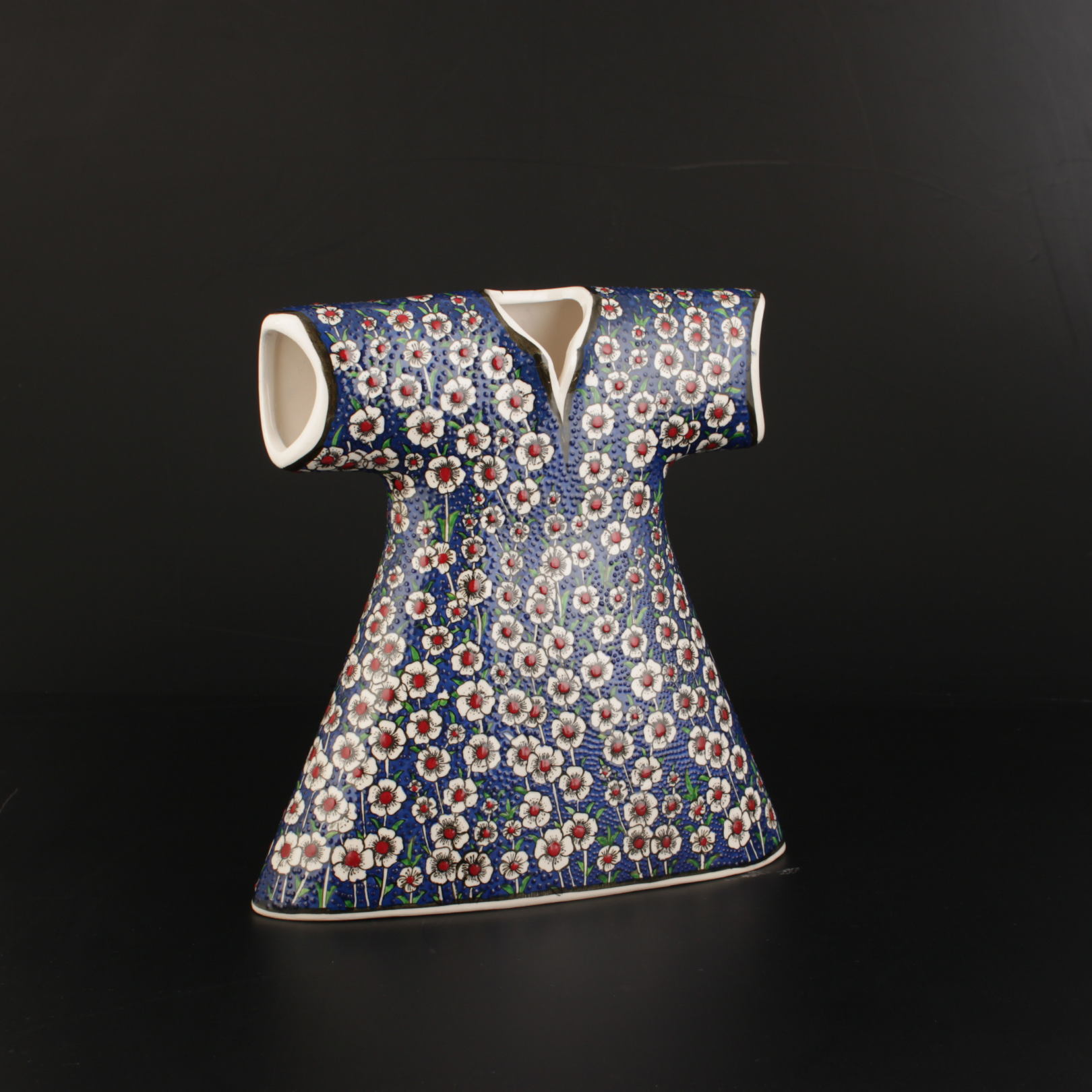 El yapımı çini kaftan obje; gece mavisi zemin üzerinde baharın taze ışıltısını taşıyan seçkin bir parça.