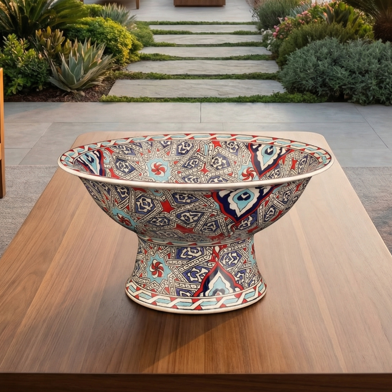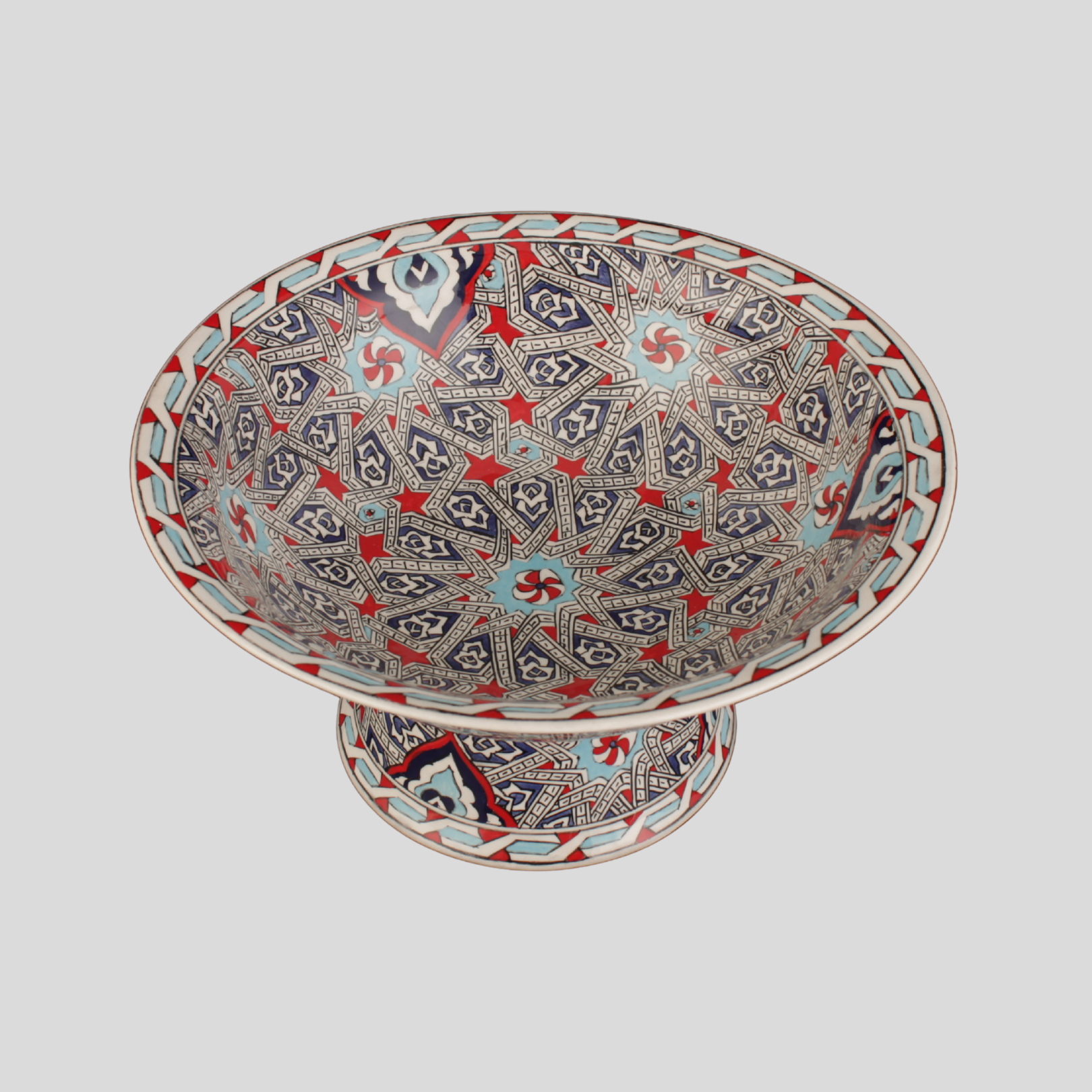 Selçuklu Kase, Anadolu Selçuklu mimarisinin yıldız geçmeli dilini yüksek bir kase formunda çağdaş bir sadelikle yorumla geometrik ritim, formun dengeli oranlarıyla buluşur; mekâna hem tarihî derinlik hem de seçkin bir estetik katar. Her parça, ustasının elinde tek tek şekillenir ve elde dekore edilir.