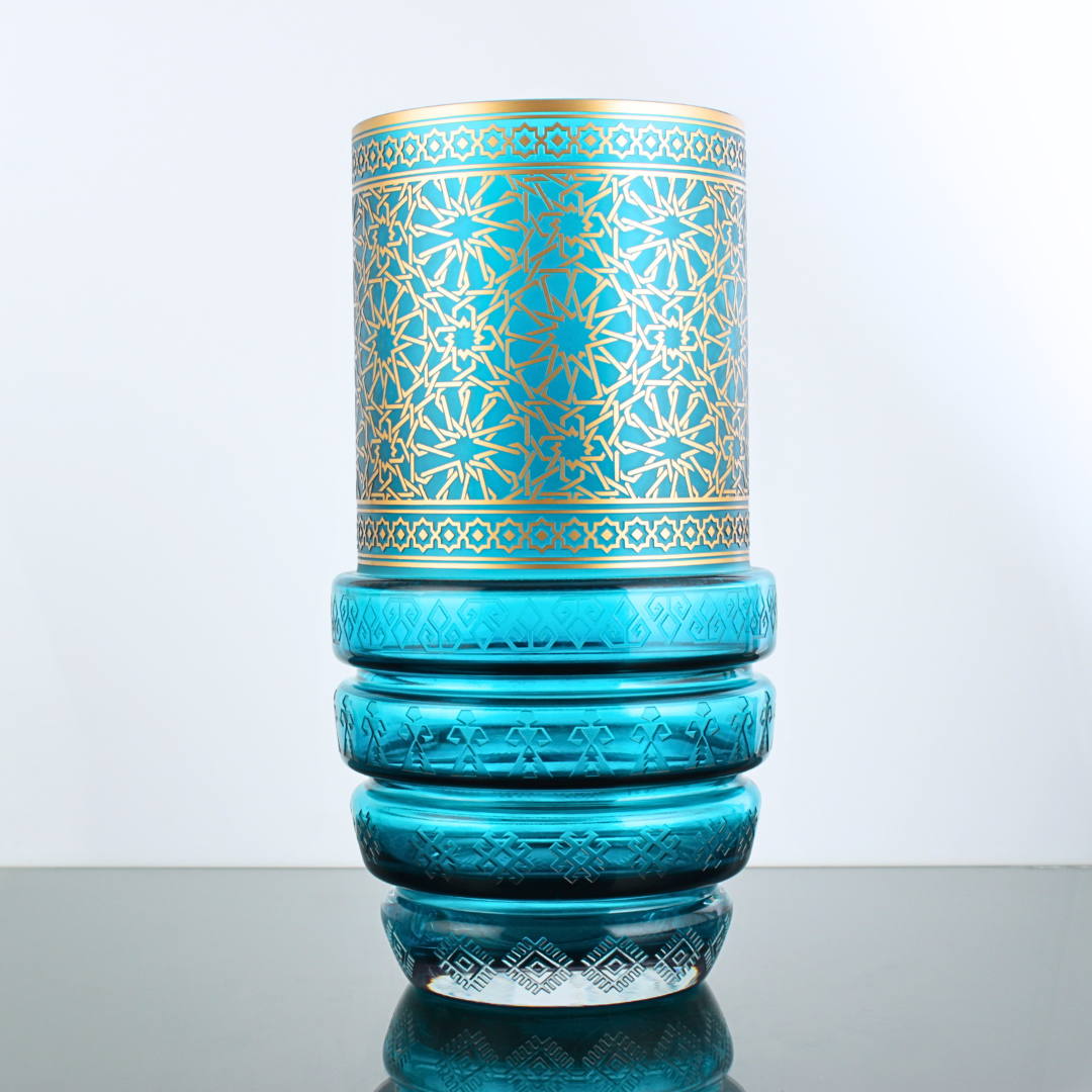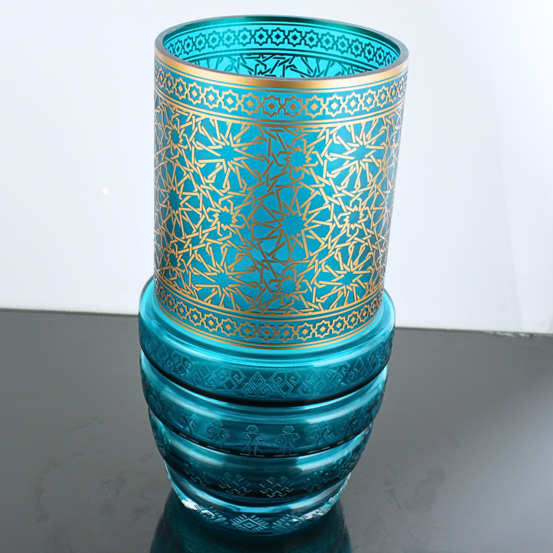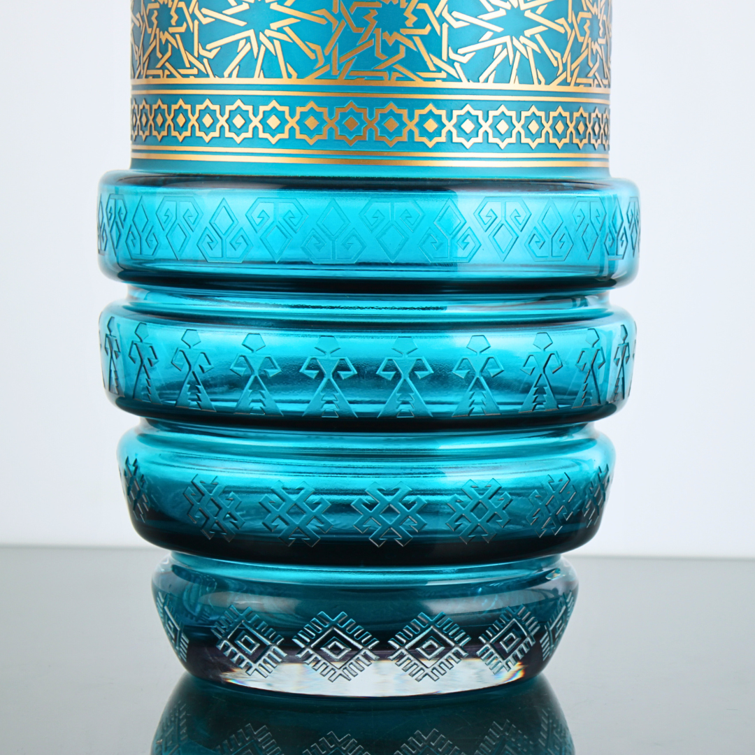 Her parça atölyede özenle hazırlanır;Selçuklu Turkuaz Vazo el yapımı bir Lasede tasarımı.