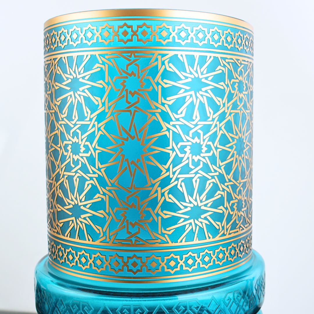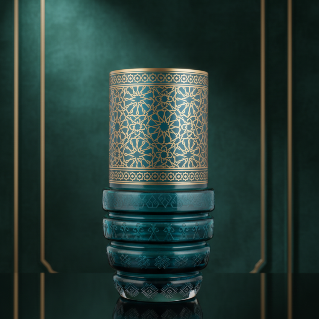 Koyu ahşap yüzeylerde daha ağır ve “premium” bir duruş kazanır; sıcak ışık altında altın çizgiler daha rafine görünür. Açık ton raf ve nişlerde ise yeşil cam daha canlı okunur, geometrik desen dili daha belirginleşir.