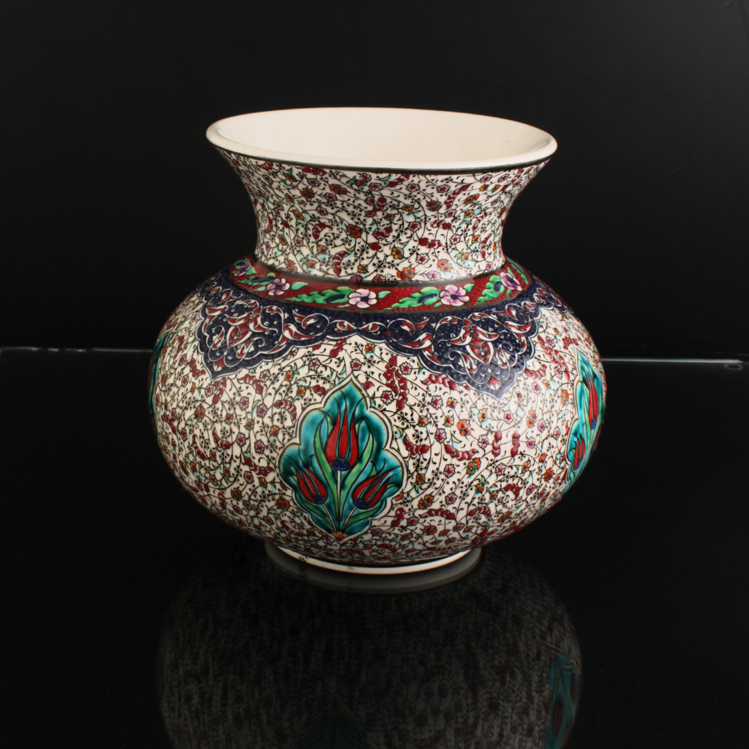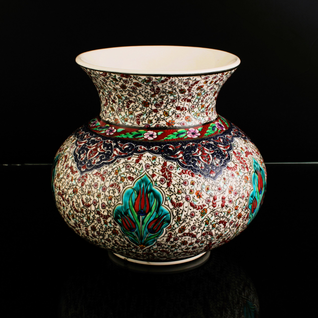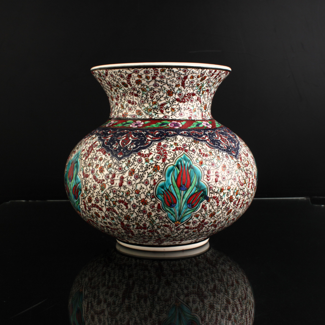 Klasik İznik üslubunun mavi, turkuaz ve kırmızı tonlarıyla bezenen desenler; ışığı zarifçe yansıtan bir ritim oluşturur. Usta çini sanatçılarının el işçiliğiyle tek tek şekillendirdiği detaylar, her bir vazoyu benzersiz kılar. Şemseli Lâle Vazo, gelenekselin ruhunu modern formla buluşturan, kültürel değeri yüksek bir sanat eseridir.