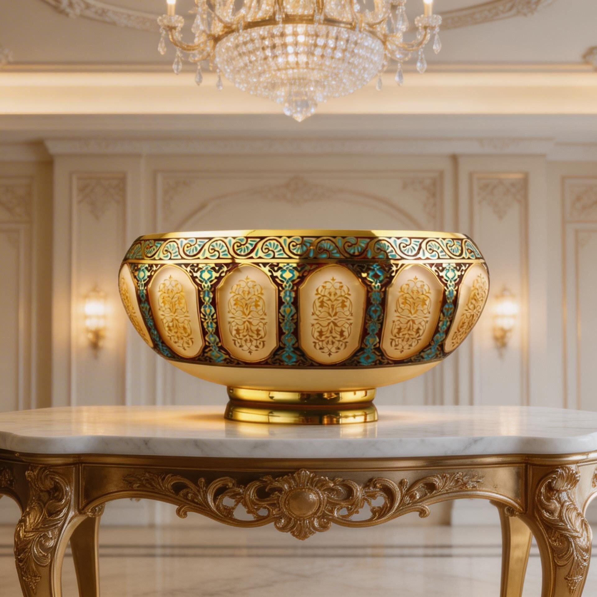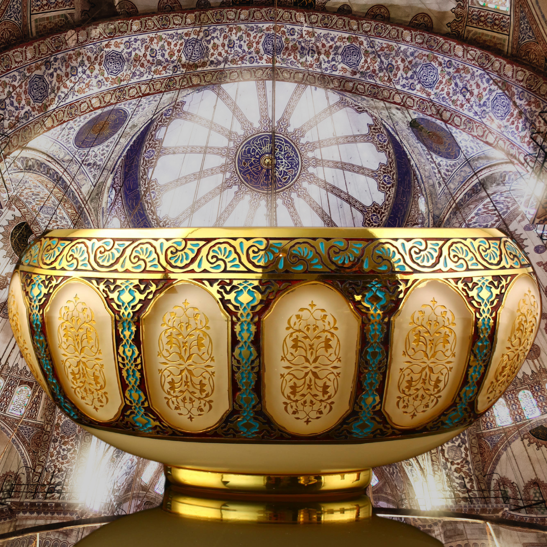 Sultanahmet Gondol, İstanbul’un tarihî zarafetini turkuaz, altın ve krem tonlarının dengeli uyumuyla buluşturan seçkin bir tasarımdır. Geniş ve yatay formu, klasik gondol anlayışını daha güçlü ve estetik bir duruşla yorumlarken; cam yüzey üzerinde işlenen ince bezemeler ürüne yalnızca dekoratif bir görünüm değil, aynı zamanda kültürel bir derinlik kazandırır. Turkuaz geçişler, klasik çini geleneğinin ferah etkisini taşırken; altın detaylar esere ihtişamlı ve asil bir karakter verir.