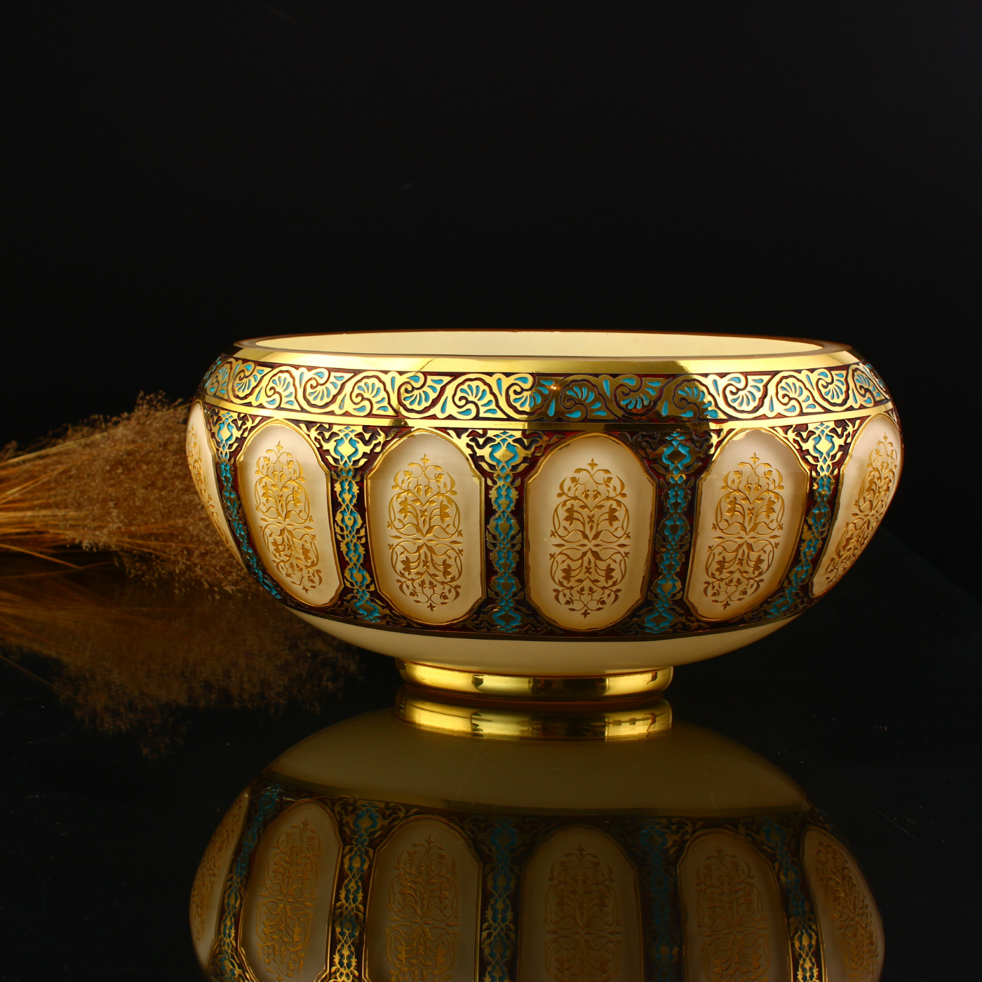 Bu ürün cam malzemeden üretilmiş olup altın detaylı dekoratif işçilikle zenginleştirilmiştir.
