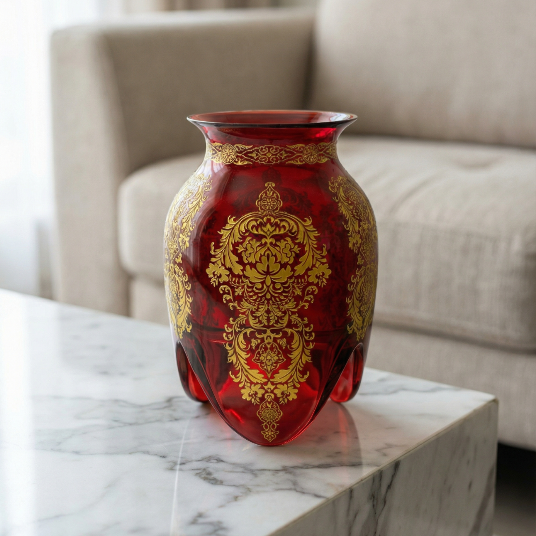 Koyu ahşap konsol üzerinde altın motifler daha prestijli ve belirgin görünür; sıcak ışık altında ışıltı daha rafine bir hâl alır. Açık renk arka planda ise form daha net okunur ve parça “galeri” etkisi verir. Tek parça sergilemede en iyi etkiyi verir; kalabalık aksesuar istemez.