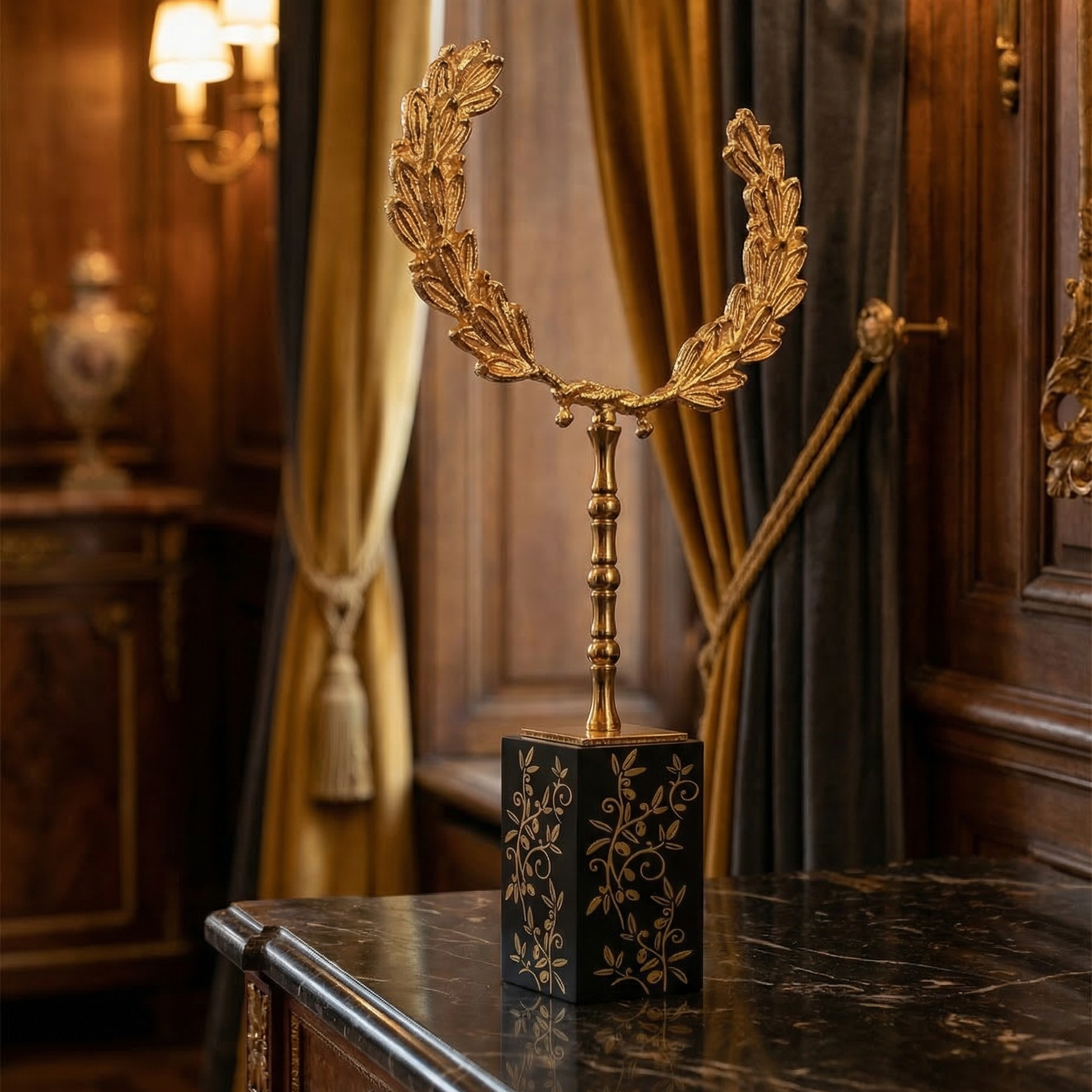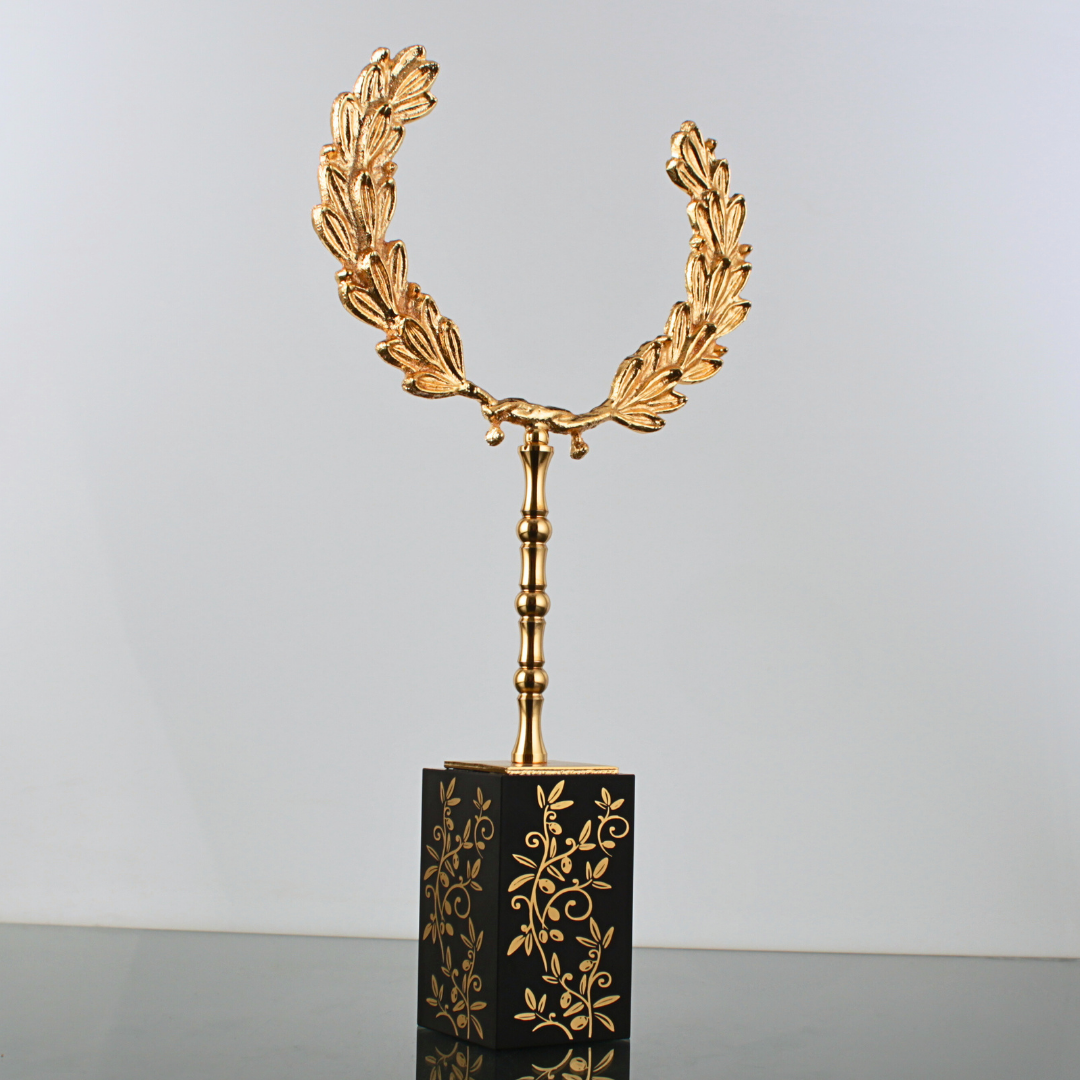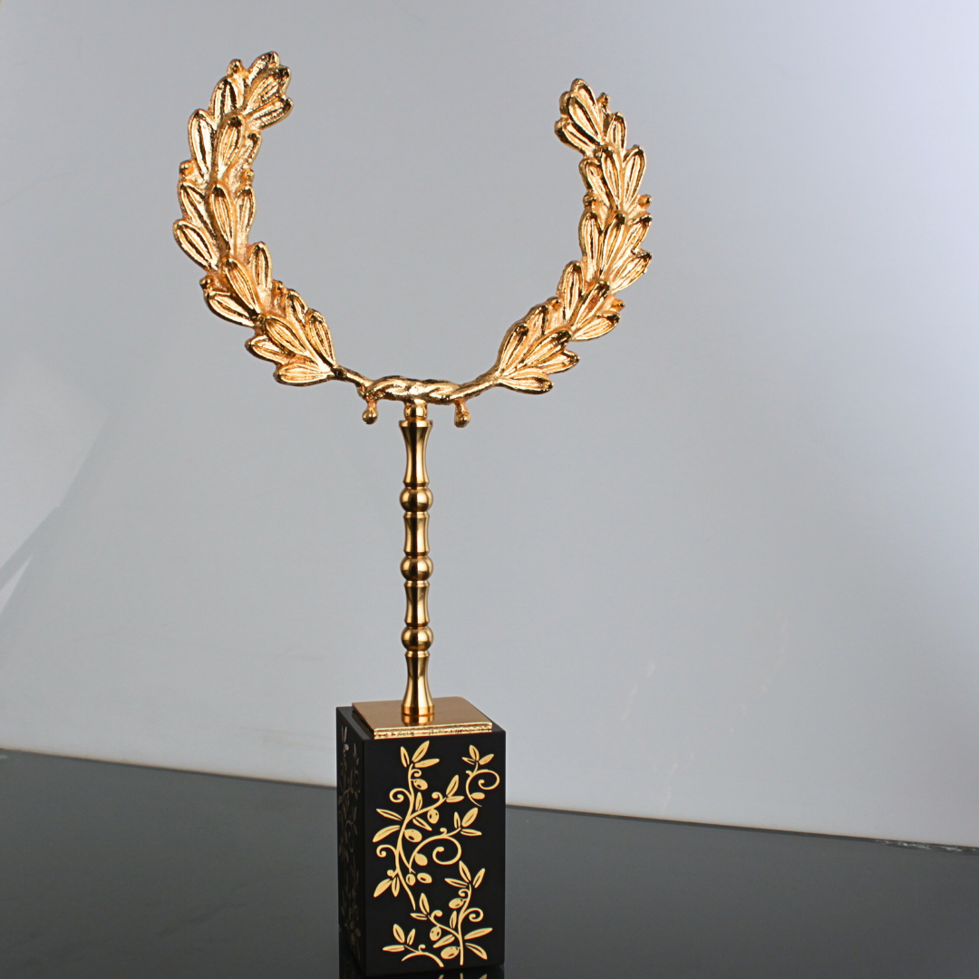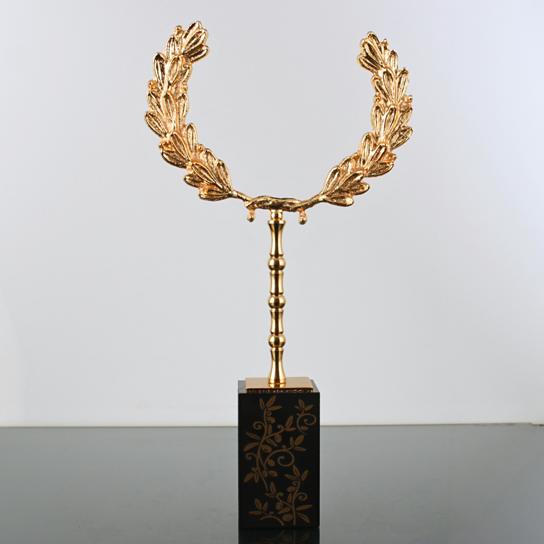 Koyu ton masa üstlerinde metal tacın tonu daha prestijli görünür; açık renk yüzeylerde ise daha modern ve net bir kontrast oluşturur. Resepsiyon bankosunda dikkat çeken heykelsi bir vurgu, toplantı odasında masanın merkezinde ise sakin ama güçlü bir temsil detayı gibi durur.