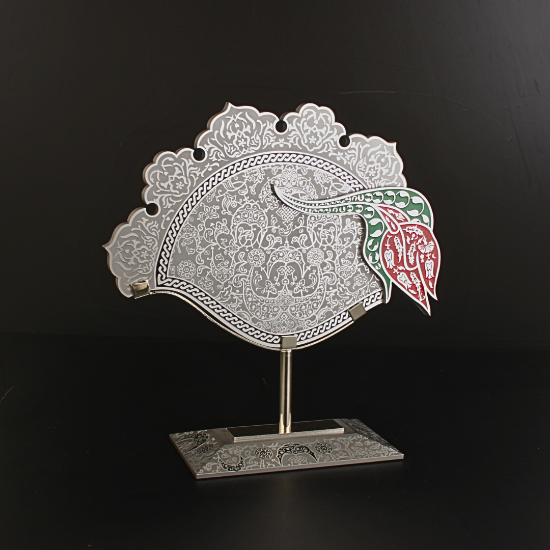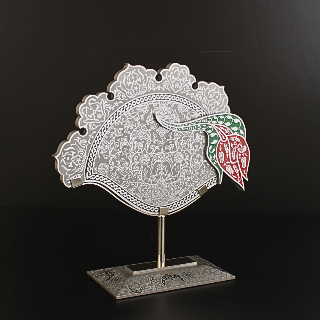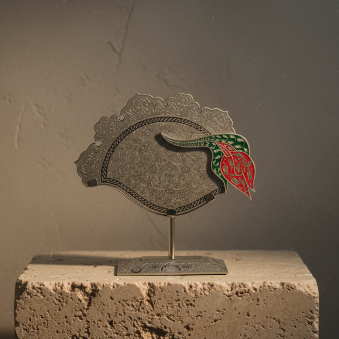 Ters Lale Cam Obje Gümüş Bu eser, özel kesim cam formu ve üzerine el işçiliğiyle işlenen geleneksel motifleriyle zarafet ve anlamı bir araya getirir. Ters lale figürü, yalnızca estetik bir tercih değil; sembolik değeriyle de kompozisyonun merkezinde yer alır. İstanbul’un simgelerinden lale motifi, geçmişten bugüne uzanan kültürel bir hafızayı çağırırken; metal ayak, eseri sergilenebilir bir “masaüstü imza parça”ya dönüştürür.