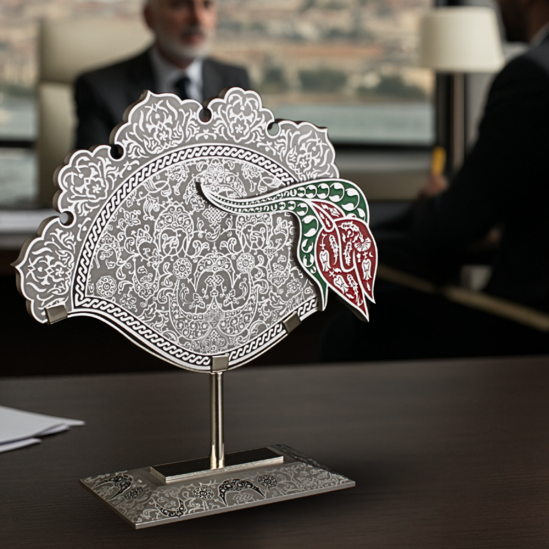 Yönetici masasında “anlamı olan obje” etkisi kurar; metal ayağı sayesinde düzenli ve net görünür. Konsolda sıcak aydınlatmayla cam yüzey daha derin görünür, vitrinde ise motiflerin katmanı daha belirginleşir ve koleksiyon hissi yükselir.