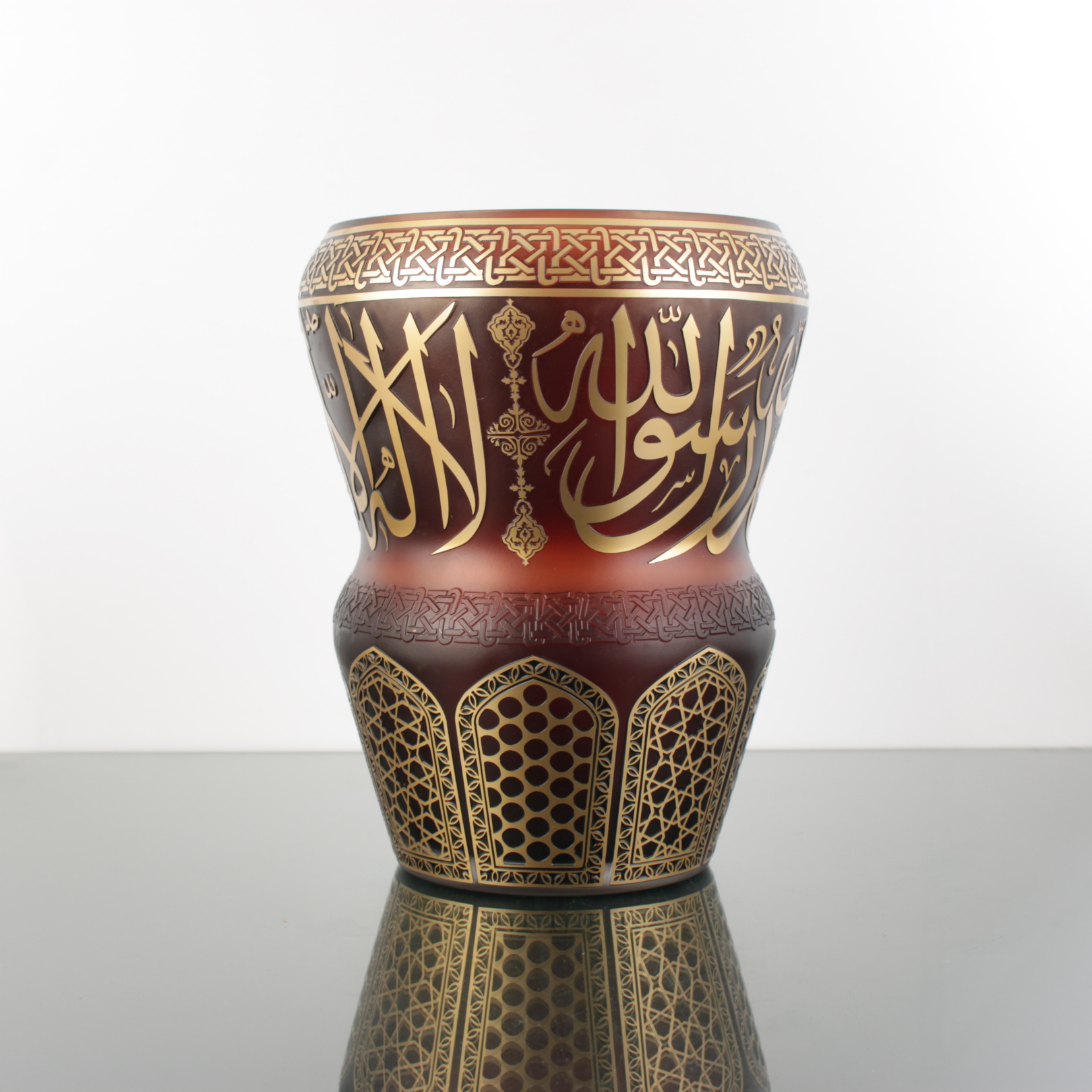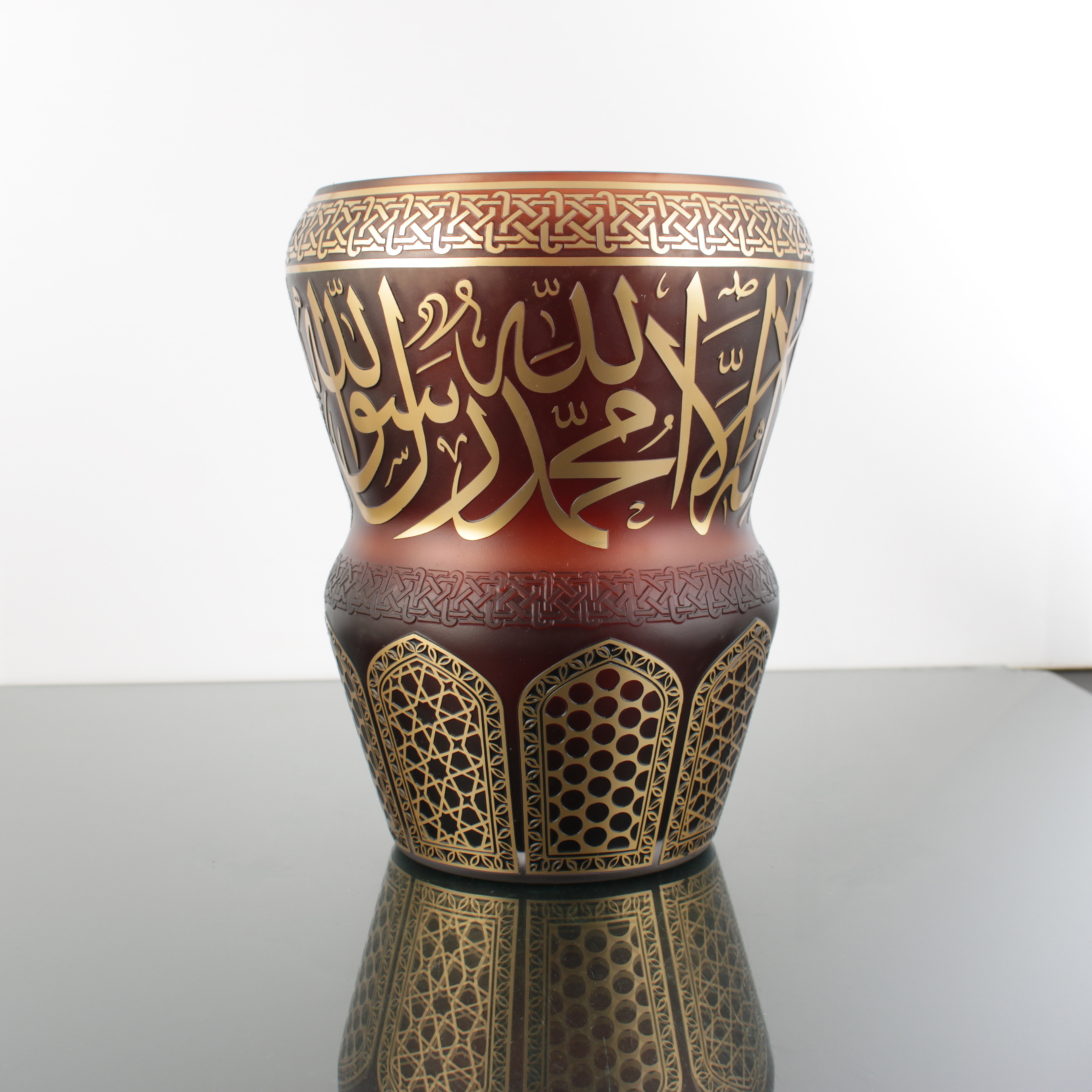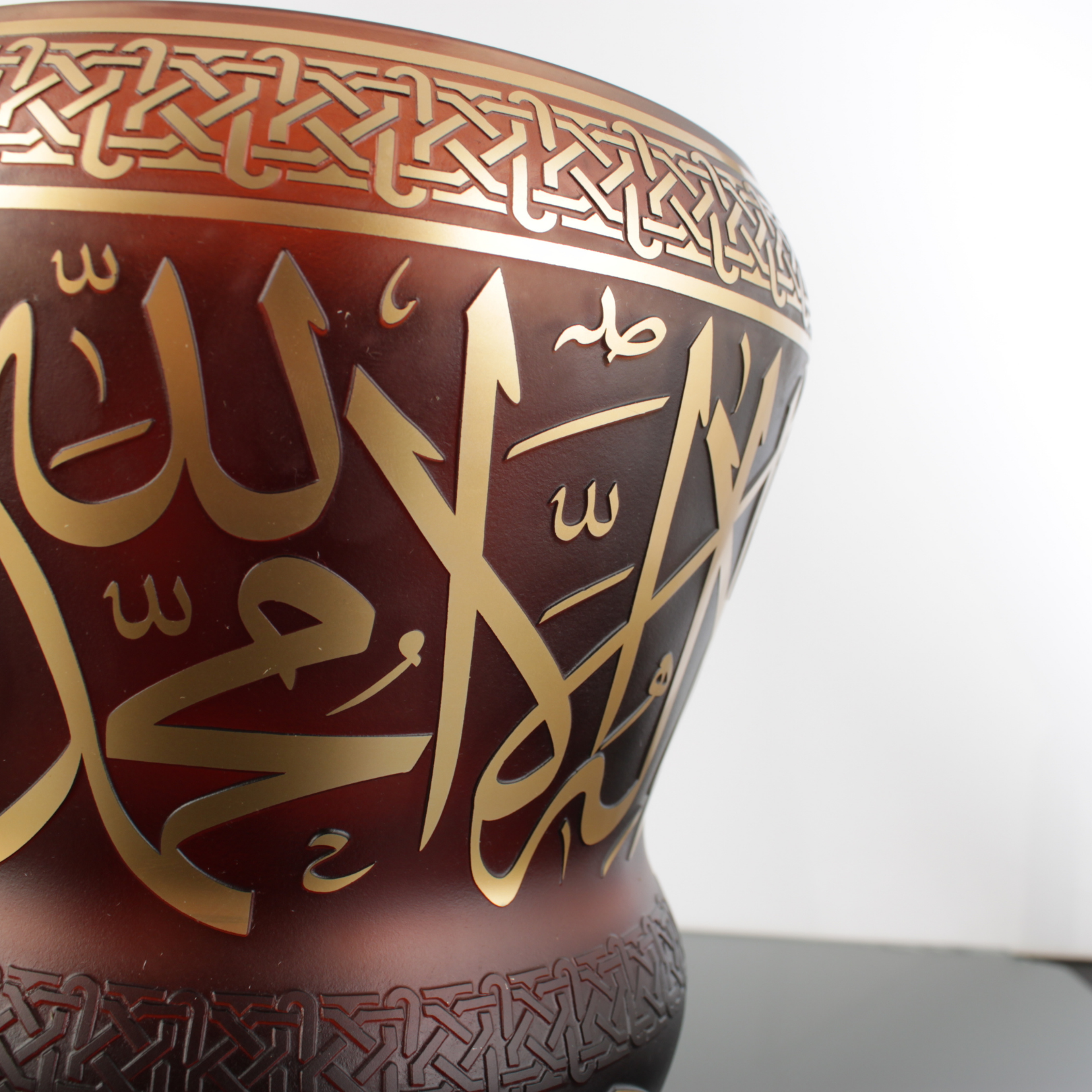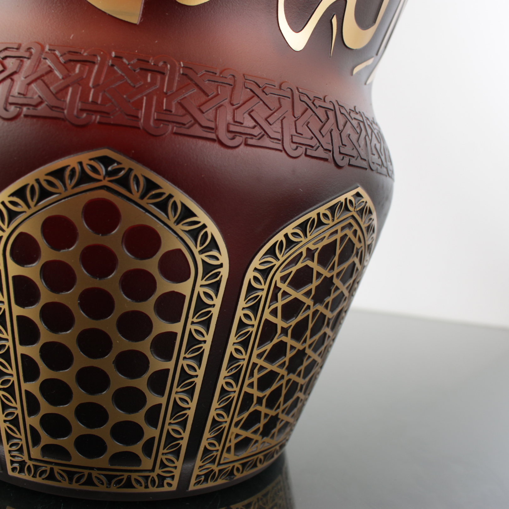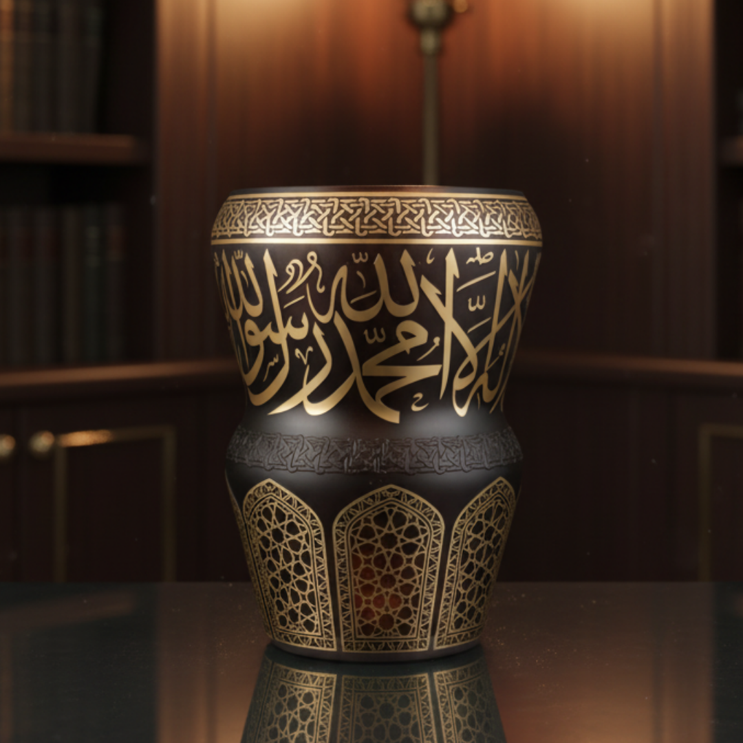 Koyu ahşap bir konsol üzerinde kahverengi zemin daha “derin” görünür; sıcak ışık altında altın boya yazı ve bordürler daha belirginleşir. Açık tonlu raf ve nişlerde ise siluet daha netleşir, vazo modern bir galeri etkisi verir.