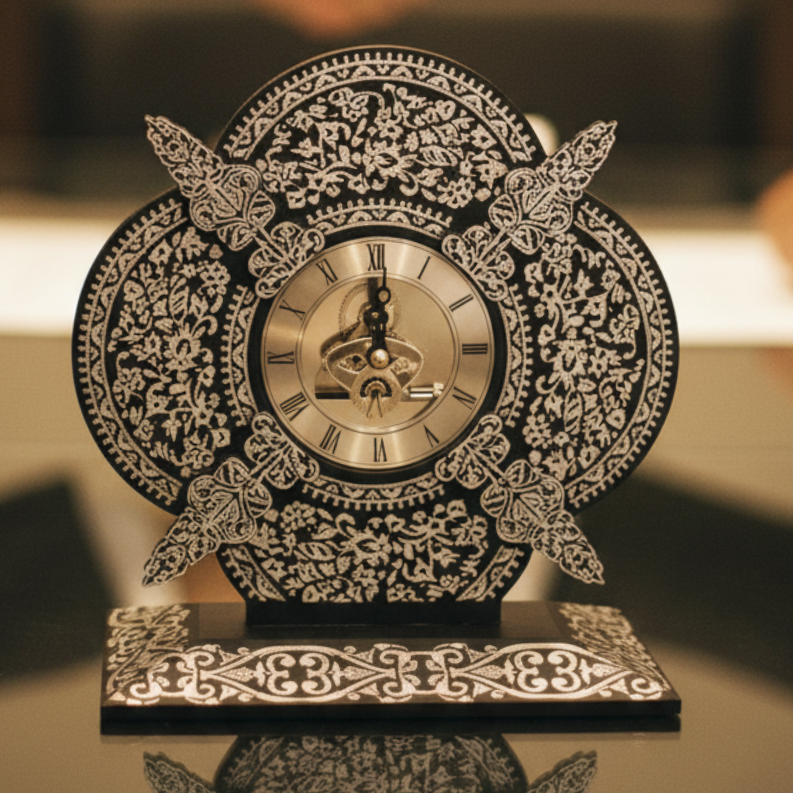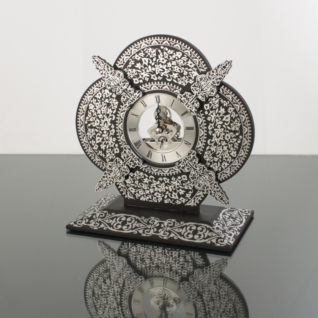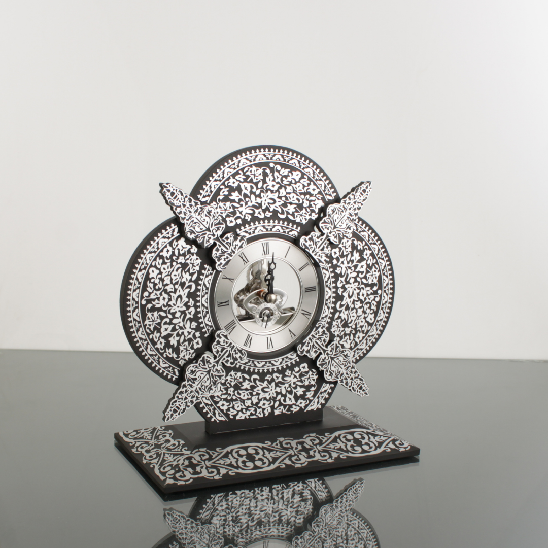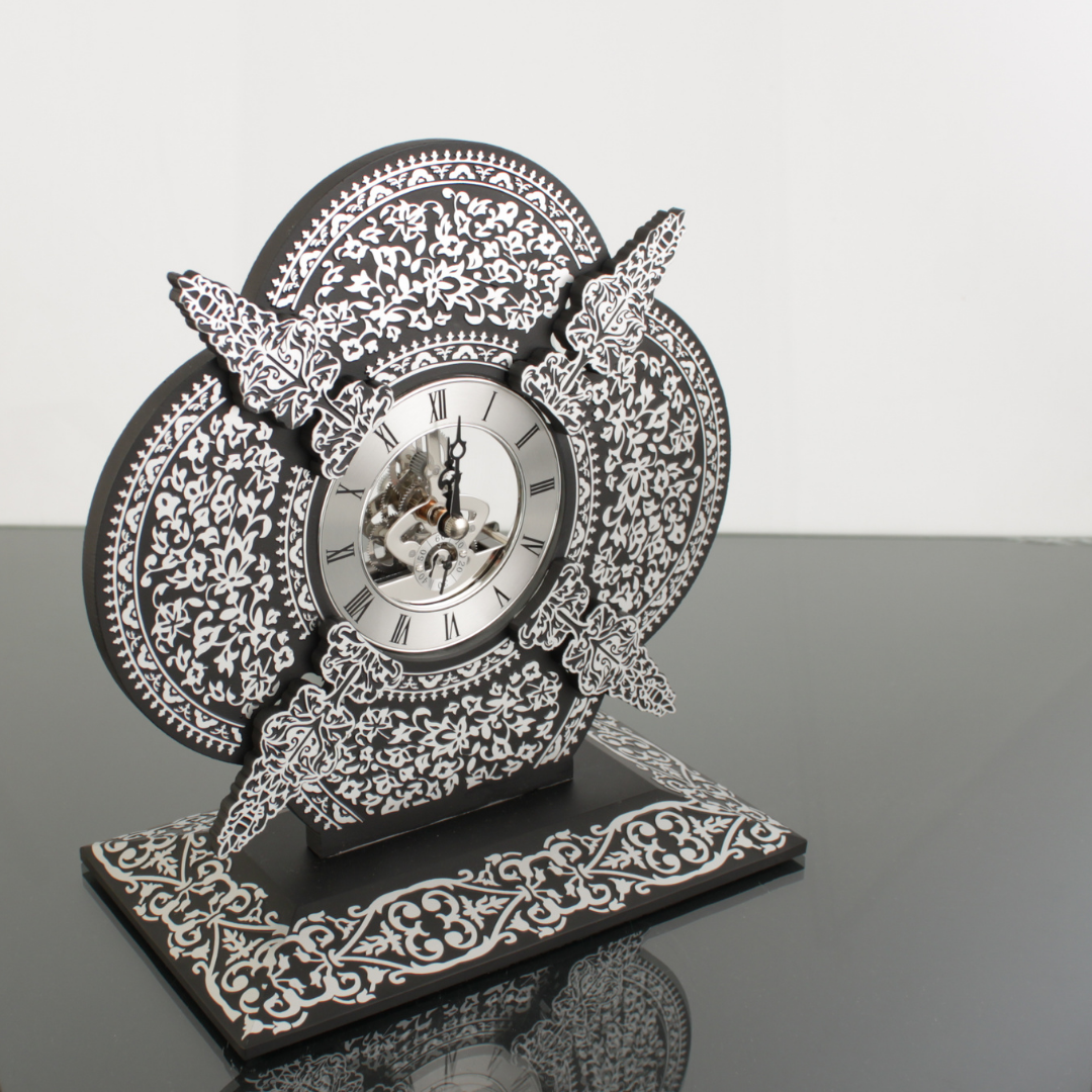Camın kesimi, birleştirilmesi ve desen uygulamaları ustaların el işçiliğiyle tek tek yapılır. Tezyînî desen dili; rûmî, hatâyî ve geometrik motifleri çağdaş bir kompozisyonda bir araya getirir. Ortaya çıkan form, hem işlevsel bir masaüstü saat hem de ofis atmosferini yukarı çeken dekoratif bir parça olarak konumlanır.